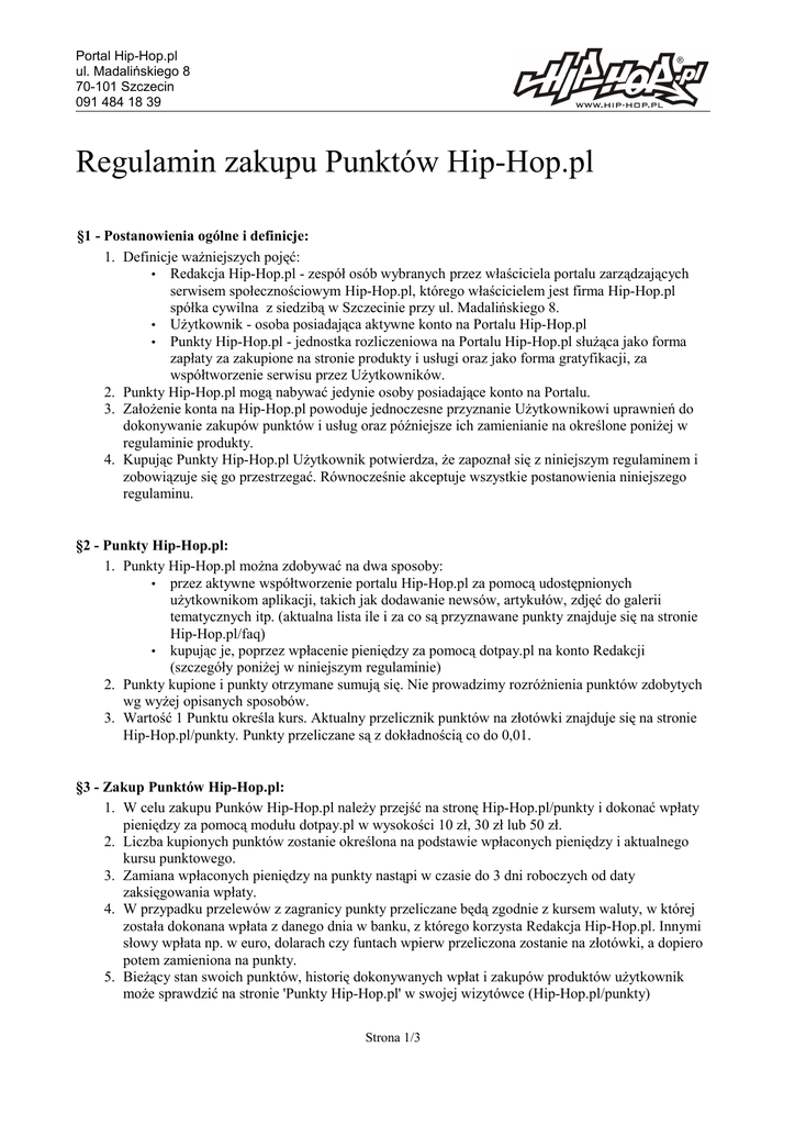 Portal Hip-Hop.pl ul. Madalińskiego 8 70-101 Szczecin 091 484 18 39 Regulamin zakupu Punktów Hip-Hop.pl §1 - Postanowienia ogólne i definicje: 1. Definicje ważniejszych pojęć: • Redakcja Hip-Hop.pl - zespół osób wybranych przez właściciela portalu zarządzających serwisem społecznościowym Hip-Hop.pl, którego właścicielem jest firma Hip-Hop.pl spółka cywilna z siedzibą w Szczecinie przy ul. Madalińskiego 8. • Użytkownik - osoba posiadająca aktywne konto na Portalu Hip-Hop.pl • Punkty Hip-Hop.pl - jednostka rozliczeniowa na Portalu Hip-Hop.pl służąca jako forma zapłaty za zakupione na stronie produkty i usługi oraz jako forma gratyfikacji, za współtworzenie serwisu przez Użytkowników. 2. Punkty Hip-Hop.pl mogą nabywać jedynie osoby posiadające konto na Portalu. 3. Założenie konta na Hip-Hop.pl powoduje jednoczesne przyznanie Użytkownikowi uprawnień do dokonywanie zakupów punktów i usług oraz późniejsze ich zamienianie na określone poniżej w regulaminie produkty. 4. Kupując Punkty Hip-Hop.pl Użytkownik potwierdza, że zapoznał się z niniejszym regulaminem i zobowiązuje się go przestrzegać. Równocześnie akceptuje wszystkie postanowienia niniejszego regulaminu. §2 - Punkty Hip-Hop.pl: 1. Punkty Hip-Hop.pl można zdobywać na dwa sposoby: • przez aktywne współtworzenie portalu Hip-Hop.pl za pomocą udostępnionych użytkownikom aplikacji, takich jak dodawanie newsów, artykułów, zdjęć do galerii tematycznych itp. (aktualna lista ile i za co są przyznawane punkty znajduje się na stronie Hip-Hop.pl/faq) • kupując je, poprzez wpłacenie pieniędzy za pomocą dotpay.pl na konto Redakcji (szczegóły poniżej w niniejszym regulaminie) 2. Punkty kupione i punkty otrzymane sumują się. Nie prowadzimy rozróżnienia punktów zdobytych wg wyżej opisanych sposobów. 3. Wartość 1 Punktu określa kurs. Aktualny przelicznik punktów na złotówki znajduje się na stronie Hip-Hop.pl/punkty. Punkty przeliczane są z dokładnością co do 0,01. §3 - Zakup Punktów Hip-Hop.pl: 1. W celu zakupu Punków Hip-Hop.pl należy przejść na stronę Hip-Hop.pl/punkty i dokonać wpłaty pieniędzy za pomocą modułu dotpay.pl w wysokości 10 zł, 30 zł lub 50 zł. 2. Liczba kupionych punktów zostanie określona na podstawie wpłaconych pieniędzy i aktualnego kursu punktowego. 3. Zamiana wpłaconych pieniędzy na punkty nastąpi w czasie do 3 dni roboczych od daty zaksięgowania wpłaty. 4. W przypadku przelewów z zagranicy punkty przeliczane będą zgodnie z kursem waluty, w której została dokonana wpłata z danego dnia w banku, z którego korzysta Redakcja Hip-Hop.pl. Innymi słowy wpłata np. w euro, dolarach czy funtach wpierw przeliczona zostanie na złotówki, a dopiero potem zamieniona na punkty. 5. Bieżący stan swoich punktów, historię dokonywanych wpłat i zakupów produktów użytkownik może sprawdzić na stronie 'Punkty Hip-Hop.pl' w swojej wizytówce (Hip-Hop.pl/punkty) Strona 1/3 Portal Hip-Hop.pl ul. Madalińskiego 8 70-101 Szczecin 091 484 18 39 6. Punkty zakupione na Hip-Hop.pl nie podlegają zwrotowi w formie pieniężnej. 7. Hip-Hop.pl nie odpowiada za opóźnienia lub całkowity brak doładowania punktów w przypadku gdy przelew nie dotrze na nasze konto z przyczyn niezależnych od nas, tj. błędnego wpisania numeru konta przez Użytkownika, braku dostępności do konta bankowego spowodowanego działaniami po stronie banku, niemożności identyfikacji przelewu dokonanego przez Użytkownika w celu powiązania go z jego kontem na Hip-Hop.pl oraz innych zdarzeń losowych. 8. Złamanie jakiegokolwiek z regulaminów na Hip-Hop.pl wiąże się z zablokowaniem konta. Konsekwencją takiego zablokowania jest dodatkowo przyznanie ujemnych punktów. W przypadku, gdy dany użytkownik zakupi punkty, a potem złamie regulamin i otrzyma bana, redakcja Hip-Hop.pl nie będzie zwracać punków utraconych w takich okolicznościach. Zasady przyznawania banów regulują Regulamin dodawania wypowiedzi na Forum oraz zasady korzystania z Hip-Hop.pl spisane na stronie Hip-Hop.pl/faq. §4 - Reklamacje: 1. Użytkownik może złożyć reklamacje zakupu punktów w przypadku gdy upłynął termin określony w regulaminie od daty zaksięgowania wpłaty, a stan jego punktów nie został zaktualizowany. 2. Reklamacje przyjmowane będą tylko i wyłącznie za pomocą specjalnego formularza znajdującego się na stronie Hip-Hop.pl/punkty (w edycji wizytówki, opcja 'Punkty Hip-Hop.pl'). Reklamacje złożone w innej formie nie będą rozpatrywane. 3. W celu złożenia reklamacji należy przejść na wyżej wymienioną podstronę i skorzystać z opcji 'Reklamacje'. Wiąże się to z wypełnieniem formularza, w którym należy podać przyczynę zgłaszanej reklamacji. 4. Użytkownik może złożyć reklamacje zakupu punktów w okresie do 1 roku od daty dokonania wpłaty. 5. Hip-Hop.pl rozpatruje reklamacje w terminie 10 dni roboczych od otrzymania reklamacji, przy czym okres ten może zostać przedłużony, w przypadku gdy rozpoznanie reklamacji wymaga wyjaśnień od Użytkownika lub osób i stron trzecich odpowiedzialnych za dokonanie transakcji a niezależnych do Hip-Hop.pl. 6. Hip-Hop.pl zastrzega, że rozpatrzenie reklamacji może wymagać uzyskania dodatkowych wyjaśnień od Użytkownika - czas udzielania wyjaśnień przez Użytkownika przedłuża okres rozpoznania reklamacji. 7. O postanowieniach związanych z reklamacją, o przedłużeniu terminu reklamacji, o konieczności złożenia dodatkowych wyjaśnień, albo o odmowie uwzględnienia reklamacji Hip-Hop.pl poinformuje Użytkownika za pomocą pola korespondencji na stronie 'Punkty Hip-Hop.pl' (HipHop.pl/punkty) bądź też, w szczególnych wypadkach, za pomocą Prywatnych Wiadomości. §5 - Wykorzystane Punktów Hip-Hop.pl: 1. Posiadanie Punktów Hip-Hop.pl upoważnia do zakupu: • plików mp3 • produktów w sklepie internetowym działającym pod adresem http://sklep.hip-hop.pl • bil