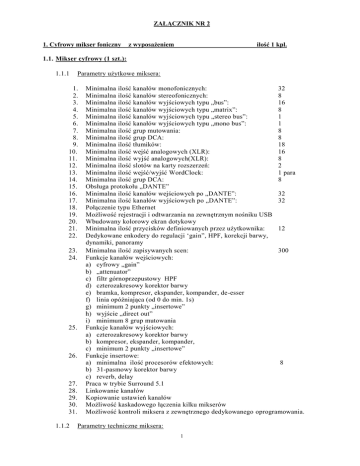 ZAŁĄCZNIK NR 2 1. Cyfrowy mikser foniczny z wyposażeniem ilość 1 kpl. 1.1. Mikser cyfrowy (1 szt.): 1.1.1 Parametry użytkowe miksera: 1. 2. 3. 4. 5. 6. 7. 8. 9. 10. 11. 12. 13. 14. 15. 16. 17. 18. 19. 20. 21. 22. 23. 24. 25. 26. 27. 28. 29. 30. 31. 1.1.2 Minimalna ilość kanałów monofonicznych: 32 Minimalna ilość kanałów stereofonicznych: 8 Minimalna ilość kanałów wyjściowych typu „bus”: 16 Minimalna ilość kanałów wyjściowych typu „matrix”: 8 Minimalna ilość kanałów wyjściowych typu „stereo bus”: 1 Minimalna ilość kanałów wyjściowych typu „mono bus”: 1 Minimalna ilość grup mutowania: 8 Minimalna ilość grup DCA: 8 Minimalna ilość tłumików: 18 Minimalna ilość wejść analogowych (XLR): 16 Minimalna ilość wyjść analogowych(XLR): 8 Minimalna ilość slotów na karty rozszerzeń: 2 Minimalna ilość wejść/wyjść WordClock: 1 para Minimalna ilość grup DCA: 8 Obsługa protokołu „DANTE” Minimalna ilość kanałów wejściowych po „DANTE”: 32 Minimalna ilość kanałów wyjściowych po „DANTE”: 32 Połączenie typu Ethernet Możliwość rejestracji i odtwarzania na zewnętrznym nośniku USB Wbudowany kolorowy ekran dotykowy Minimalna ilość przycisków definiowanych przez użytkownika: 12 Dedykowane enkodery do regulacji ‘gain”, HPF, korekcji barwy, dynamiki, panoramy Minimalna ilość zapisywanych scen: 300 Funkcje kanałów wejściowych: a) cyfrowy „gain” b) „attenuator” c) filtr górnoprzepustowy HPF d) czterozakresowy korektor barwy e) bramka, kompresor, ekspander, kompander, de-esser f) linia opóźniająca (od 0 do min. 1s) g) minimum 2 punkty „insertowe” h) wyjście „direct out” i) minimum 8 grup mutowania Funkcje kanałów wyjściowych: a) czterozakresowy korektor barwy b) kompresor, ekspander, kompander, c) minimum 2 punkty „insertowe” Funkcje insertowe: a) minimalna ilość procesorów efektowych: 8 b) 31-pasmowy korektor barwy c) reverb, delay Praca w trybie Surround 5.1 Linkowanie kanałów Kopiowanie ustawień kanałów Możliwość kaskadowego łączenia kilku mikserów Możliwość kontroli miksera z zewnętrznego dedykowanego oprogramowania. Parametry techniczne miksera: 1 1. 2. 3. 4. 5. 6. 7. 8. 9. 10. Częstotliwości próbkowania: Maksymalne opóźnienie przetwarzania: Minimalna długość tłumików: Typ tłumików: Maksymalne zniekształcania harmoniczne: Minimalny zakres dynamiki: Pasmo przenoszenia: Minimalny odstęp sygnału od szumu: Maksymalny poziom przesłuchów: Napięcie zasilania: 44,1 kHz, 48 kHz 2,5ms (dla 48 kHz) 100mm motoryzowane <0,05% w paśmie 20 Hz – 20 kHz 108 dB 20 Hz – 20 kHz +/- 1,5dB -128 dBu -100dB 230V/50Hz 1.2 Zewnętrzny przetwornik AD-DA: 1.2.1 Parametry użytkowe przetwornika: 1. 2. 3. 4. 5. 1.2.2 (1 szt.): Minimalna ilość wejść analogowych: 16 Minimalna ilość wyjść analogowych: 8 Typ wejść i wyjść analogowych: XLR Regulowany cyfrowo „gain” Komunikacja z mikserem w oparciu o protokół „DANTE” Parametry techniczne przetwornika: 1. Częstotliwości próbkowania: 2. Maksymalne opóźnienie przetwarzania sygnału: 3. Maksymalne zniekształcania harmoniczne: 4. 5. 6. 7. 8. Minimalny zakres dynamiki: Pasmo przenoszenia: Maksymalny poziom przesłuchów: Napięcie zasilania: Obudowa: 1.3 Skrzynia transportowa miksera: 1.3.1 (1 szt.) Parametry techniczne: 1. 2. 3. 4. 5. 6. Skrzynia typu „case” Górna pokrywa demontowana. Zamykane miejsce na okablowanie w tylnej części kufra, tzw. domek. Koła transportowe zainstalowane w pokrywie Minimum cztery uchwyty transportowe. Możliwość pracy miksera bez zdejmowania podstawy skrzyni 1.4 Skrzynia transportowa przetwornika: 1.4.1 44,1 kHz, 48 kHz, 88,2 KHz, 96 kHz 3ms <0,05% w paśmie 20 Hz – 20 kHz 108 dB 20 Hz – 20 kHz +/- 1,5dB -100dB 230V/50Hz rack, 19” (1 szt.): Parametry techniczne: 1. Skrzynia typu „case” 2. Szerokość skrzyni: 3. Wysokość skrzyni: 4. Głębokość skrzyni: do urządzeń rack 19” minimum 6U dostosowana do przetwornika AD-DA 2 1.5 Dedykowana karta sieciowa dla protokołu „DANTE”: 1.5.1 (1 szt.) Parametry techniczne: 1. Typ karty: 2. Obsługiwany system operacyjny: 3. Ilość portów RJ45: 4. Obsługiwane częstotliwości próbkowania: PCI Express Windows 7, 8 64-bit minimum 2 (1Gbps) 44,1 kHz, 48 kHz, 88,2 KHz, 96 kHz 5. Rozdzielczość: 24-bit 6. Interfejs audio: ASIO 7. Pełna kompatybilność z posiadanym przez Teatr oprogramowaniem Nuendo 6.5, 64-bit 1.6 Dedykowany switch sieciowy dla protokołu „DANTE”: 1.6.1 Parametry techniczne: 1. 2. 3. 4. 1.7 (1 szt.) Obsługiwany protokół: Minimalna ilość portów: Obudowa: Napięcie zasilania: „DANTE” 8 (1Gbps) rack 19” 230V/50Hz Karta rozszerzeń AES/EBU : 1.7.1 (1 szt.) Parametry techniczne: 1. Ilość wejść AES/EBU: 2. Ilość wyjść AES/EBU: 3. Kompatybilność z oferowanym mikserem 4. Częstotliwości próbkowania: 5. Rozdzielczość: 6. Złącze: 2. Przetwornik cyfrowo-analogowy do miksera Yamaha 02R 16 16 44,1 kHz, 48 kHz, 24-bit D-Sub25 ilość 1 szt. 2.1. Parametry techniczne: 1. 2. 3. 4. 5. 6. 7. 8. 9. 10. 11. 12. 13. 14. Przetwornik dedykowany do posiadanej przez Teatr konsolety Yamaha DM2000 Typ przetwornika: cyfrowo-analogowy Minimalna ilość analogowych kanałów wyjściowych: 8 Częstotliwość próbkowania: 44,1kHz; 48kHz; 88kHz 96kHz Maksymalne opóźnienie przetwarzania sygnału: 0,6 ms Zakres częstotliwości: 20Hz-20kHz /-3dB Minimalny zakres dynamiki: 110dB Minimalny odstęp sygnału od szumu: -90dB Maksymalny poziom przesłuchów: -70dB Zasilanie: 230V/50Hz Obudowa: rack 19” Typ gniazd wyjściowych: XLR Interfejs wejściowy: AES/EBU Typ złącza wejściowego: DSUB25 3 3. Zestaw głośników monitorowych (np. Genelec 8320) ilość 1 kpl. 3.1. Parametry techniczne: 1. Zastosowanie: 2. Ilość głośników w komplecie: 3. Konstrukcja przetworników: 4. Konstrukcja głośnika: 5. Minimalny zakres częstotliwości: 6. Maksymalny RMS: 7. Szumy własne: 8. Zniek