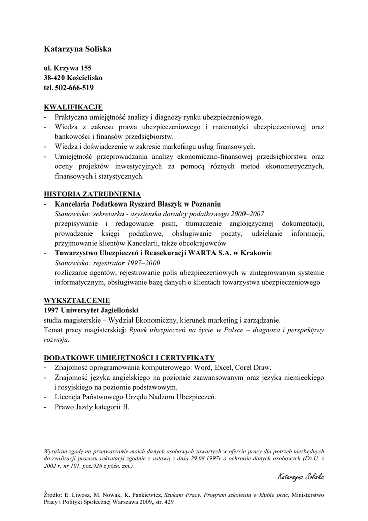 Katarzyna Soliska ul. Krzywa 155 38-420 Kościelisko tel. 502-666-519 KWALIFIKACJE - Praktyczna umiejętność analizy i diagnozy rynku ubezpieczeniowego. - Wiedza z zakresu prawa ubezpieczeniowego i matematyki ubezpieczeniowej oraz bankowości i finansów przedsiębiorstw. - Wiedza i doświadczenie w zakresie marketingu usług finansowych. - Umiejętność przeprowadzania analizy ekonomiczno-finansowej przedsiębiorstwa oraz oceny projektów inwestycyjnych za pomocą różnych metod ekonometrycznych, finansowych i statystycznych. HISTORIA ZATRUDNIENIA - Kancelaria Podatkowa Ryszard Błaszyk w Poznaniu Stanowisko: sekretarka - asystentka doradcy podatkowego 2000–2007 przepisywanie i redagowanie pism, tłumaczenie anglojęzycznej dokumentacji, prowadzenie księgi podatkowe, obsługiwanie poczty, udzielanie informacji, przyjmowanie klientów Kancelarii, także obcokrajowców - Towarzystwo Ubezpieczeń i Reasekuracji WARTA S.A. w Krakowie Stanowisko: rejestrator 1997–2000 rozliczanie agentów, rejestrowanie polis ubezpieczeniowych w zintegrowanym systemie informatycznym, obsługiwanie bazę danych o klientach towarzystwa ubezpieczeniowego WYKSZTAŁCENIE 1997 Uniwersytet Jagielloński studia magisterskie – Wydział Ekonomiczny, kierunek marketing i zarządzanie. Temat pracy magisterskiej: Rynek ubezpieczeń na życie w Polsce – diagnoza i perspektywy rozwoju. DODATKOWE UMIEJĘTNOŚCI I CERTYFIKATY - Znajomość oprogramowania komputerowego: Word, Excel, Corel Draw. - Znajomość języka angielskiego na poziomie zaawansowanym oraz języka niemieckiego i rosyjskiego na poziomie podstawowym. - Licencja Państwowego Urzędu Nadzoru Ubezpieczeń. - Prawo Jazdy kategorii B. Wyrażam zgodę na przetwarzanie moich danych osobowych zawartych w ofercie pracy dla potrzeb niezbędnych do realizacji procesu rekrutacji zgodnie z ustawą z dnia 29.08.1997r o ochronie danych osobowych (Dz.U. z 2002 r. nr 101, poz.926 z późn. zm.) Katarzyna Soliska Źródło: E. Liwosz, M. Nowak, K. Pankiewicz, Szukam Pracy. Program szkolenia w klubie prac, Ministerstwo Pracy i Polityki Społecznej Warszawa 2009, str. 429