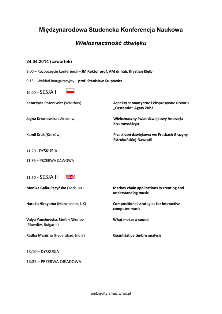 Międzynarodowa Studencka Konferencja Naukowa Wieloznaczność dźwięku 24.04.2014 (czwartek) 9:00 – Rozpoczęcie konferencji – JM Rektor prof. AM dr hab. Krystian Kiełb 9:15 – Wykład inauguracyjny – prof. Stanisław Krupowicz 10:00 – SESJA I Katarzyna Poterewicz (Wrocław) Aspekty semantyczne i ekspresywne utworu „Cascando’’ Agaty Zubel Jagna Krzanowska (Wrocław) Wieloznaczny świat dźwiękowy Andrzeja Krzanowskiego Kamil Kruk (Kraków) Przestrzeń dźwiękowa we Freskach Grażyny Pstrokońskiej-Nawratil 11:20 - DYSKUSJA 11:35 – PRZERWA KAWOWA 11:50 – SESJA II Monika Gałła-Pecyńska (York, UK) Markov chain applications in creating and understanding music Haruka Hirayama (Manchester, UK) Compositional strategies for interactive computer music Valya Yanchovska, Stefan Nikolov (Płowdiw, Bułgaria) What makes a sound Radha Manisha (Hyderabad, Indie) Quantitative timbre analysis 13:10 – DYSKUSJA 13:25 – PRZERWA OBIADOWA ambiguity.amuz.wroc.pl 15:00 - SESJA III Valerio Velardo (Huddersfield, UK) The sound/music dilemma: why all music is sound but only some sounds are music Alla Subbotniaya (Gandawa, Belgia) The phenomenon of sound for John Cage Andżelika Jędrzejczyk (Kraków) Silence in the music on the basis of musical creativity and theoretical considerations of John Cage Mirjana Batinić (Koper, Slovenia) The role of the sound in creating time and space in moving images (within the example of an artwork of Fiona Tan) 16:00 – DYSKUSJA 16:15 – PRZERWA KAWOWA 16:30 – SESJA IV / Dominika Micał (Kraków) Can sound evoke the spiritual? Jonathan Harvey’s Mortuos Plango, Vivos Voco, Passion and Resurrection and Curve with Plateaux Katarzyna Bartos (Wrocław) When the ambiguous light meets the ambiguous music Katarzyna Trzeciak (Warszawa) Hot violin and sweet major third 17:30 – DYSKUSJA 19:00 – KONCERT ambiguity.amuz.wroc.pl 25.04.2014 (PIĄTEK) 10:00 – SESJA V Łukasz Kaczmarek (Lublin) Związki muzyki z malarstwem w dziełach Modesta Musorgskiego (Obrazki z wystawy), Enrique Granadosa (Goyescas), Mieczysława Karłowicza (Stanisław i Anna Oświecimowie) I Piotra Mossa (Cinq tableaux de Caspar David Friedrich) Beniamin Głuszek (Wrocław) Wieloznaczność w w wieloznaczności Agnieszka Kosmecka (Poznań) Autonomizacja, atomizacja i alienacja. Kakofonia dźwięków i chaos libretta retoryce i retoryka 11:20 – DYSKUSJA 11:35 – PRZERWA KAWOWA 11:50 - SESJA VI Ewa Fabiańska-Jelińska (Poznań) Od ‘techniki rozbijania początku’ do nieustannego poszukiwania nowego brzmienia i jego głębi. Preludium do twórczości Artura Kroschela. Weronika Nowak (Poznań) Rola i znaczenie brzmienia w twórczości Elżbiety Sikory Marta Beszterda (Poznań) Dzieło muzyczne jako głos kompozytora w dyskusji społeczno-politycznej na przykładzie „Symfonii polskiej” Krzysztofa Meyera 12:50 – DYSKUSJA 13:15– ZAKOŃCZENIE KONFERENCJI ambiguity.amuz.wroc.pl