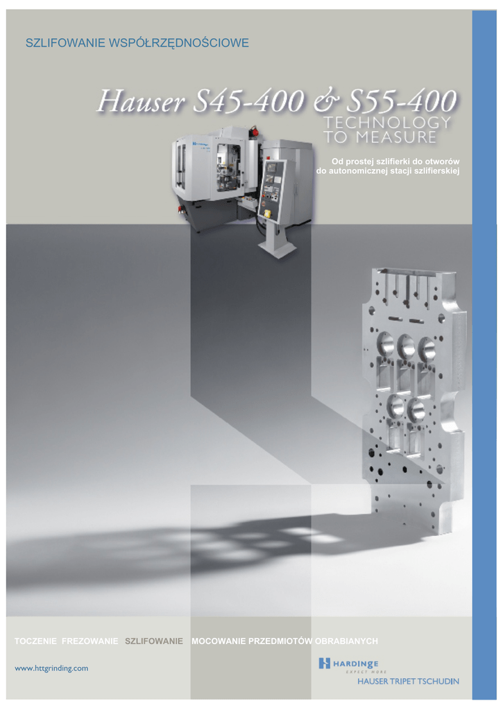 SZLIFOWANIE WSPÓ£RZÊDNOŒCIOWE Od prostej szlifierki do otworów do autonomicznej stacji szlifierskiej TOCZENIE FREZOWANIE SZLIFOWANIE www.httgrinding.com MOCOWANIE PRZEDMIOTÓW OBRABIANYCH Szlifierki wspó³rzêdnoœciowe Hauser S45-400 & S55-400 Podstawowe wymagania wysokiej dok³adnoœci • Solidne, odporne na odkszta³cenia modu³y • Konsekwentny uk³ad z uwzglêdnieniem stabilnoœci cieplnej • Prowadnice œlizgowe tam gdzie jest to wymagane • Prowadnice liniowe tam gdzie jest to mo¿liwe • Napêdy osi w osi tarcia • Optymalnie usytuowane uk³ady pomiarowe odpowiednio do techniki pomiaru • Absolutnie g³adki ruch nawrotny “M¹dry” uk³ad sterowania CNC Jeœli ceni¹ sobie Pañstwo przyjazne dla u¿ytkownika programowanie w technice menu i jednoczeœnie korzyœci programowania ISO/DIN, to wybór obrabiarki HAUSER jest w³aœciwy. Na bazie uk³adu sterowania GE-Fanuc 16 M opracowaliœmy oprogramowanie cykli (HAUSER SOFTWARE CYCLES), dziêki czemu uk³ad sterowania spe³nia wszystkie wymagania specyficzne dla szlifowania wspó³rzêdnoœciowego. Ni¿ej wymienione oprogramowanie u¿ytkowe HAUSER z wspomaganiem programowania w technice menu stoi do Pañstwa dyspozycji: • Cykl szlifowania otworu U, szlifowanie planetarne G100 • Cykl szlifowania otworu U, szlifowanie przerywane G120 • Cykl szlifowania kontury X-Y G140 • Cykl szlifowania kieszeni G160 • Cykl szlifowania wystêpów (mo¿liwy tylko z osi¹ W) G105 • MSS assistance do kalibracji œciernicy (Mo¿liwy tylko z MSS) G190/G195 • Wspomaganie cyklu obci¹gania (mo¿liwe tylko z cyklem obci¹gania) G 185 SZLIFOWANIE WSPÓ£RZÊDNOŒCIOWE £atwa i optymalna rozbudowa Pañstwa szlifierkê wspó³rzêdnoœciow¹ HAUSER S45-400/S55-400 mo¿na op³acalnie zautomatyzowaæ. Ni¿ej wymienione rozszerzenia s¹ najbardziej przydatne: • Automatyczny zmieniacz narzêdzi ATC z magazynem 12 pozycyjnym, zapewnia automatyczn¹ obróbkê œciernicami od Ø 3 mm do Ø 50 mm (alternatywnie œciernicami od Ø 0,3 mm do Ø 5 mm). • Silnik szlifierski 70 S ATC o ekstremalnie szerokim zakresie zastosowañ od 9'000 min-1 to 70'000 min-1. Ten nowy silnik szlifierski i jego najnowoczeœniejsza konstrukcja jest niezbêdny do optymalnej eksploatacji zmieniacza œciernic. • Wzorzec pomiarowy do automatycznego najlepszego ustalenia przedmiotów obrabianych i sporz¹dzenia protoko³ów pomiarowych. • MSS – system wielosensorowy do automatycznej eliminacji “szlifowania powietrza” oraz do automatycznej kalibracji œciernic. • Przyrz¹d o obci¹gania CBN z napêdem HF, do kondycjonowania (obci¹gania) œciernic CBN ze spoiwem ceramicznym i ¿ywicznym. • System HI-CUT, do zastosowañ z oleju szlifierskiego jako œrodka smarnego lub ch³odz¹cego. • Automatyczny zmieniacz palet. Komunikacja miêdzy maszyn¹ a zmieniaczem za pomoc¹ zwyk³ej funkcji M, lub w postaci rozwi¹zania inteligentnego do adaptacyjnej administracji prac¹ poza maszyn¹. Szlifierki wspó³rzêdnoœciowe Hauser S45-400 & S55-400 Dane techniczne S45-400 S55-400 700 x 500 mm 1’300 x 800 mm 500 mm 0 - 600 mm 635 mm 0 - 750 mm 750 mm 230 mm 360 mm 16° 970 mm 230 mm 360 mm 16° 770 x 630 mm 1’440 x 860 mm 14 mm 500 kg 14 mm 800 kg (1’500 kg) 0 - 1’800 mm/min 0 - 4’000 mm/min 1’150 mm/min 0 - 1’800 mm/min 0 - 4’000 mm/min 1’150 mm/min 100 mm 100 mm 4’500 - 80’000 min-1 100’000 + 160’000 min-1 4’500 - 80’000 min-1 100’000 + 160’000 min-1 5 - 300 min-1 do 20 min-1 5 - 300 min-1 do 20 min-1 V min. 0,500 mm/min V min. 0,500 mm/min V max. 14’000 mm/min max. 5 Hz max. 130 mm do 5,5 mm V max. 14’000 mm/min max. 5 Hz max. 170 mm do 5,5 mm Przestrzeñ robocza Zakres przesuwów w osiach X, Y Przesuw pionowy g³owicy szlifierskiej (W) Przelot miêdzy silnikiem szlifierskim (45S) a sto³em Przelot miêdzy kolumnami Œrednica szlifowania (œciernic¹ Ø100 mm): - bez p³yty wysiêgnika, maks. - z p³yt¹ wysiêgnika, maks. Szlifowanie sto¿ków, k¹t rozwarcia (zbie¿ny i rozbie¿ny), maks. Stó³ Powierzchnia robocza Szerokoœæ rowków teowych Dopuszczalne obci¹¿enie (opcjonalnie), maks. Posuwy Stó³ i sanie poprzeczne X, Y: - posuwy robocze - prêdkoœæ przesuwów Sanie pionowe W Wrzeciono szlifierskie Œrednica tulei wrzeciona Maszyna jest przygotowana do pracy z nastêpuj¹cymi prêdkoœciami obrotowymi wrzeciona szlifierskiego: - Silniki szlifierskie, z regulacj¹ bezstopniow¹, programowalne - Turbiny szlifierskie, z regulacj¹ do Prêdkoœæ obrotów planetarnych; Oœ C: - Tryb planetarny; regulacja bezstopniowa; programowalna - Tryb nad¹¿ny; Serwonapêd AC Prêdkoœæ ruchu posuwisto-zwrotnego; Oœ Z: - ruch posuwisto - zwrotny przemienny, regulacja bezstopniowa - Czêstotliwoœæ ruchu posuwisto - zwrotnego - D³ugoœæ skoku Z, regulacja bezstopniowa Precyzyjny dosuw promieniowy; Oœ U Zastrzega siê mo¿liwoœæ zmiany wszystkich charakterystyk technicznych bez powiadomienia HTT Hauser Tripet Tschudin Ltd. Längfeldweg 107 CH-2500 Biel-Bienne 8 Phone +41 (0)32 344 11 52 Fax +41 (0)32 341 13 93 www.htt.httgrinding.com [email protected] MEF.tech AG Representative Office in Poland ul. Villardczyków 8 m 61 02-793 Warszawa Tel./Fax.: 0-22 446 13 08 E-mail: [email protected] www.mef.ch