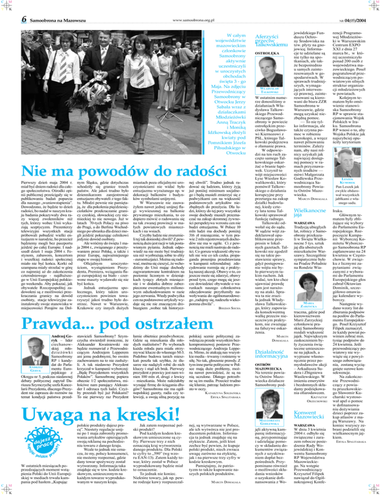 C M C M Y K Y K C M Y K 6 Samoobrona na Mazowszu www.samoobrona.org.pl NR W całym województwie mazowieckim członkowie Samoobrony aktywnie uczestniczyli w uroczystych obchodach święta 3 - go Maja. Na zdjęciu Przewodniczący Samoobrony w Otwocku Jerzy Sabała wraz z działaczkami Młodzieżówki Anną Traczyk i Moniką Idźkowską złożyli kwiaty pod Pomnikiem Józefa Piłsudskiego w Otwocku Nie ma powodów do radości Pierwszy dzień maja 2004 r. miał być dniem radości dla całego społeczeństwa. Ośrodki opinii publicznej prześcigały się w publikowaniu badań poparcia dla naszego „wuniowstapienia”. Dowodzono, że będzie to dzień radości, bo nadal w naszym kraju badania pokazywały dwa razy więcej zwolenników niż tych, którzy wobec Unii wykazują sceptycyzm. Prezenterzy telewizyjni wszystkich stacji próbowali pobudzić wielki entuzjazm w narodzie, bo przecież będziemy mogli bez paszportu jeździć po całej Europie. I nadszedł dzień 1 maja 2004 r. Festynom, zabawom, koncertom i wszelkiej radości społecznej miało nie być końca. Korki od szampana miały strzelać w górę co najmniej aż do zakończenia czterodniowego - najdłuższego w Unii Europejskiej polskiego weekendu. Aby pokazać, jak obywatele Rzeczpospolitej zadowoleni są z możliwości przekraczania granicy na dowód osobisty, stacje telewizyjne zainstalowały swoje stanowiska w miejscowości Porajów na Dol- nym Śląsku, gdzie dotychczas schodziły się granice trzech państw. Ale jakoś trudno było dziennikarzom zarejestrować entuzjazm obywateli z tego faktu. Młodzi pewnie nie pamiętają, że dla pokolenia pięćdziesięciolatków przekraczanie granicy czeskiej, słowackiej czy niemieckiej to nic nowego. Już w latach 70-tych Polacy na piwo do Pragi, a do Berlina Wschodniego po ubranka dla dzieci mogli jeździć pokazując celnikowi jedynie dowód osobisty. Ale wróćmy do święta 1 maja 2004 r., związanego z przeżywaniem przez Polskę, a także i przez Europę, najważniejszego etapu w swojej historii. Oficjalnym uroczystościom, wystąpieniom Prezydenta, Premiera, wciąganiu flagi europejskiej na biało - czerwone maszty wydawało się nie być końca. Jednak entuzjazmu społecznego, który takim uroczystościom powinien towarzyszyć jakoś trudno było dostrzec. Nawet w Warszawie, Krakowie czy innych dużych miastach poza oficjalnymi uroczystościami nie widać było entuzjazmu wyrażanego np. w dekoracji balkonów i budynków symbolami unijnymi. W Warszawie nie zauważyłem nawet jednej unijnej flagi wywieszonej na balkonie prywatnego mieszkania, to co dopiero mówić o radowaniu się na tak zwanej prowincji w małych powiatowych miasteczkach i na wsiach. Czyżby ludzie nie zrozumieli tej tak doniosłej chwili? Z pewnością dużo jest racji w tak postawionym pytaniu. Jednak odpowiedź na nie może być trudniejsza niż wyobrażają sobie to elity - euroentuzjaści. Można się radować, można się cieszyć, że wchodzimy do Unii mając dochody zagwarantowane kontraktem na poziomie liczonym w dziesiątkach tysięcy złotych miesięcznie i w dodatku dobrze zabezpieczone ewentualnym milionowym odszkodowaniem w razie jego zerwania. Wtedy podwyżka cen na podstawowe artykuły wydaje się nic nie znaczącym drobiazgiem „wobec tak historycz- nej chwili”. Trudno jednak radować się ludziom, którzy żyją już poniżej minimum socjalnego i będą musieli zmierzyć się z podwyżkami cen na większość podstawowych artykułów niezbędnych do przeżycia. Dla ludzi, którzy do tej pory wszystkie swoje dochody musieli przeznaczać na zakup skromnej żywności perspektywa wzrostu cen nie budzi entuzjazmu. W Polsce 10 mln ludzi ma dochody poniżej 316 zł miesięcznie, w tym prawie 2 mln rejestrowanych dochodów nie ma w ogóle. Ci z pewnością nie mieli nastroju do radości. Co gorsza większość obywateli nie wie co ich czeka. propaganda prounijna przedstawiana w kampanii referendalnej zdecydowanie rozmija się z praktyką naszej akcesji. Obawy o to, co jeszcze może się zdarzyć, obawy przed tym, czego mogą się jeszcze dowiedzieć obywatele o warunkach naszego członkostwa zdecydowanie przytłumiły nawoływania do ogólnonarodowego „radujmy się, nadeszła wiekopomna chwila” . BOGDAN SOCHA Prawda... pod ostrzałem Andrzej Geryk – lider ciechanowskiej młod z i e ż ów k i Samoobrony RP i kandydat do ParlaA NDRZEJ mentu EuroGERYK pejskiego z Okręgu nr 5, podczas niedawnej debaty politycznej zapytał Dariusza Szymczychę szefa Kancelarii Prezydenta, dlaczego Prezydent nie zaprasza do rozmów na temat kondycji państwa przed- stawicieli Samoobrony? Szymczycha stwierdził ironicznie, że Aleksander Kwaśniewski nie będzie rozmawiał z Przewodniczącym Andrzejem Lepperem ani jemu podobnymi, bo swoim zachowaniem na to nie zasłużyli. A tak niedawno Prezydent krzyczał w kampanii wyborczej: „Będę Prezydentem wszystkich Polaków”. Samoobronę popiera obecnie 1/2 społeczeństwa, miłościwe nam panujący Aleksander I odrzuca tych ludzi. Czyżby przestali być już Polakami? To nie pierwszy raz Prezydent łamie obietnice przedwyborcze. Gdzie są mieszkania dla młodych małżeństw? Po wyborach każda młoda para miała otrzymywać klucze do własnego M-3. Podobno budowa tanich mieszkań poszła tak szybko, że ślusarze nie nadążyli robić do nich kluczy i stąd ich brak. Pierwszy prezydent z prawicy jest nam winien 100 mln zł, drugi z lewicy – mieszkania. Może należałoby wynająć firmę do ściągania długów? Samoobrona nie ma ogólnopolskiej gazety, radia czy telewizji, a swoją silną pozycję na Uwaga na kreski! C M Y K W ostatnich miesiącach poprzedzających moment wstąpienia Polski do Unii Europejskiej w mediach trwała kampania pod hasłem „Kupując polskie produkty dajesz pracę”. Niestety regulacje unijne po 1 maja zabroniły promowania artykułów opierających swoją reklamę na pochodzeniu towaru z danego kraju. Wcale to jednak nie oznacza, 