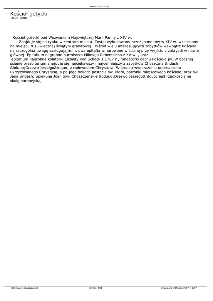 www.choszczno.pl Kościół gotycki 18.06.2008. Kościół gotycki pod Wezwaniem Najświętszej Marii Panny z XIV w. Znajduje się na rynku w centrum miasta. Został wybudowany przez joannitów w XIV w. wzniesiony na miejscu XIII-wiecznej świątyni granitowej. Wśród wielu interesujących zabytków wewnątrz kościoła na szczególną uwagę zasługują m.in. dwa epitafia wmurowane w ścianę przy wyjściu z zakrystii w nawie głównej: Epitafium nagrobne burmistrza Mikołaja Rebentischa z XV w. , oraz epitafium nagrobne kolatorki Elżbiety von Schack z 1787 r., fundatorki dachu kościoła jw.,W bocznej ścianie prezbiterium znajduje się najciekawszy i najcenniejszy z zabytków Choszczna – „Drzewo Jessego” z rodowodem Chrystusa. W środku wyobrażenia umieszczono ukrzyżowanego Chrystusa, a po jego bokach postacie św. Marii, patronki miejscowego kościoła, oraz św. Jana – opiekuna Joanitów. Choszczeńskie „Drzewo Jessego” jest rzadkością na skalę europejską. http://www.choszczno.pl Kreator PDF Utworzono 3 March, 2017, 19:07