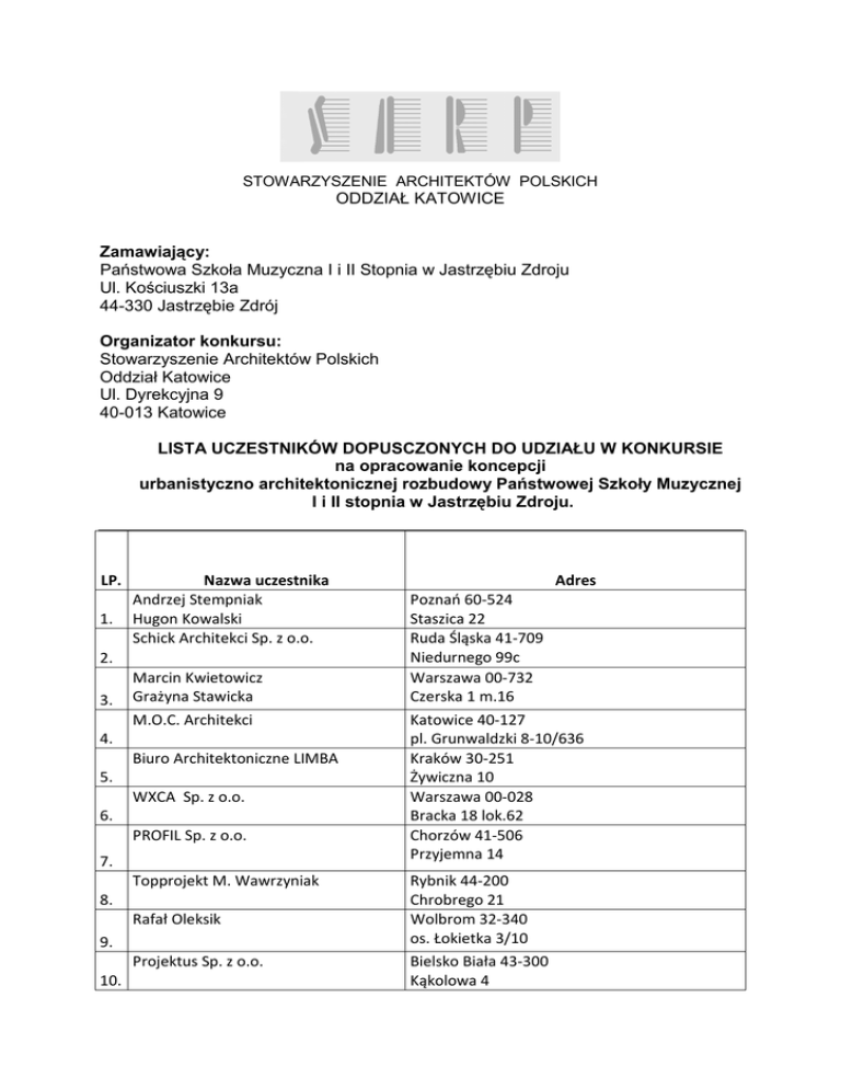 STOWARZYSZENIE ARCHITEKTÓW POLSKICH ODDZIAŁ KATOWICE Zamawiający: Państwowa Szkoła Muzyczna I i II Stopnia w Jastrzębiu Zdroju Ul. Kościuszki 13a 44-330 Jastrzębie Zdrój Organizator konkursu: Stowarzyszenie Architektów Polskich Oddział Katowice Ul. Dyrekcyjna 9 40-013 Katowice LISTA UCZESTNIKÓW DOPUSCZONYCH DO UDZIAŁU W KONKURSIE na opracowanie koncepcji urbanistyczno architektonicznej rozbudowy Państwowej Szkoły Muzycznej I i II stopnia w Jastrzębiu Zdroju. LP. 1. Nazwa uczestnika Andrzej Stempniak Hugon Kowalski Schick Architekci Sp. z o.o. 2. 3. Marcin Kwietowicz Grażyna Stawicka M.O.C. Architekci 4. Biuro Architektoniczne LIMBA 5. WXCA Sp. z o.o. 6. PROFIL Sp. z o.o. 7. Topprojekt M. Wawrzyniak 8. Rafał Oleksik 9. Projektus Sp. z o.o. 10. Adres Poznań 60-524 Staszica 22 Ruda Śląska 41-709 Niedurnego 99c Warszawa 00-732 Czerska 1 m.16 Katowice 40-127 pl. Grunwaldzki 8-10/636 Kraków 30-251 Żywiczna 10 Warszawa 00-028 Bracka 18 lok.62 Chorzów 41-506 Przyjemna 14 Rybnik 44-200 Chrobrego 21 Wolbrom 32-340 os. Łokietka 3/10 Bielsko Biała 43-300 Kąkolowa 4 Małgorzata Gilarska 11. Domino Grupa Architektoniczna 12. 2G STUDIO W. Gwizdak 13. Hausmann i Partnerzy 14. Architekton S.C. Architektura Maciejewski Artur 15. Lucyna Łubowska 16. Lewicki Łatak Sp z o.o 17. Barysz Point Line 18. Bogdan Szwajnoch 19. Studio Archi5 Sp. z o.o. 20. Maria Słota-Puda 21. Riegler Riewe Architekci Sp. z o.o. 22. FestGrupa Sp. z o.o. 23. Kozień Architekci S.C. 24. Henle Wischer und Partner 25. Architekci Sp z o.o. LS Plan Architekci Adam Lambert 26. MSA Sp z o.o. S.k. 27. DD Architekci DDDesign Group LTD 28. Marcin Kamiński 29. Bartosz Bojarowicz S.C. Stabil Sp. z o.o. 30. Partycja Okuljar 31. Małgorzata Zmysłowska Warszawa 02-122 Sierpińskiego 1a/109 Szczecin 71-140 Mickiewicza 118/5 Kielce 25-371 Prosta 15/19 Piła 64-920 Podchorążych 1 Bydgoszcz 85-165 Tucholska 3/70 Gdańsk 80-284 Zamenhofa 18/3 Kraków 31-124 Dolnych Młynów 7/7 Tychy 43-100 Norwida 56 Zabrze 41-809 Morciszka 11 Kraków 31-128 Przybyszewskiego 32 Opole 45-796 Szymanowskiego 5/2 Katowice 40-040 Powstańców ? Warszawa 00-697 al.. Jerozolimskie 47/2a Kraków 30-701 Zabłocie 25/19 Wrocław 50-441 Kościuszki 82/14 Łódź 90-312 pl.Zwycięstwa 2 Warszawa 03-914 Saska72 lok. 4 Kielce Matejki 2 410 Laval House TW8OGL Londyn Katowice Francuska 35/37 Kielce 25-317 Niska 5/21 Katowice M.skłodowskiej-Curie 30/7 Mullerstr 44 Zurich Szwajcaria Kopenhagerstr. 14 10437 Berlin Niemcy Atelier Loegler Sp. z o.o. 32. PPFP Architekci Sp.z o.o. 33. Dorota Żurek 34. Kraków 30-023 Mazowiecka 84 Warszawa 00-241 Długa 44/50 Katowice 40-161 Korfantego 40/8 Atelier PS S.C. Katowice 40-056 Jordana 10/8 Jacek Świtalski Szklarska Poręba 58-580 1 Maja 44a Katowice 40-153 Korfantego 191 paw A Wrocław 53-325 gen. Hallera 33/5 Rybnik 44-273 Raciborska 256 Wrocław 50-153 Kraińskiego 3/25 Prusa 100/5 35. 36. SLAS 37. Paweł Spychała 38. Marek Koczy Architektura 39. JASTAA Zuzanna Róg 40. Paweł Osmak ENONE Architektura i Design 41. SIM Architekci Sp. z o.o. Sp.k. 42. PPA podczaszy Pracownia Architektury Sp. z o.o. Sp. 43. k. SAR Sp. z o.o. 44. STUDIO OTWARTE MIASTO 45. FRANTA&FRANTA Architekci Sp. z o.o. 46. ARPA Architektoniczna Pracownia 47. Autorska Jerzego Gurawskiego OPEN ARCHITEKCI Sp. z o.o. 48. GOWIN&SIUTA SP. J. 49. R3D3 PRACOWNIA ARCHITEKTONICZNA GRZEGORZ 50. ZIĘTEK BARTOSZ WARZECHA STUDIO 51. MTWW Architekci Sp. z o.o. Sp. k. 52. Pabianice 95-200 Mokra 20/22 m.59 Gdańsk80-255 Topolowa 8/9 lok.2 30-003 Kraków ul. Lubelska 24/7 40-009 Katowice ul. Warszawska 17/5 40-058 Katowice ul. Rymera 3/7 41-501 Chorzów Aleja Różana 6 /WPKiW/ 61-606 Poznań ul. Maciejewskiego 7 02-613 Warszawa ul. Pilicka 27 lok. 1 31-127 Kraków ul. Kochanowskiego 19/6A 81-392 Gdynia ul. Żwirki i Wigury 3/5 76-024 Świeszyno Niekłonice 48 31-131 Kraków ul. Garbarska 5/5 Pniewski Architekci Sp. o.o. 53. 81-389 Gdynia ul. Świętojańska 79/3 LISTA UCZESTNIKÓW NIE DOPUSCZONYCH DO UDZIAŁU W KONKURSIE na opracowanie koncepcji urbanistyczno architektonicznej rozbudowy Państwowej Szkoły Muzycznej I i II stopnia w Jastrzębiu Zdroju. LP. 1. 2. Nazwa uczestnika Jan Skąpski OXXO Projektowanie Architektoniczne Maria Zubek Bjerg Arkitektur Polska Sp. z o.o. 3. Nowe Biuro S.C., K. Kałużny 4. Adres Kraków31-052 Dajwór 3/1 Katowice 40-057 PCK 2/4 00-358 Warszawa ul. Ordynacka 14/13 Katowice 40-593 Boczna 2/12 Katowice 40-709 Panewnicka 11a/22