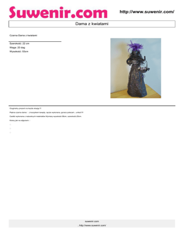 http://www.suwenir.com/ Dama z kwiatami Czarna Dama z kwiatami Szerokość: 22 cm Waga: 20 dag Wysokość: 53cm Oryginalny prezent na kazda okazję !!! Piękna czarna dama z koszykiem lawędy, ręczie wykonana, goraco polecam , unikat !!!! Caołść wykonana z naturalnych materiałów.Wymiary wysokość-58cm, szerokość-25cm. Kolory jak na zdjęciach. suwenir.com , http://www.suwenir.com/ http://www.suwenir.com/ suwenir.com , http://www.suwenir.com/