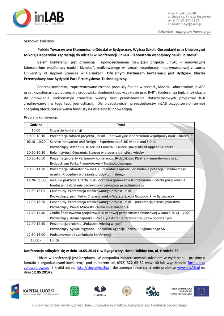 Szanowni Państwo Polskie Towarzystwo Ekonomiczne Oddział w Bydgoszczy, Wyższa Szkoła Gospodarki oraz Uniwersytet Mikołaja Kopernika zapraszają do udziału w konferencji „inLAB – laboratoria współpracy nauki i biznesu”. Celem konferencji jest promocja i upowszechnienie rozwiązań projektu „inLAB – innowacyjne laboratorium współpracy nauki i biznesu”, realizowanego w ramach współpracy międzynarodowej z Laurea Universtity of Applied Sciences w Helsinkach. Oficjalnym Partnerem konferencji jest Bydgoski Klaster Przemysłowy oraz Bydgoski Park Przemysłowo-Technologiczny. Podczas konferencji zaprezentowane zostaną produkty finalne w postaci „Modelu Laboratorium inLAB” oraz „Kwestionariusza potencjału środowiska akademickiego w zakresie prac B+R”. Konferencja będzie też okazją do omówienia problematyki transferu wiedzy oraz przedstawienia dotychczasowych projektów B+R zrealizowanych w tego typu jednostkach. Dla przedstawicieli przedsiębiorstw inLAB przygotowało również specjalną ofertę pozyskiwania funduszy na działalność innowacyjną. Program konferencji: Godzina 10:00 Tytuł Otwarcie konferencji 10:00-10:10 Prezentacja założeń projektu „inLAB – Innowacyjne laboratorium współpracy nauki i biznesu” 10:10- 10:20 Service Innovation and Design – Experiences of LbD Model and SIDlab Prowadzący: Antonius De Arruda Camara – Laurea University of Applied Sciences 10:20-10:30 Rola Instytucji Otoczenia Biznesu w procesie transferu wiedzy 10:30-10:50 Prezentacja oferty Partnerów Konferencji: Bydgoskiego Klastra Przemysłowego oraz Bydgoskiego Parku Przemysłowo – Technologicznego. 10:50-11:20 Prezentacja Laboratoriów inLAB. Prezentacja aplikacji do badania potencjału badawczego uczelni. Procedury wdrażania produktu finalnego 11:20- 11:50 inLAB w praktyce: Oferta inLAB oraz funkcjonowanie laboratorium – oferta pozyskiwania funduszy na działania badawczo – rozwojowe przedsiębiorstw. 11:50-12:05 Case study: Prezentacja zrealizowanego projektu B+R Prowadzący: prof. Feliks Chwarścianek – Wyższa Szkoła Gospodarki w Bydgoszczy 12:05-12:20 Case study: Prezentacja zrealizowanego projektu B+R – prezentacja przedsiębiorstwa Prowadzący: Paweł Milewski - Airon Investment S.A 12:20-12:40 Źródła finansowania projektów B+R w nowej perspektywie finansowej w latach 2014 – 2020 Prowadzący: Adam Szponka – Z-ca Dyrektora Departamentu Spraw Społecznych 12:40-12:50 Prezentacja projektu „Połączeni wiedzą więcej” Prowadzący: Sylwia Zygmont - Toruńska Agencja Rozwoju Regionalnego SA 12:50-13:00 Podsumowanie i zamknięcie konferencji 13:00 - Lunch Konferencja odbędzie się w dniu 14.05.2014 r. w Bydgoszczy, Hotel Holiday Inn, ul. Grodzka 36. Udział w konferencji jest bezpłatny. W przypadku zainteresowania udziałem w wydarzeniu, prosimy o kontakt z organizatorami konferencji pod numerem tel. (052) 322 65 52 wew. 40 lub wypełnienie formularza zgłoszeniowego ( krótki adres: http://tiny.pl/qn2gx ) dostępnego także na stronie projektu: www.inLAB.pl do dnia 12.05.2014 r.
