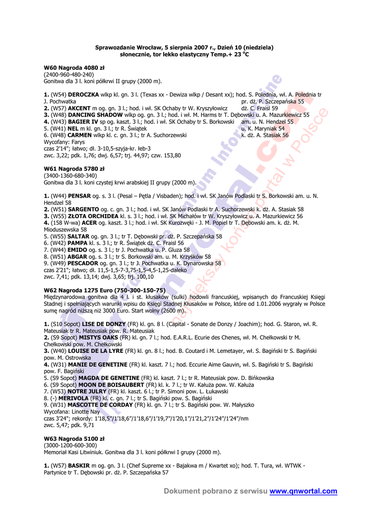 Sprawozdanie Wrocław, 5 sierpnia 2007 r., Dzień 10 (niedziela) słonecznie, tor lekko elastyczny Temp.+ 23 oC W60 Nagroda 4080 zł (2400-960-480-240) Gonitwa dla 3 l. koni półkrwi II grupy (2000 m). 1. (W54) DEROCZKA wlkp kl. gn. 3 l. (Texas xx - Dewiza wlkp / Desant xx); hod. S. Polednia, wł. A. Polednia tr J. Pochwatka pr. dŜ. P. Szczepańska 55 2. (W57) AKCENT m og. gn. 3 l.; hod. i wł. SK Ochaby tr W. Kryszyłowicz dŜ. C. Fraisl 59 3. (W48) DANCING SHADOW wlkp og. gn. 3 l.; hod. i wł. M. Harms tr T. Dębowski u. A. Mazurkiewicz 55 4. (W43) BAGIER IV sp og. kaszt. 3 l.; hod. i wł. SK Ochaby tr S. Borkowski am. u. N. Hendzel 55 5. (W41) NEL m kl. gn. 3 l.; tr R. Świątek u. K. Maryniak 54 6. (W48) CARMEN wlkp kl. c. gn. 3 l.; tr A. Suchorzewski k. dŜ. A. Stasiak 56 Wycofany: Farys czas 2’14"; łatwo; dł. 3-10,5-szyja-kr. łeb-3 zwc. 3,22; pdk. 1,76; dwj. 6,57; trj. 44,97; czw. 153,80 W61 Nagroda 5780 zł (3400-1360-680-340) Gonitwa dla 3 l. koni czystej krwi arabskiej II grupy (2000 m). 1. (W44) PENSAR og. s. 3 l. (Pesal – Pętla / Visbaden); hod. i wł. SK Janów Podlaski tr S. Borkowski am. u. N. Hendzel 58 2. (W51) SARGENTO og. c. gn. 3 l.; hod. i wł. SK Janów Podlaski tr A. Suchorzewski k. dŜ. A. Stasiak 58 3. (W55) ZŁOTA ORCHIDEA kl. s. 3 l.; hod. i wł. SK Michałów tr W. Kryszyłowicz u. A. Mazurkiewicz 56 4. (158 W-wa) ACER og. kaszt. 3 l.; hod. i wł. SK Kurozwęki - J. M. Popiel tr T. Dębowski am. k. dŜ. M. Mioduszewska 58 5. (W55) SALTAR og. gn. 3 l.; tr T. Dębowski pr. dŜ. P. Szczepańska 58 6. (W42) PAMPA kl. s. 3 l.; tr R. Świątek dŜ. C. Fraisl 56 7. (W44) EMIDO og. s. 3 l.; tr J. Pochwatka u. P. Gluza 58 8. (W51) ABGAR og. s. 3 l.; tr S. Borkowski am. u. M. Krzyśków 58 9. (W49) PESCADOR og. gn. 3 l.; tr J. Pochwatka u. K. Dynarowska 58 czas 2’21"; łatwo; dł. 11,5-1,5-7-3,75-1,5-4,5-1,25-daleko zwc. 7,41; pdk. 13,14; dwj. 3,65; trj. 100,10 W62 Nagroda 1275 Euro (750-300-150-75) Międzynarodowa gonitwa dla 4 l. i st. kłusaków (sulki) hodowli francuskiej, wpisanych do Francuskiej Księgi Stadnej i spełniających warunki wpisu do Księgi Stadnej Kłusaków w Polsce, które od 1.01.2006 wygrały w Polsce sumę nagród niŜszą niŜ 3000 Euro. Start wolny (2600 m). 1. (S10 Sopot) LISE DE DONZY (FR) kl. gn. 8 l. (Capital - Sonate de Donzy / Joachim); hod. G. Staron, wł. R. Mateusiak tr R. Mateusiak pow. R. Mateusiak 2. (S9 Sopot) MISTYS OAKS (FR) kl. gn. 7 l.; hod. E.A.R.L. Ecurie des Chenes, wł. M. Chełkowski tr M. Chełkowski pow. M. Chełkowski 3. (W40) LOUISE DE LA LYRE (FR) kl. gn. 8 l.; hod. B. Coutard i M. Lemetayer, wł. S. Bagiński tr S. Bagiński pow. M. Ostrowska 4. (W31) MANIE DE GENETINE (FR) kl. kaszt. 7 l.; hod. Eccurie Aime Gauvin, wł. S. Bagiński tr S. Bagiński pow. F. Bagiński 5. (S9 Sopot) MAGDA DE GENETINE (FR) kl. kaszt. 7 l.; tr R. Mateusiak pow. D. Bińkowska 6. (S9 Sopot) MOON DE BOISAUBERT (FR) kl. k. 7 l.; tr W. KałuŜa pow. W. KałuŜa 7. (W53) NOTRE JULRY (FR) kl. kaszt. 6 l.; tr P. Simoni pow. L. Łukawski 8. (-) MERIVOLA (FR) kl. c. gn. 7 l.; tr S. Bagiński pow. S. Bagiński 9. (W31) MASCOTTE DE CORDAY (FR) kl. gn. 7 l.; tr S. Bagiński pow. W. Małyszko Wycofana: Linotte Nay czas 3’24"; rekordy: 1’18,5”/1’18,6”/1’18,6”/1’19,7”/1’20,1”/1’21,2”/1’24”/1’24”/nm zwc. 5,47; pdk. 9,71 W63 Nagroda 5100 zł (3000-1200-600-300) Memoriał Kasi Litwiniuk. Gonitwa dla 3 l. koni półkrwi I grupy (2000 m). 1. (W57) BASKIR m og. gn. 3 l. (Chef Supreme xx - Bajakwa m / Kwartet xo); hod. T. Tura, wł. WTWK Partynice tr T. Dębowski pr. dŜ. P. Szczepańska 57 Dokument pobrano z serwisu www.qnwortal.com 2. (W56) BARANICA sp kl. sk. gn. 3 l.; hod. SK Rzeczna, wł. WTWK - Partynice tr J. Pochwatka u. A. Mazurkiewicz 54 3. (W56) RACHELA sp kl. gn. 3 l.; hod. i wł. SK Racot tr S. Borkowski am. u. N. Hendzel 55 4. (W54) NOBEL wlkp og. gn. 3 l.; hod. SK Rzeczna, wł. WTWK - Partynice tr W. Kryszyłowicz dŜ. C. Fraisl 59 5. (W54) SKY STAR-R m kl. kaszt. 3 l.; tr R. Świątek u. K. Maryniak 54 6. (W57) CENTAUR sp og. kaszt. 3 l.; tr W. Kryszyłowicz am. k. dŜ. M. Mioduszewska 58 Wycofany: Lord (dod.) czas 2’09"; wysyłany; dł. 2-3,25-1-0,5-4 zwc. 2,45; pdk. 7,84; dwj. 3,72; trj. 77,17; czw. 110,60 Zwroty stawek: Lord W64 Nagroda 3230 zł (1900-760-380-190) Gonitwa dla 3 l. koni półkrwi III grupy. Koni dosiadają wyłącznie uczniowie. Gonitwa zaliczana do Pucharu Amatorów (2000 m). 1. (W46) HARPUN m og. kaszt. 3 l. (Bonaparte m - Hawana m / Lap Bej m); hod. i wł. SK Mieczownica tr W. Kryszyłowicz u. P. Gluza 58 2. (W46) ŁATIN m og. kaszt. 3 l.; hod. i wł. SK Mieczownica tr J. Pochwatka u. K. Dynarowska 58 3. (W38) FERRERO m og. s. 3 l.; hod. D. Lasecki, wł. WTWK-Partynice tr S. Borkowski am. u. N. Hendzel 58 4. (W38) HAKER m og. gn. 3 l.; hod. R. i R. Marzec, wł. J. Procajło tr S. Borkowski am. u. M. Krzyśków 57 5. (W46) SABAT sp og. s. 3 l.; tr R. Świątek u. K. Maryniak 58 Wycofane: WirdŜilla, Balanga czas 2’16"; wysyłany; dł. 6,25-2,5-11-daleko zwc. 6,34; pdk. 5,99; trj. 21,93; czw. 39,50 W65 Nagroda 6970 zł (4100 - 1640 - 820 - 410) Gonitwa dla 3 l. koni czystej krwi arabskiej I grupy (2000 m). 1. (W52) EL MADśILIS kl. gn. 3 l. (Piaff - Elizma / Europejczyk); hod. M. Zaczyńska i J. Mateja, wł. Artur Nicpoń tr T. Dębowski pr. dŜ. P. Szczepańska 56 2. (W59) ELWA kl. gn. 3 l.; hod. i wł. SK Janów Pochwatka tr J. Pochwatka u. D. Szkopek 56 3. (W28) LISSAR og. s. 3 l.; hod. i wł. SK Michałów tr R. Świątek dŜ. C. Fraisl 58 4. (W59) SALERO og. s. 3 l.; hod. i wł. SK Janów Podlaski tr T. Dębowski am. k. dŜ. M. Mioduszewska 58 5. (W59) SOKOŁDA kl. k. 3 l.; tr W. Kryszyłowicz k. dŜ. A. Stasiak 56 6. (W51) EBERT og. gn. 3 l.; tr J. Pochwatka u. K. Dynarowska 58 Wycofana: Windawa czas 2’19"; pewnie; dł. 6-kr. łeb-daleko-3-daleko zwc. 8,40; pdk. 33,50; dwj. 22,63; trj. 186,90; czw. 178,20 W66 Nagroda 4080 zł (2400-960-480-240) Gonitwa dla 3 l. koni p