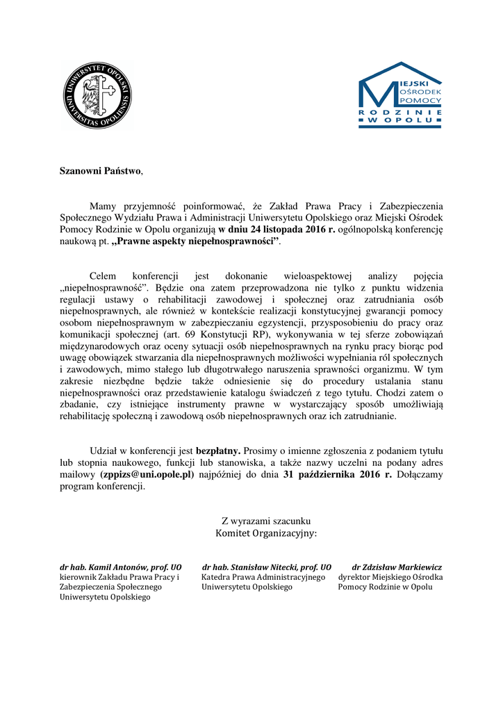 Szanowni Państwo, Mamy przyjemność poinformować, że Zakład Prawa Pracy i Zabezpieczenia Społecznego Wydziału Prawa i Administracji Uniwersytetu Opolskiego oraz Miejski Ośrodek Pomocy Rodzinie w Opolu organizują w dniu 24 listopada 2016 r. ogólnopolską konferencję naukową pt. „Prawne aspekty niepełnosprawności”. Celem konferencji jest dokonanie wieloaspektowej analizy pojęcia „niepełnosprawność”. Będzie ona zatem przeprowadzona nie tylko z punktu widzenia regulacji ustawy o rehabilitacji zawodowej i społecznej oraz zatrudniania osób niepełnosprawnych, ale również w kontekście realizacji konstytucyjnej gwarancji pomocy osobom niepełnosprawnym w zabezpieczaniu egzystencji, przysposobieniu do pracy oraz komunikacji społecznej (art. 69 Konstytucji RP), wykonywania w tej sferze zobowiązań międzynarodowych oraz oceny sytuacji osób niepełnosprawnych na rynku pracy biorąc pod uwagę obowiązek stwarzania dla niepełnosprawnych możliwości wypełniania ról społecznych i zawodowych, mimo stałego lub długotrwałego naruszenia sprawności organizmu. W tym zakresie niezbędne będzie także odniesienie się do procedury ustalania stanu niepełnosprawności oraz przedstawienie katalogu świadczeń z tego tytułu. Chodzi zatem o zbadanie, czy istniejące instrumenty prawne w wystarczający sposób umożliwiają rehabilitację społeczną i zawodową osób niepełnosprawnych oraz ich zatrudnianie. Udział w konferencji jest bezpłatny. Prosimy o imienne zgłoszenia z podaniem tytułu lub stopnia naukowego, funkcji lub stanowiska, a także nazwy uczelni na podany adres mailowy ([email protected]) najpóźniej do dnia 31 października 2016 r. Dołączamy program konferencji. Z wyrazami szacunku Komitet Organizacyjny: dr hab. Kamil Antonów, prof. UO kierownik Zakładu Prawa Pracy i Zabezpieczenia Społecznego Uniwersytetu Opolskiego dr hab. Stanisław Nitecki, prof. UO dr Zdzisław Markiewicz Katedra Prawa Administracyjnego dyrektor Miejskiego Ośrodka Uniwersytetu Opolskiego Pomocy Rodzinie w Opolu Program ogólnopolskiej konferencji naukowej pt. „Prawne aspekty niepełnosprawności” organizowanej przez Zakład Prawa Pracy i Zabezpieczenia Społecznego Uniwersytetu Opolskiego oraz Miejski Ośrodek Pomocy Rodzinie w Opolu 24 listopada 2016 r. Uniwersytet Opolski Wydział Prawa i Administracji ul. Katowicka 87a, Aula 5.18 10:00 otwarcie konferencji 10:20 – 10:40 dr hab. Iwona Sierpowska (Państwowa Wyższa Szkoła Zawodowa im. Witelona w Legnicy), Konstytucja a prawa osoby niepełnosprawnej 10:40 – 11:00 dr Katarzyna Roszewska (Uniwersytet Kardynała Stefana Wyszyńskiego), Realizacja przez Polskę Konwencji ONZ o Prawach Osób Niepełnosprawnych 11:00 – 11:20 prof. UO dr hab. Stanisław Nitecki, Pojęcie niepełnosprawności w polskim systemie prawnym 11:20 – 11:40 dr Elżbieta Maj (Wyższa Szkoła Administracji w Bielsku-Białej), Świadczenia przysługujące osobom niepełnosprawnym 11:40 – 12:20 dyskusja 12:20 – 12:50 przerwa kawowa 12:50 – 13:10 prof. dr hab. Lidia Zacharko (Uniwersytet Śląski), Ochrona praw osób niepełnosprawnych na tle zjawiska prywatyzacji zadań publicznych 13:10 – 13:30 dr hab. Monika Lewandowicz-Machnikowska (Uniwersytet Wrocławski), Ochrona pracy osób niepełnosprawnych 13:30 – 13:50 prof. UO dr hab. Kamil Antonów, Orzekanie o niepełnosprawności a orzekanie o niezdolności do pracy 13:50 – 14:10 dr Zdzisław Markiewicz (Dyrektor Miejskiego Ośrodka Pomocy Rodzinie w Opolu), Osoba niepełnosprawna w superwizji pośredniej 14:10 – 14:50 dyskusja 14:50 – 15:00 zamknięcie konferencji 15:00 obiad