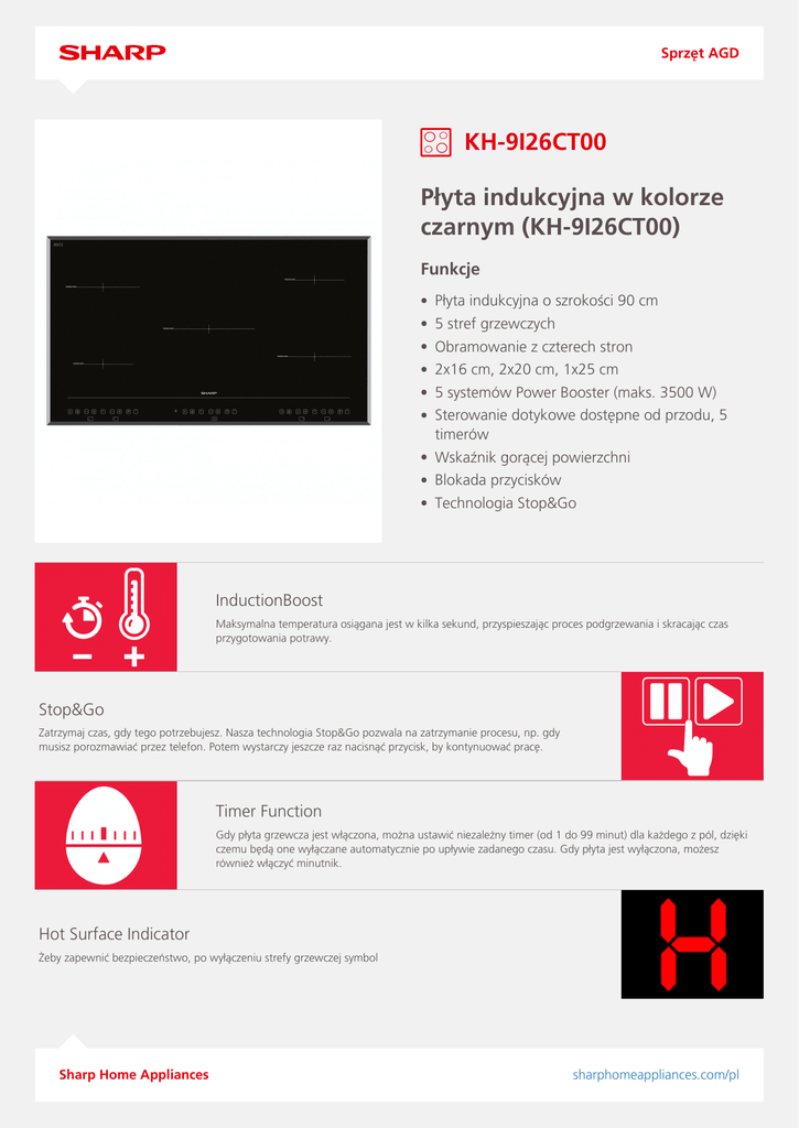 Sprzęt AGD KH-9I26CT00 Płyta indukcyjna w kolorze czarnym (KH-9I26CT00) Funkcje Płyta indukcyjna o szrokości 90 cm 5 stref grzewczych Obramowanie z czterech stron 2x16 cm, 2x20 cm, 1x25 cm 5 systemów Power Booster (maks. 3500 W) Sterowanie dotykowe dostępne od przodu, 5 timerów Wskaźnik gorącej powierzchni Blokada przycisków Technologia Stop&Go InductionBoost Maksymalna temperatura osiągana jest w kilka sekund, przyspieszając proces podgrzewania i skracając czas przygotowania potrawy. Stop&Go Zatrzymaj czas, gdy tego potrzebujesz. Nasza technologia Stop&Go pozwala na zatrzymanie procesu, np. gdy musisz porozmawiać przez telefon. Potem wystarczy jeszcze raz nacisnąć przycisk, by kontynuować pracę. Timer Function Gdy płyta grzewcza jest włączona, można ustawić niezależny timer (od 1 do 99 minut) dla każdego z pól, dzięki czemu będą one wyłączane automatycznie po upływie zadanego czasu. Gdy płyta jest wyłączona, możesz również włączyć minutnik. Hot Surface Indicator Żeby zapewnić bezpieczeństwo, po wyłączeniu strefy grzewczej symbol Sharp Home Appliances sharphomeappliances.com/pl Sprzęt AGD Kluczowe cechy Typ płyty grzewczej Indukcyjna Całkowita moc (kW) 10.8 Typ konstrukcji Do zabudowy Położenie elementów sterujących Z przodu Szerokość (cm) 90 cm Typ sterowania Przyciski dotykowe Strefy gotowania (liczba) 5 Poziomy mocy (liczba) 9 Strefa uniwersalna Nie Rama Nie Wymiary pól (cm) / moc (W) (tryb Boost W) 2 x 16 cm / 1400 W każde (Boost 1800 W)<br>2 x 20 cm / 2100 W każde (Boost 2500 W)<br>1 x 25 cm / 2800 W (Boost 3500 W) Obramowanie Obramowanie z czterech stron Gwarancja (w latach) Dwa lata na części i robociznę Pola z funkcją InductionBoost (liczba) 5 Functions Technologia AutoHeatControl Nie Technologia Stop&Go Tak Timery (liczba) 5 Mocy, zużycia i napięcia Napięcie (V) / częstotliwość (Hz) 220-240V / 50Hz Bezpiecznik źródła zasilania/wyłącznik obwodu (A) 50 Sharp Home Appliances sharphomeappliances.com/pl Sprzęt AGD Wymiary i waga Wymiary komory, sz. x w. x g. (cm) 890 x 56 x 520 Wymiary opakowania (sz. x w. x g.) mm 926 x 142 x 581 Wymiary otworu montażowego, sz. x w. x g. (mm) 860 x 490 Masa, kg (netto) 16 Masa, kg (brutto) 17 Safety Czujnik patelni Tak Blokada przycisków Tak Wyłącznik termiczny Tak Funkcja AutoOFF Tak Wskaźnik gorącej powierzchni Tak Zabezpieczenie przed dziećmi Tak Tak (1,1 m) Łopatka do smażenia Tak Wyposażenie Przewód zasilający (m) European article number Kod EAN Sharp Home Appliances Powered by TCPDF (www.tcpdf.org) 4974019872445 sharphomeappliances.com/pl