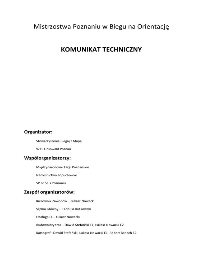 Mistrzostwa Poznaniu w Biegu na Orientację KOMUNIKAT TECHNICZNY Organizator: Stowarzyszenie Biegaj z Mapą WKS Grunwald Poznań Współorganizatorzy: Międzynarodowe Targi Poznańskie Nadleśnictwo Łopuchówko SP nr 51 s Poznaniu Zespół organizatorów: Kierownik Zawodów – Łukasz Nowacki Sędzia Główny – Tadeusz Rutkowski Obsługa IT – Łukasz Nowacki Budowniczy tras – Dawid Stefański E1, Łukasz Nowacki E2 Kartograf –Dawid Stefański, Łukasz Nowacki E1 Robert Banach E2 Etap 1 Sprint 28.06.2014 – Międzynarodowe Targi Poznańskie ul. Głogowska 14 Poznań Program: 14.00 Otwarcie biura zawodów 16.00 Start pierwszego zawodnika 19.00 Otwarcie szkoły Parking: Na terenach okalających MTP, parking darmowy po godzinie 14:00 Centrum Zawodów: Zlokalizowane w holu wschodnim MTP. W centrum dostępne toalety, a także miejsce do przebrania się. Będzie miejsce do pozostawienia rzeczy, jednak organizator nie ponosi za nie odpowiedzialności. Start: Zlokalizowany w holu wschodnim. W środku znajdują się dwa boksy startowe. Rozgrzewkę prosimy przeprowadzać wzdłuż ulicy Głogowskiej. Start interwałowy co 1 minutę. 1 boks – weryfikacja zawodnika 2 boks – oczekiwanie na start i start Kategoria OPEN start w dowolnym momencie między godziną 16:00 – 16:30. Start z puszki startowej!!! Teren: Sprint – jeden z ciekawszych terenów w Poznaniu pod zawody sprinterskie, teren w pełni zurbanizowany, kompleks hal wystawienniczych, teren zamknięty dla ruchu pieszego i samochodowego zewnętrznego. W celu uatrakcyjnienia biegu zostaną dostawione płoty. Mapa: MTP skala 1:4000 e- 2,5m autorzy: Dawid Stefański, Łukasz Nowacki. Aktualizacja czerwiec 2014. Format A4, mapy zabezpieczone przed wilgocią. Budowniczy tras – Dawid Stefański Opisy punktów: Tylko na mapach Limit Czasu: 40 minut Informacje dodatkowe: Podczas zawodów zostaną postawione dodatkowe płoty. Przebiegane przez hale wystawiennicze jest zakazane, poza miejscami zaznaczonymi na mapie. W miejscach newralgicznych będą czuwać sędziowie, aby zawodnicy nie przebiegali przez tereny zakazane lub nie do przejścia pod groźbą dyskwalifikacji. Na terenie zawodów może występować nie wielki ruch samochodowy, prosimy o zachowanie ostrożności. Poniżej zaznaczono symbole, których nie można przekraczać podczas biegu sprinterskiego. Numer Startowe: Wszyscy zawodnicy są zobligowanie do biegania z numerami startowymi, które są do odebrania w biurze zawodów . Brak numer grozi dyskwalifikacją. Parametry Tras: Organizator podjął decyzję o połączeniu następujących kategorii: M16 z 18; M35 z M40; M45 z M 50; K16 z K18, K35 z K40; K45 z K50. Kategoria M-12 M-14 M-18 M-21 M-35 M-45+ OPEN Długość trasy (km) 1,9 2,5 3,1 4,5 3,6 3,2 1,8 Ilość PK Kategoria 16 13 15 22 18 16 16 K-12 K-14 K-18 K-21 K-35 K-45+ Długość trasy (km) 1,9 2,2 2,8 3,7 3,2 2,4 Ilość PK 16 16 13 16 14 15 Uwaga! Trasy mierzone po najkrótszej linii łączącej punkty kontrolne na mapie z uwzględnianiem obieganych obiektów. Etap 2 Skrócony klasyk 29.06.2014 Dziewicza Baza, parking leśny pod Dziewiczą Górą Program: 8:30 Otwarcie biura zawodów 9:30 Start pierwszego zawodnika ( skrócony LONG ) 13.30 Zakończenie zawodów, dekoracja zwycięzców ( czas dekoracji może ulec zmianie ) Parking: W centrum zawodów bezpłatny. Centrum Zawodów: Zlokalizowane w Dziewiczej Bazie ( parking leśny pod Dziewiczą Górą). Dostępne toalety. Będzie możliwość pozostawienia rzeczy, jednak organizator nie ponosi za nie odpowiedzialności. W centrum zawodów będzie otwarty bufet. Start: Oddalony o około 800m od centrum zawodów wyznakowany biało – czerwonymi wstążkami. Na starcie znajdują się dwa boksy startowe. Rozgrzewka możliwa na drodze do startu. Start interwałowy co 2 minuty. 1 boks – weryfikacja zawodnika 2 boks – oczekiwanie na start i start Kategoria OPEN start w dowolnym momencie między godziną 9:30 – 10:15. Start z puszki startowej!!! Teren: Skrócony Klasyk – teren obejmujący Dziewiczą Górę, duża ilość dróg przebieżność od bardzo dobrej do bardzo trudnej, duże przewyższenia. Mapa: Dziewicza Góra III 1:10000 warstwica 2,5 autor: Sławomir Woźniak. Aktualizacja Robert Banach czerwiec 2014 format A4, mapy zabezpieczone przed wilgocią. Opisy punktów kontrolnych: Tylko na mapach Limit czasu: 150 minut Numer startowe: Zawodnicy są zobowiązani do biegania z numerami startowymi. Parametry tras: Organizator podjął decyzję o połączeniu następujących kategorii: M16 z 18; M35 z M40; M45 z M 50; K16 z K18, K35 z K40; K45 z K50. Kategoria M-12 M-14 M-16 18 M-21 M-35 40 M-45+ OPEN Długość trasy (km) 2,7 3,9 5,7 9,1 7,1 5,2 2,5 Ilość PK Kategoria 8 11 16 22 18 12 9 K-12 K-14 K-16 18 K-21 K-35 40 K-45+ Długość trasy (km) 2,7 3,9 4,8 7,4 5,5 4,3 Ilość PK 8 11 13 17 13 12 Uwagi: Zawody zostaną przeprowadzone przy użyciu systemu Sport Ident. Zawody będą przeprowadzone według przepisów Polskiego Związku Orientacji Sportowej. Organizator jest ubezpieczony od odpowiedzialności cywilnej. Organizator nie ponosi kosztów ubezpieczenia cywilnego. Ostateczna interpretacja regulaminu należy do organizatora.
