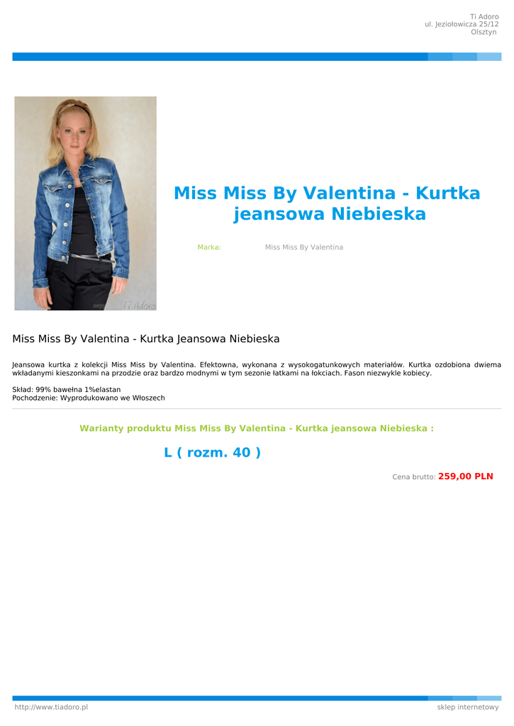 Ti Adoro ul. Jeziołowicza 25/12 Olsztyn Miss Miss By Valentina - Kurtka jeansowa Niebieska Marka: Miss Miss By Valentina Miss Miss By Valentina - Kurtka Jeansowa Niebieska Jeansowa kurtka z kolekcji Miss Miss by Valentina. Efektowna, wykonana z wysokogatunkowych materiałów. Kurtka ozdobiona dwiema wkładanymi kieszonkami na przodzie oraz bardzo modnymi w tym sezonie łatkami na łokciach. Fason niezwykle kobiecy. Skład: 99% bawełna 1%elastan Pochodzenie: Wyprodukowano we Włoszech Warianty produktu Miss Miss By Valentina - Kurtka jeansowa Niebieska : L ( rozm. 40 ) Cena brutto: http://www.tiadoro.pl 259,00 PLN sklep internetowy