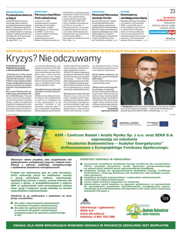 INFRASTRUKTURA MIESZKANIA Przebudowa dworca Pierwszy etap Oliwa Park zakończony w Gdyni Polskie Koleje Państwowe otrzymały unijne wsparcie na przebudowę dworca Gdynia Główna. Całkowita wartość tego przedsięwzięcia to 40,7 mln zł, a dofinansowanie z funduszy unijnych i budżetu państwa wynosi 26,2 mln zł. Prace trwają od sierpnia i mają trwać do maja 2012 r. [PB] Jeszcze 44 z 106 wybudowanych mieszkań pozostało do sprzedaży w Oliwa Park, osiedlu powstającym w Trójmieście od 2008 r. To pierwszy z trzech etapów inwestycji, w której zostanie wybudowanych osiem bloków. W ofercie osiedla są mieszkania o zróżnicowanych metrażach: od 35 mkw. do 112 mkw. oraz apartamenty o powierzchniach około 160 mkw. lub około 200 mkw. Ceny mieszkań zaczynają się od 7,9 tys. zł za mkw., a kończą na 9,3 tys. zł. za mkw., a apartamentów od 10,5 tys. zł za mkw. Zakończenie prac budowlanych jest planowane na IV kwartał 2012 r. Inwestorem osiedla jest firma Euro Styl. [PB] MIESZKANIA FINANSE Mostostal Warszawa Deweloperzy zarabiają coraz więcej zbuduje Verdis Ronson Development wybrał firmę Mostostal Warszawa na generalnego wykonawcę osiedla Verdis na warszawskiej Woli. W I etapie powstaną dwa budynki sześciopiętrowe i jeden siedmiopiętrowy z łącznie 128 mieszkaniami o powierzchni od 42 do 108 mkw. Ceny od 7,5 do 8,5 tys. zł/mkw. [MAS] Najwięksi giełdowi deweloperzy zarobili w III kwartale 2010 r. ponad 192 mln zł, a rok wcześniej mieli 45 mln zł straty. Ronson Development i LC Corp zarobiły prawie trzy razy więcej niż rok wcześniej. Dobrą formę utrzymuje też J. W. Construction (prawie 36 mln zł zysku). [AZA] 23 Co słychać na NewConnect? Notowania, debiuty, ciekawe spółki, w drodze na NC. wtorek 23 XI 2010 ROZMOWA Z KRZYSZTOFEM WIŚNIEWSKIM, DYREKTOREM GENERALNYM MARINE HOTEL W KOŁOBRZEGU Kryzys? Nie odczuwamy Cudzoziemcy coraz chętniej korzystają z oferty polskich hoteli „Puls Biznesu”: Wasz hotel znalazł się na liście obiektów rekomendowanych przez UEFA na turniej Euro 2012. Jedna z piłkarskich drużyn może go wybrać na miejsce pobytu. Czym będziecie kusić? Krzysztof Wiśniewski dyrektor generalny Marine Hotel w Kołobrzegu: Naszym atutem na pewno jest położenie tuż nadmorzem iodważny design, a także awangardowe wnętrza. Pozaluksusową ofertą hotelową wkategorii pięciu gwiazdek mamy również nowoczesne iwpełni wyposażoR E K L A M A ne centrum szkoleniowe, największa sala mieści 400 osób. Mamy też spa i wellness, basen, zewnętrzne jacuzzi, kompleks saun i grotę śnieżną. Uzupełnieniem jest bogata część rozrywkowa, kręgielnia, klub nocny, kawiarnia irestauracja z wyrafinowanym międzynarodowym menu. Odczuliście kryzys, który był udziałem branży hotelarskiej? Obiekt został oddany do użytku wlipcu. Jest condohotelem, co oznacza, że znajdujące się w nim apartamenty są na sprzedaż. Dochody z ich wynajmu wynoszą około 7 proc. w skali roku. Z220, które były dokupienia, pozostało tyl- ko20, wtym dwa naostatnim, szóstym piętrze, zktórych rozciąga się widok na morze. Kryzys? Wnaszym segmencie go raczej nie odczuwamy. Obok hotelu powstaje nasza kolejna inwestycja — Ultra Marina, gdzie będą apartamenty wakacyjne. Większość jest już sprzedana. Zainteresowaniem cieszą się też apartamenty w naszej inwestycji wSzklarskiej Porębie. Dla kogo jest wasza oferta? Staramy się ją tworzyć dla osób w każdym wieku. Przyjeżdżają donas rodziny, ludzie starsi, których przyciąga nasza oferta wellness ispa, atakże pracownicy firm. Przyjeżdżają Polacy i cudzoziemcy, wśród nich Niemcy, a ostat- nio Skandynawowie. Naszą ofertą chcemy zainteresować m.in. Rosjan i Ukraińców. Kiedy będzie wiadomo, czy będziecie gościli drużynę piłkarską? Najprawdopodobniej jesienią przyszłego roku. Mistrzostwa potrwają około miesiąca, co potem? Sezonowość jest specyfiką naszej branży. Ograniczamy ją, dostosowując ceny dopopytu. Mamy promocje weekendowe iświąteczne. Chcemy też przyciągać dobrą kuchnią śródziemnomorską iazjatycką, którą będziemy jeszcze rozwijać. Rozmawiała Agnieszka Zielińska Elastyczny: Sezonowość jest specyfiką naszej branży. Dlatego ceny dostosowujemy do popytu — mówi Krzysztof Wiśniewski, dyrektor generalny Marine Hotel w Kołobrzegu. [FOT. ARC] PB-23259