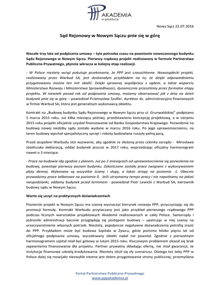 Nowy Sącz 22.07.2016 Sąd Rejonowy w Nowym Sączu pnie się w górę Niecałe trzy lata od podpisania umowy – tyle potrzeba czasu na powstanie nowoczesnego budynku Sądu Rejonowego w Nowym Sączu. Pierwszy rządowy projekt realizowany w formule Partnerstwa Publiczno-Prywatnego, płynnie wkracza w kolejny etap realizacji. - W Polsce niestety wciąż pokutuje przekonanie, że PPP jest czasochłonne. Nowosądecki projekt, realizowany przez Warbud SA, jest doskonałym przykładem na to, że dzięki odpowiedniemu przygotowaniu można ten mit obalid. Dzięki sprawnej współpracy z sądem, a także wsparciu Ministerstwa Rozwoju i Ministerstwa Sprawiedliwości, dynamicznie przeszliśmy przez formalne etapy projektu. W niewiele ponad rok od podpisania umowy, możemy obserwowad jak z dnia na dzieo budynek pnie się w górę – powiedział Przemysław Szulfer, dyrektor ds. administracyjno-finansowych w firmie Warbud SA, która jest generalnym wykonawcą obiektu. Kontrakt na „Budowę budynku Sądu Rejonowego w Nowym Sączu przy ul. Grunwaldzkiej” podpisano 5 marca 2015 roku. Już kilka miesięcy później, przedstawiono koncepcję projektową, a w sierpniu 2015 roku projekt oficjalnie uzyskał finansowanie od Banku Gospodarstwa Krajowego. Pozwolenie na budowę nowej siedziby sądu zostało wydane w marcu 2016 roku. Po jego uprawomocnieniu, na teren budowy wjechał specjalistyczny sprzęt i roboty budowlane ruszyły pełną parą. Przed zespołem Warbudu stoi wyzwanie, aby zgodnie ze złożoną przez członka zarządu - Mirosława Józefczuka deklaracją, oddad budynek jeszcze w 2017 roku, wyprzedzając oficjalny harmonogram nawet o 3 miesiące. - Prace na budowie idą zgodnie z planem. Już po 2 miesiącach od uprawomocnienia się pozwolenia na budowę, powstaje pierwszy poziom budynku. Zakooczone zostały prace związane z wykonywaniem płyty dennej. Wykonane są wszystkie ściany i słupy, a także stropy na poziomie -1. Obecnie prowadzimy prace żelbetowe na poziomie 0. Jeśli utrzymamy tempo pracy i nie napotkamy na jakieś niespodzianki, oddamy budynek przed terminem - powiedział Piotr Lewicki z Warbud SA, kierownik budowy sądu w Nowym Sączu. Warto się uczyć na praktycznych doświadczeniach Pionierski projekt w Nowym Sączu ma szansę wyznaczyd kierunek rozwoju PPP, przyczyniając się do promocji formuły. Kontrakt Warbudu przytaczany jest jako przykład pierwszego rządowego PPP podczas licznych warsztatów projektowych Akademii realizowanych w całej Polsce. Samorządy i jednostki administracji bacznie przyglądają się postępom budowy – upatrując w niej szansy na urzeczywistnienie własnych potrzeb. Niestety, pojedyncze negatywne doświadczenia potrafią zrazid do PPP. Przykładem może byd budowa Szpitala w Żywcu, gdzie pomimo blisko pięciu lat od oficjalnego podpisania umowy, wyczekiwany obiekt nadal nie powstał. Zgodnie z pierwotnym harmonogramem szpital miał byd gotowy w lutym 2015 roku. Kluczowym problemem okazał się brak zapewnienia finansowania dla projektu. Partner prywatny składając ofertę, nie miał gwarancji, że instytucje finansowe udzielą kredytowania. Niestety ziścił się zły scenariusz. Dlatego też żeby PPP w Polsce dalej się rozwijało niezwykle istotne jest dobre przygotowanie strony publicznej, przemyślana Portal Partnerstwa Publiczno-Prywatnego www.pppakademia.pl strategia i profesjonalne wsparcie doradcze, pozwalające m.in. na uzyskanie promesy finansowania od partnera prywatnego. Właśnie taka promesa złożona przez Warbud SA w Nowym Sączu, zagwarantowała domknięcie finansowania projektu, i to w zaledwie kilka miesięcy. - Z naszego punktu widzenia jako przedstawicieli sektora prywatnego ważne jest, aby strona publiczna była odpowiednio przygotowana do przeprowadzenia inwestycji w formule PPP. Uważam, że niezwykle cenne z tej perspektywy, są wszelkie inicjatywy edukacyjne i warsztatowe skierowane do samorządów. Firma Warbud urzeczywistnia to przekonanie, prowadząc Akademię PPP w praktyce, której zadaniem jest promowanie dobrych praktyk i dzielenie się doświadczeniami partnerów, nie tylko z Polski, ale i zagranicy. Naszym marzeniem jest, aby wszystkie projekty PPP w Polsceniezależnie od ich wykonawcy- kooczyły się sukcesem – powiedział Przemysław Szulfer. Zachęcamy do wirtualnej wizyty na placu budowy sądu w Nowym Sączu: http://www.pppakademia.pl/sad-rejonowy-w-nowym-saczu-pnie-sie-w-gore/ Więcej informacji: Klaudia Fotyniuk Akademia PPP +48 536 330 992 [email protected] www.pppakademia.pl Akademia PPP - www.pppakademia.pl Inicjatywa, mająca na celu promocję i edukację formuły Partnerstwa Publiczno-Prywatnego w Polsce. W ramach projektu powstał portal pppakademia.pl, gdzie znajdują się m.in.: informacje na temat PPP, przykłady realizacji projektów PPP, oraz eksperckie komentarze do bieżących wydarzenia związane z PPP. W ramach Akademii PPP cyklicznie organizowane są spotkania z przedstawicielami strony publicznej i prywatnej w celu wymiany wiedzy i doświadczeo. Mecenasem projektu jest firma Warbud SA – jedna z czołowych firm budowlanych w Polsce, generalny wykonawca pierwszego rządowego projektu PPP w Polsce. Portal Partnerstwa Publiczno-Prywatnego www.pppakademia.pl
