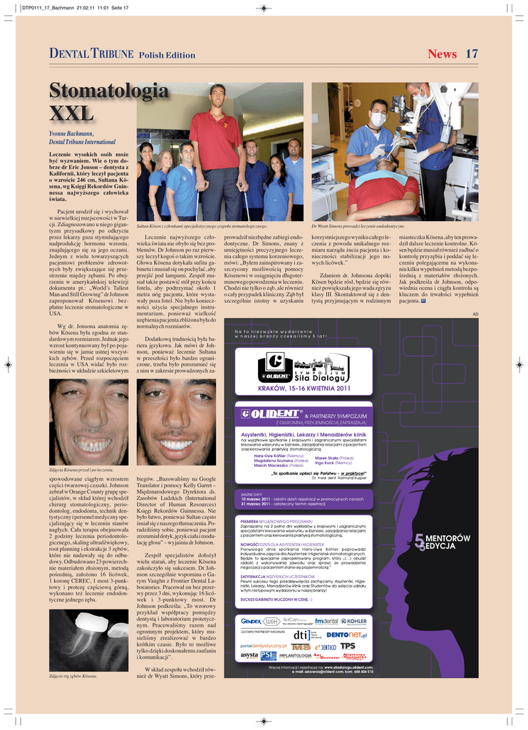 DTP0111_17_Bachmann 21.02.11 11:01 Seite 17 DENTAL TRIBUNE News 17 Polish Edition Stomatologia XXL Yvonne Bachmann, Dental Tribune International Leczenie wysokich osób może być wyzwaniem. Wie o tym dobrze dr Eric Jonson – dentysta z Kalifornii, który leczył pacjenta o wzroście 246 cm, Sultana Kösena, wg Księgi Rekordów Guinnessa najwyższego człowieka świata. Pacjent urodził się i wychował w niewielkiej miejscowości w Turcji. Zdiagnozowano u niego gigantyzm przysadkowy po odkryciu przez lekarzy guza stymulującego nadprodukcję hormonu wzrostu, znajdującego się za jego oczami. Jednym z wielu towarzyszących pacjentowi problemów zdrowotnych były zwiększające się przestrzenie między zębami. Po obejrzeniu w amerykańskiej telewizji dokumentu pt.: „World’s Tallest Man and Still Growing” dr Johnson zaproponował Kösenowi bezpłatne leczenie stomatologiczne w USA. Wg dr. Jonsona anatomia zębów Kösena była zgodna ze standardowym rozmiarem. Jednak jego wzrost kontynuowany był po pojawieniu się w jamie ustnej wszystkich zębów. Przed rozpoczęciem leczenia w USA widać było rozbieżności w układzie szkieletowym Sultan Kösen z członkami specjalistycznego zespołu stomatologicznego. Leczenie najwyższego człowieka świata nie obyło się bez problemów. Dr Johnson po raz pierwszy leczył kogoś o takim wzroście. Głowa Kösena dotykała sufitu gabinetu i musiał się on pochylać, aby przejść pod lampami. Zespół musiał także postawić stół przy końcu fotela, aby podtrzymać około 1 metra nóg pacjenta, które wystawały poza fotel. Nie było konieczności użycia specjalnego instrumentarium, ponieważ wielkość uzębienia pacjenta zbliżona była do normalnych rozmiarów. Dodatkową trudnością była bariera językowa. Jak mówi dr Johnson, ponieważ leczenie Sultana w przeszłości było bardzo ograniczone, trzeba było porozumieć się z nim w zakresie prowadzonych za- Zdjęcia Kösena przed i po leczeniu. spowodowane ciągłym wzrostem części twarzowej czaszki. Johnson zebrał w Orange County grupę specjalistów, w skład której wchodził chirurg stomatologiczny, periodontolog, endodonta, technik dentystyczny i personel medyczny specjalizujący się w leczeniu stanów nagłych. Cała terapia obejmowała 2 godziny leczenia periodontologicznego, skaling ultradźwiękowy, root planning i ekstrakcje 3 zębów, które nie nadawały się do odbudowy. Odbudowano 23 powierzchnie materiałem złożonym, metodą pośrednią, założono 16 licówek, 1 koronę CEREC, 1 most 3-punktowy i protezę częściową górną, wykonano też leczenie endodontyczne jednego zęba. Zdjęcie rtg zębów Kösena. biegów. „Bazowaliśmy na Google Translator i pomocy Kelly Garret – Międznarodowego Dyrektora ds. Zasobów Ludzkich (International Director of Human Resources) Księgi Rekordów Guinnessa. Nie było łatwo, ponieważ Sultan często śmiał się z naszego tłumaczenia. Poradziliśmy sobie, ponieważ pacjent zrozumiał dotyk, język ciała i modulację głosu” – wyjaśnia dr Johnson. Zespół specjalistów dołożył wielu starań, aby leczenie Kösena zakończyło się sukcesem. Dr Johnson szczególnie wspomina o Garym Vaughn z Frontier Dental Laboratories. Pracował on bez przerwy przez 3 dni, wykonując 16 licówek i 3-punktowy most. Dr Johnson podkreśla: „To wzorowy przykład współpracy pomiędzy dentystą i laboratorium protetycznym. Pracowaliśmy razem nad ogromnym projektem, który musieliśmy zrealizować w bardzo krótkim czasie. Było to możliwe tylko dzięki doskonałemu zaufaniu i komunikacji”. W skład zespołu wchodził również dr Wyatt Simons, który prze- prowadził niezbędne zabiegi endodontyczne. Dr Simons, znany z umiejętności precyzyjnego leczenia całego systemu korzeniowego, mówi: „Byłem zainspirowany i zaszczycony możliwością pomocy Kösenowi w osiągnięciu długoterminowego powodzenia w leczeniu. Chodzi nie tylko o ząb, ale również o cały przypadek kliniczny. Ząb był szczególnie istotny w uzyskaniu Dr Wyatt Simons prowadzi leczenie endodontyczne. korzystniejszego wyniku całego leczenia z powodu unikalnego rozmiaru narządu żucia pacjenta i konieczności stabilizacji jego nowych licówek.” Zdaniem dr. Johnsona dopóki Kösen będzie rósł, będzie się również powiększała jego wada zgryzu klasy III. Skontaktował się z dentystą przyjmującym w rodzinnym miasteczku Kösena, aby ten prowadził dalsze leczenie kontrolne. Kösen będzie musiał również zadbać o kontrolę przyzębia i poddać się leczeniu polegającemu na wykonaniu kilku wypełnień metodą bezpośrednią z materiałów złożonych. Jak podkreśla dr Johnson, odpowiednia ocena i ciągła kontrola są kluczem do trwałości wypełnień pacjenta. DT AD