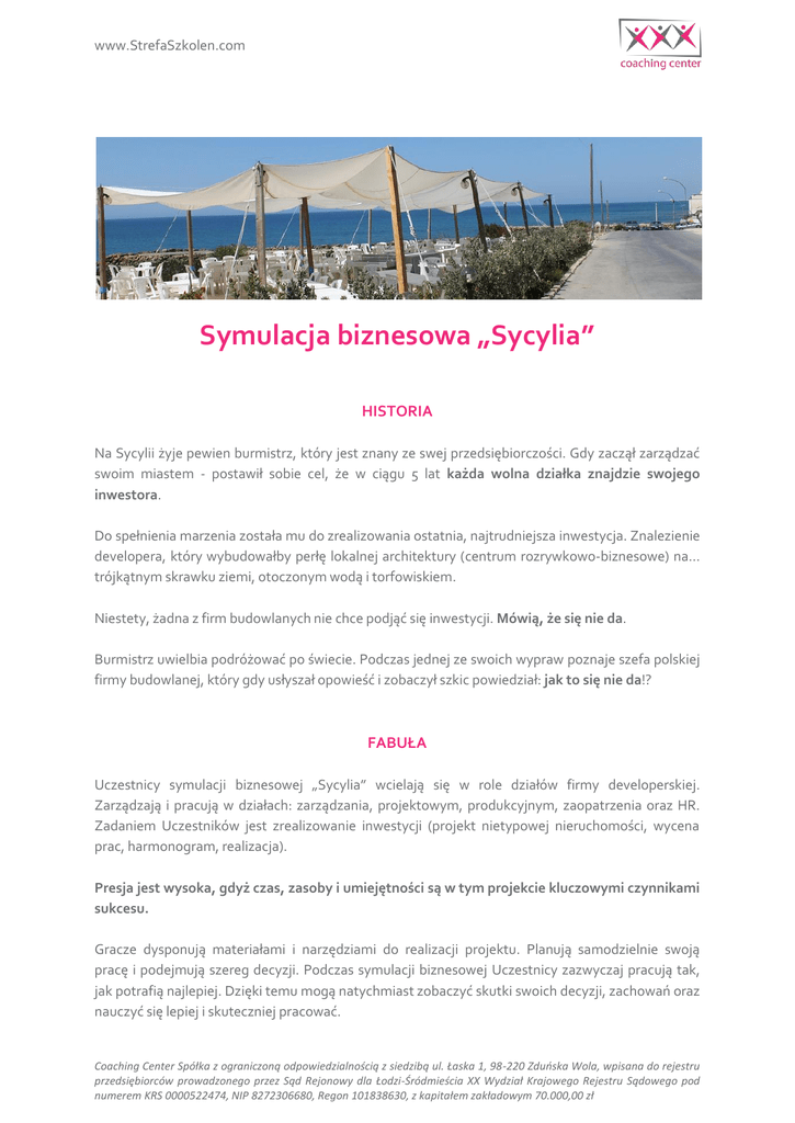 www.StrefaSzkolen.com Symulacja biznesowa „Sycylia” HISTORIA Na Sycylii żyje pewien burmistrz, który jest znany ze swej przedsiębiorczości. Gdy zaczął zarządzać swoim miastem - postawił sobie cel, że w ciągu 5 lat każda wolna działka znajdzie swojego inwestora. Do spełnienia marzenia została mu do zrealizowania ostatnia, najtrudniejsza inwestycja. Znalezienie developera, który wybudowałby perłę lokalnej architektury (centrum rozrywkowo-biznesowe) na... trójkątnym skrawku ziemi, otoczonym wodą i torfowiskiem. Niestety, żadna z firm budowlanych nie chce podjąć się inwestycji. Mówią, że się nie da. Burmistrz uwielbia podróżować po świecie. Podczas jednej ze swoich wypraw poznaje szefa polskiej firmy budowlanej, który gdy usłyszał opowieść i zobaczył szkic powiedział: jak to się nie da!? FABUŁA Uczestnicy symulacji biznesowej „Sycylia” wcielają się w role działów firmy developerskiej. Zarządzają i pracują w działach: zarządzania, projektowym, produkcyjnym, zaopatrzenia oraz HR. Zadaniem Uczestników jest zrealizowanie inwestycji (projekt nietypowej nieruchomości, wycena prac, harmonogram, realizacja). Presja jest wysoka, gdyż czas, zasoby i umiejętności są w tym projekcie kluczowymi czynnikami sukcesu. Gracze dysponują materiałami i narzędziami do realizacji projektu. Planują samodzielnie swoją pracę i podejmują szereg decyzji. Podczas symulacji biznesowej Uczestnicy zazwyczaj pracują tak, jak potrafią najlepiej. Dzięki temu mogą natychmiast zobaczyć skutki swoich decyzji, zachowań oraz nauczyć się lepiej i skuteczniej pracować. Coaching Center Spółka z ograniczoną odpowiedzialnością z siedzibą ul. Łaska 1, 98-220 Zduńska Wola, wpisana do rejestru przedsiębiorców prowadzonego przez Sąd Rejonowy dla Łodzi-Śródmieścia XX Wydział Krajowego Rejestru Sądowego pod numerem KRS 0000522474, NIP 8272306680, Regon 101838630, z kapitałem zakładowym 70.000,00 zł www.StrefaSzkolen.com Symulacja biznesowa „Sycylia” i jej WYJĄTKOWOŚĆ W symulacji biznesowej „Sycylia” jest kilka wyjątkowych elementów, z których jesteśmy dumni. Doceniają to również nasi Klienci: "W pracy mamy identycznie" - tak często mówią Uczestnicy symulacji, gdy odwołujemy się do ich doświadczeń oraz, gdy poszukujemy usprawnień, znakomitą większość wiedzy czerpaliśmy z własnego doświadczenia, Uczestnicy symulacji w czasie jej realizacji bardzo często odwołują się do własnych doświadczeń i sytuacji przenoszonych z ich środowiska biznesowego, każdy z Uczestników kończąc nasze warsztaty wychodzi z konkretnym planem działań do wdrożenia w swój biznes od razu po powrocie ze szkolenia, mocno angażujemy Uczestników w realizację projektu, tworząc wymagające środowisko pracy, bogata informacja zwrotna, która wymaga od Uczestników myślenia, poszukiwania rozwiązań, testowania nowości i dostrzeżenia poprawy własnych umiejętności, Uczestnicy przechodzą pełny cykl zmiany, doświadczając na własnej skórze uczucia zwątpienia, porażki i radości z osiągnięcia wspólnego celu. WYZWANIE dla Uczestników ułożenie strategii działań zmierzających do realizacji głównego celu (m. In. zaprojektowanie nieruchomości, wycena inwestycji, dogadanie się: kto, co, jak, za co odpowiada?), radzenie sobie w stresie, podział obowiązków pomiędzy Uczestników i członków działów, pogodzenie sprzeczności w priorytetach dla poszczególnych działów, odpowiedzialność za wynik całej firmy, planowanie w dłuższej perspektywie, gaszenie „pożarów”. Symulacja biznesowa „Sycylia” i jej ZALETY Współodpowiedzialność, współzależność, empowerment Łańcuch jest tak mocny jak jego najsłabsze ogniwo. Budowanie „ducha zespołu” poprzez współzależność, wokół wspólnego celu to skuteczna taktyka w rozwoju kadr. Symulacja biznesowa „Sycylia” umożliwia wspólną pracę, przy jednym stole, wspólnie realizując wymagający projekt. Każdy czuje presję i odpowiedzialność za wynik. Są emocje, jest zaangażowanie, frustracja, porażka, praca nad słabościami i radość. W trakcie symulacji Uczestnicy pracują tak, jak potrafią najlepiej. Tu nie ma miejsca na fałsz. Uczestnicy sami często podkreślają, że w firmie "mają identycznie". Umiejętności nabyte podczas symulacji - przekładają się bezpośrednio na wzrost ich skuteczności w biznesie. Coaching Center Spółka z ograniczoną odpowiedzialnością z siedzibą ul. Łaska 1, 98-220 Zduńska Wola, wpisana do rejestru przedsiębiorców prowadzonego przez Sąd Rejonowy dla Łodzi-Śródmieścia XX Wydział Krajowego Rejestru Sądowego pod numerem KRS 0000522474, NIP 8272306680, Regon 101838630, z kapitałem zakładowym 70.000,00 zł www.StrefaSzkolen.com Otwarta komunikacja Interaktywna forma warsztatu sprawia, że Uczestnicy muszą się ze sobą komunikować. Uczą się ustalać konkrety (kto, z kim, gdzie, jak i za ile) i pilnować realizacji zadań. Uczą się również trudnej komunikacji - w sytuacjach konfliktowych. Skuteczna współpraca Symulacja w praktyce pokazuje jak ważna jest współpraca dla realizacji wspólnego celu. Uczestnicy zdają sobie z tego sprawę i nauczą się skutecznej współpracy w praktyce. Usprawnianie działań Uczestnicy uświadamiają sobie własne błędy i poszukują usprawnień we własnej pracy. W grupie zastanawiają się jak lepiej pracować. Doświadczeni trenerzy zmuszają do refleksji nad obecnymi problemami lub wyzwaniami w firmie. Uczestnicy znajdują konkretne rozwiązania, które chcą wdrożyć od razu po powrocie ze szkolenia. GRUPA DOCELOWA Symulacja biznesowa „Sycylia” do doskonałe rozwiązanie dla wszystkich osób, niezależnie od zajmowanego stanowiska czy też wykonywanej pracy. Wiedza, narzędzia i metody, z którymi Uczestnicy mają do czynienia w czasie symulacji doskonale nadają się dla: Menedżerów / Kierowników, Specjalistów, Liderów Ze