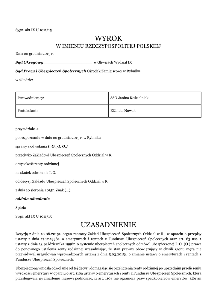 Sygn. akt IX U 1011/15 WYROK W IMIENIU RZECZYPOSPOLITEJ POLSKIEJ Dnia 22 grudnia 2015 r. Sąd Okręgowy___________________ w Gliwicach Wydział IX Sąd Pracy i Ubezpieczeń Społecznych Ośrodek Zamiejscowy w Rybniku w składzie: Przewodniczący: SSO Janina Kościelniak Protokolant: Elżbieta Nowak przy udziale ./. po rozpoznaniu w dniu 22 grudnia 2015 r. w Rybniku sprawy z odwołania I. O. /I. O./ przeciwko Zakładowi Ubezpieczeń Społecznych Oddział w R. o wysokość renty rodzinnej na skutek odwołania I. O. od decyzji Zakładu Ubezpieczeń Społecznych Oddział w R. z dnia 10 sierpnia 2015r. Znak (...) oddala odwołanie Sędzia Sygn. akt IX U 1011/15 UZASADNIENIE Decyzją z dnia 10.08.2015r. organ rentowy Zakład Ubezpieczeń Społecznych Oddział w R., w oparciu o przepisy ustawy z dnia 17.12.1998r. o emeryturach i rentach z Funduszu Ubezpieczeń Społecznych oraz art. 83 ust. 1 ustawy z dnia 13 października 1998r. o systemie ubezpieczeń społecznych odmówił ubezpieczonej I. O. (O.) prawa do ponownego ustalenia renty rodzinnej uzasadniając, że stan prawny obowiązujący w chwili zgonu męża nie przewidywał uregulowań wprowadzonych ustawą z dnia 5.03.2015r. o zmianie ustawy o emeryturach i rentach z Funduszu Ubezpieczeń Społecznych. Ubezpieczona wniosła odwołanie od tej decyzji domagając się przeliczenia renty rodzinnej po uprzednim przeliczeniu wysokości emerytury w oparciu o art. 110a ustawy o emeryturach i renty z Funduszu Ubezpieczeń Społecznych, która przysługiwała jej zmarłemu mężowi podnosząc, iż art. 110a nie ogranicza praw spadkobierców emerytów, którym zaniżono świadczenia poprzez wprowadzenie maksymalnego wskaźnika 250% WWPW, do skorzystania z możliwości ponownego przeliczenia. Organ rentowy w odpowiedzi na odwołanie wniósł o jego oddalenie wskazując na bezzasadność odwołania, podtrzymując stanowisko zaprezentowane w zaskarżonej decyzji, iż ustawodawca nie przewidział możliwości przeliczania świadczeń innych niż aktualnie pobierane emerytury. Rozpoznając sprawę Sąd ustalił następujący stan faktyczny. Ubezpieczona I. O. jest uprawniona do renty rodzinnej od dnia 11.04.2008r. po zmarłym w tym dniu mężu M. O., który od 1984r. uprawniony był do emerytury górniczej (wypłata emerytury została podjęta od dnia 01.10.1988r.), której wskaźnik wysokości podstawy wymiaru ustalony został na 550,25% i został ograniczony do 250%. W dniu 24.07.2015r. ubezpieczona złożyła wniosek do organu rentowego o ponowne przeliczenie emerytury męża na podstawie art. 110a ustawy o emeryturach i rentach z FUS, a następnie przeliczenie przysługującej jej renty rodzinnej. W rozpoznaniu wniosku organ rentowy wydał zaskarżoną decyzję odmowną, omówioną na wstępie. Powyższe Sąd ustalił na podstawie akt organu rentowego jako okoliczności bezsporne, bo jednoznacznie wynikające z tych dokumentów i dane z nich wynikające Sąd uznał za wystarczające do rozstrzygnięcia sprawy. Mając na uwadze powyższe ustalenia Sąd zważył co następuje. Odwołanie ubezpieczonej nie zasługuje na uwzględnienie. W niniejszej sprawie spór sprowadzał się do interpretacji treści przepisu art. 110a ustawy z dnia 17.12.1998r. o emeryturach i rentach z Funduszu Ubezpieczeń Społecznych (tj. Dz.U. 2013r., poz. 1440 ze zm.), tj. czy na podstawie tego przepisu możliwe jest przeliczenie świadczenia, które przysługiwało zmarłemu mężowi ubezpieczonej, które to świadczenie jest podstawą wysokości pobieranej przez ubezpieczoną renty rodzinnej. Jak wynika z treści art. 110a ust.1 ustawy z dnia 17.12.1998r. o emeryturach i rentach z Funduszu Ubezpieczeń Społecznych (tj. Dz.U. 2013r., poz. 1440 ze zm.) wysokość emerytury oblicza się ponownie od podstawy wymiaru ustalonej w sposób określony w art. 15, z uwzględnieniem art. 110 ust. 3, jeżeli do jej obliczenia wskazano podstawę wymiaru składki na ubezpieczenie społeczne lub ubezpieczenia emerytalne i rentowe na podstawie przepisów prawa polskiego przypadającą w całości lub w części po przyznaniu świadczenia, a wskaźnik wysokości podstawy wymiaru przed zastosowaniem ograniczenia, o którym mowa w art. 15 ust. 5, jest wyższy niż 250%. 2. Ustalenie wysokości emerytury zgodnie z ust. 1 może nastąpić tylko raz. Przepis art. 110a ust.1 ustawy z dnia 17.12.1998r. o emeryturach i rentach z Funduszu Ubezpieczeń Społecznych daje możliwość jednorazowego przeliczenia wysokości emerytury bez względu na to czy emerytura była zawieszona czy nie, jeśli wskaźnik przekracza 250%, a wskazano podstawę wymiaru składek przypadających po przyznaniu prawa do emerytury. Przepis ten reguluje więc wyłącznie możliwość przeliczenia świadczenia w postaci emerytury. Ubezpieczona natomiast jest osobą uprawnioną do renty rodzinnej, i stąd brak jest możliwości przeliczenia takiego świadczenia na podstawie art. 110a ustawy emerytalnej. Odnosząc się natomiast do możliwości przeliczenia emerytury zmarłego M. O. Sąd stwierdza, iż mąż ubezpieczonej zmarł w dniu(...), a więc, gdy nie obowiązywał przepis art. 110a ustawy emerytalnej, który został dodany od dnia 01.05.2015r. do ustawy z dnia 17.12.1998r. o emeryturach i rentach z FUS. W takiej sytuacji nie ma w ogóle możliwości przeliczenia emerytury zmarłego męża ubezpieczonej poprzez zastosowanie powołanego przepisu prawnego. Jak słusznie podkreślił organ rentowy w przypadku emeryta, który zmarłby po dniu 30.04.2015r., a więc w trakcie obowiązywania przepisu art. 110 a ustawy emerytalnej, w przypadku spełnienia przesłanek i przeliczenia emerytury zmarłego w sposób wynikający z tego przepisu, należałoby następnie przeliczyć rentę rodzinną przysługującą po takim emerycie. Taka sytuacja nie dotyczy jednak zmarłego małżonka skarżącej. Mając powyższe na uwadze Sąd na podstawie powołanych przepisów, z mocy art. 47714 §1 kpc oddalił odwołanie nie znajdując podstaw do 