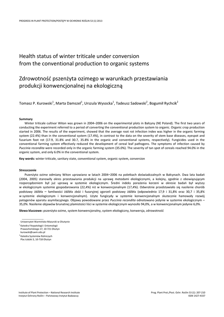 PROGRESS IN PLANT PROTECTION/POSTĘPY W OCHRONIE ROŚLIN 53 (1) 2013 Health status of winter triticale under conversion from the conventional production to organic systems Zdrowotność pszenżyta ozimego w warunkach przestawiania produkcji konwencjonalnej na ekologiczną Tomasz P. Kurowski1, Marta Damszel1, Urszula Wysocka1, Tadeusz Sadowski2, Bogumił Rychcik2 Summary Winter triticale cultivar Witon was grown in 2004–2006 on the experimental plots in Bałcyny (NE Poland). The first two years of conducting the experiment referred to a period of converting the conventional production system to organic. Organic crop production started in 2006. The results of the experiment, showed that the average root rot infection index was higher in the organic farming system (22.4%) than in the conventional system (17.4%), in contrast to the data on the severity of stem base diseases, eyespot and fusarium foot rot (17.9, 31.8% and 30.7, 35.8% in the organic and conventional systems, respectively). Fungicides used in the conventional farming system effectively reduced the development of cereal leaf pathogens. The symptoms of infection caused by Puccinia recondita were recorded only in the organic farming system (35.0%). The severity of tan spot of cereals reached 94.0% in the organic system, and only 6.0% in the conventional system. Key words: winter triticale, sanitary state, conventional system, organic system, conversion Streszczenie Pszenżyto ozime odmiany Witon uprawiano w latach 2004–2006 na poletkach doświadczalnych w Bałcynach. Dwa lata badań (2004, 2005) stanowiły okres przestawiania produkcji na uprawę metodami ekologicznymi, a kolejny, zgodnie z obowiązującym rozporządzeniem był już uprawą w systemie ekologicznym. Średni indeks porażenia korzeni w okresie badań był wyższy w ekologicznym systemie gospodarowania (22,4%) niż w konwencjonalnym (17,4%). Odwrotnie przedstawiało się nasilenie chorób podstawy źdźbła – łamliwości źdźbła zbóż i fuzaryjnej zgorzeli podstawy źdźbła (odpowiednio 17,9 i 31,8% oraz 30,7 i 35,8% w systemie ekologicznym i konwencjonalnym). Użyte fungicydy w systemie konwencjonalnym skutecznie hamowały rozwój patogenów aparatu asymilacyjnego. Objawy powodowane przez Puccinia recondita odnotowano jedynie w systemie ekologicznym – 35,0%. Nasilenie objawów brunatnej plamistości liści w systemie ekologicznym wynosiło 94,0%, a w konwencjonalnym jedynie 6,0%. Słowa kluczowe: pszenżyto ozime, system konwencjonalny, system ekologiczny, konwersja, zdrowotność Uniwersytet Warmińsko-Mazurski w Olsztynie 1 Katedra Fitopatologii i Entomologii Prawocheńskiego 17, 10-721 Olsztyn [email protected] 2 Katedra Systemów Rolniczych Plac Łódzki 3, 10-718 Olsztyn Institute of Plant Protection – National Research Institute Instytut Ochrony Roślin – Państwowy Instytut Badawczy Prog. Plant Prot./Post. Ochr. Roślin 53 (1): 207-210 ISSN 1427-4337 208 Health status of winter triticale / Zdrowotność pszenżyta ozimego Wstęp / Introduction Optymalne plonowanie i dobrą zdrowotność pszenżyta uzyskuje się stosując konwencjonalne metody gospodarowania, zaś w przypadku upraw ekologicznych może ono podlegać silnej presji patogenów. Zdrowotność pszenżyta w dużej mierze zależy od panujących warunków atmosferycznych (Szwejkowski i Kurowski 2003). Na stan zdrowotny pszenżyta mają wpływ wzajemne oddziaływania kompleksu czynników abiotycznych i biotycznych, w tym pochodzenia antropogenicznego. Wyniki badań ostatnich lat wskazują na wzrost nasilenia występowania chorób aparatu asymilacyjnego i podstawy źdźbła tego gatunku (Wakuliński i wsp. 2005; Weber i Hryńczuk 2005). Z kolei system dopłat jest czynnikiem powodującym przechodzenie większej liczby gospodarstw na produkcję w systemie ekologicznym, w którym nie stosuje się chemicznych metod ograniczania patogenów roślin. Dlatego ważne jest monitorowanie zdrowotności pszenżyta ozimego uprawianego metodą konwencjonalną i ekologiczną, z uwzględnieniem etapu konwersji, którego zadaniem jest indukcja równowagi interakcji patognantagonista i poprawa biologicznych właściwości gleby (Tyburski i Żakowska-Biemans 2007). Materiały i metody / Materials and methods Pszenżyto odmiany Witon uprawiano na poletkach doświadczalnych w Bałcynach (53,6 N, 19,85 E) na glebie średnio zwięzłej, kompleksu pszennego dobrego i żytniego bardzo dobrego, według zasad rolnictwa konwencjonalnego i ekologicznego. Dwa lata badań (2004, 2005) stanowiły okres przestawiania na produkcję metodami ekologicznymi, a kolejny, zgodnie z obowiązującym rozporządzeniem (Rozporządzenie 1991), stanowił już uprawę w systemie ekologicznym. W systemie ekologicznym pszenżyto ozime uprawiano w płodozmianie 6-polowym okopowym. Uwzględniono siłę nawozową przedplonu (przedprzedplon – ziemniak na oborniku, przedplon – orkisz ozimy) oraz bronowanie jako mechaniczny zabieg pielęgnacyjny. W systemie konwencjonalnym pszenżyto uprawiano w płodozmianie 6-polowym, zbożowym, w którym stosowano nawożenie mineralne: N – 80 kg/ha, P2O5 – 60 kg/ha i K2O – 100 kg/ha oraz regulowano zachwaszczenie (Mocarz 75 WG, Puma Universal 069 EW + Starane 250 EC). W ochronie Tabela 1. Środki ochrony roślin stosowane w uprawie pszenżyta ozimego Table 1. Pesticides used in the cultivation of winter tirticale Lp. No. Środek ochrony roślin Pesticide Substancja czynna Active substance 1. Mocarz 75 WG dicamba, tritosulfuron 2. Puma Universal 069 EW fenoxaprop-P-ethyl 3. Starane 250 EC fluroxypyr 4. Alert 375 SC flusilazol + carbendazym 5. Amistar 250 SC azoksystrobin chemicznej przed patogenami użyto fungicydów: Alert 375 SC (BBCH 30–31) i Amistar 250 SC (BBCH 51–53). Zabiegi prowadzono zgodnie z zaleceniami (tab. 1). Zdrowotność korzeni (BBCH 55) oceniano metodą Łacicowej (1970), liści i kłosów (BBCH 75) metodą Hinfnera i Pappa (1964), a zdrowotność podstawy źdźbła (BBCH 85