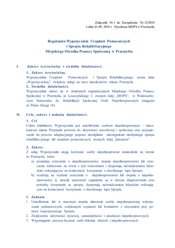Załącznik Nr 1 do Zarządzenia Nr 12/2010 z dnia 01.09. 2010 r. Dyrektora MOPS w Przemyślu Regulamin Wypożyczalni Urządzeń Pomocniczych i Sprzętu Rehabilitacyjnego Miejskiego Ośrodka Pomocy Społecznej w Przemyślu I. Zakre s te rytoria lny i s ie dziba działalnoś c i. 1. Zakre s te rytoria lny. Wypożyczalnia Urządzeń Pomocniczych i Sprzętu Rehabilitacyjnego, zwana dalej „Wypożyczalnią”, świadczy usługi na rzecz mieszkańców miasta Przemyśla. 2. Sie dziba działa lnoś c i. Wypożyczalnia mieści się w strukturach organizacyjnych Miejskiego Ośrodka Pomocy Społecznej w Przemyślu, ul. Leszczyńskiego 3, zwanym dalej „MOPS”, w Wieloosobowym Stanowisku ds. Rehabilitacji Społecznej Osób Niepełnosprawnych (magazyn ul. Piotra Skargi 18). II. Ce le , zakre s i zadania działa lnoś c i. 1. Ce l Celem działalności Wypożyczalni jest umożliwienie osobom niepełnosprawnym – mieszkańcom miasta Przemyśla powrotu do aktywności zawodowej i społecznej oraz przyspieszenie im procesu adaptacyjnego poprzez nieodpłatne udostępnienie niezbędnego sprzętu rehabilitacyjnego lub urządzeń pomocniczych, zwanych dalej „Sprzętem”. 2. Zakre s Z usług Wypożyczalni mogą korzystać osoby niepełnosprawne zamieszkałe na terenie m. Przemyśla, które: a) posiadają orzeczenie o niepełnosprawności, stopniu niepełnosprawności lub orzeczenie traktowane na równi z tym orzeczeniem i dysponują zaświadczeniem lekarskim wskazującym na konieczność korzystania z określonego tupu Sprzętu, b) oczekują na wydanie orzeczenia o niepełnosprawności lub stopniu o niepełnosprawności, tj. utraciły sprawność organizmu, są w okresie diagnozowania oraz potrzeby korzystania ze sprzętu, dysponują zaświadczeniem lekarskim wskazującym na konieczność korzystania z określonego tupu Sprzętu. 3. Zadania 1. Umożliwienie lub w znacznym stopniu ułatwienie osobie niepełnosprawnej wykonywanie podstawowych, codziennych czynności lub kontaktów z otoczeniem przy pomocy wypożyczonego Sprzętu. 2. Zwiększenie aktywności życiowej, samodzielności i zaradności niepełnosprawnych. 3. Wspomaganie procesu leczenia osób obłożnie chorych i niepełnosprawnych. 2 II I. Ogólne zas ady ś wiadc ze nia us ług. 1. Osoba niepełnosprawna ubiegająca się o użyczenie Sprzętu, zwana dalej „Biorącym do używania”, składa w MOPS osobiście lub za pomocą innej osoby, wniosek o użyczenie urządzeń pomocniczych, sprzętu rehabilitacyjnego. 2. Do wniosku o użyczenie dołącza się: a) kopię orzeczenia o niepełnosprawności lub kopię wypisu z treści orzeczenia traktowanego na równi z tym orzeczeniem, b) zaświadczenie lekarskie wskazujące konieczność korzystania z określonego tupu sprzętu rehabilitacyjnego lub urządzeń – środków pomocniczych. 3. Sprzęt udostępniany jest osobom niepełnosprawnym nieodpłatnie. 4. Podstawę użyczenia Sprzętu stanowi umowa użyczenia zawarta pomiędzy Dyrektorem MOPS, zwanym dalej „Użyczającym”, a Biorącym do używania, która określa szczegółowy zakres zobowiązań każdej ze stron umowy. 5. Przy zawarciu umowy Biorący do używania ma obowiązek: a) przedstawienia dowodu tożsamości, b) przedstawienia orzeczenia o niepełnosprawności lub wypis z treści orzeczenia traktowanego na równi z tym orzeczeniem, c) przedstawienia zaświadczenia od lekarza ze wskazaniem rodzaju - typu sprzętu oraz okresu, w którym pacjent winien z niego korzystać, d) złożenia pisemnego oświadczenia o zapoznaniu się z Regulaminem Wypożyczalni i ze sposobem użytkowania sprzętu, d) podania danych osobowych najbliższego członka rodziny Biorącym do używania lub innej osoby odpowiedzialnej za zwrot sprzętu w przypadku niemożności osobistego zwrotu przez Biorącego w użyczenie. 6. Jeżeli osoba wskazana przez lekarza w zaświadczeniu nie może osobiście wziąć w używanie Sprzętu, w jej imieniu może wystąpić i podpisać umowę inna osoba po przedstawieniu dokumentów wymienionych w pkt. 5, własnego dowodu tożsamości oraz udzielonego jej upoważnienia przez Biorącego do używania. 7. Jeżeli osoba wskazana przez lekarz w zaświadczeniu nie może udzielić innej osobie pisemnego upoważnienia w jej imieniu może wystąpić osoba wskazana przez lekarza. W takim przypadku zaświadczenie lekarskie musi zawierać dodatkową informację, że Biorący do używania ze względu na stan zdrowia nie jest w stanie udzielić upoważnienia. 8. Okres użyczenia biegnie od następnego dnia po wydaniu Sprzętu i nie może być dłuższy niż sześć miesięcy. 9. Ewentualne przedłużenie okresu użyczenia może nastąpić w okresie obowiązywania umowy użyczenia, nie później niż na 10 dni przed jej wygaśnięciem, po ponownym przedłożeniu aktualnego zaświadczenia od lekarza zawierającego informacje, o których mowa w pkt. 5c niniejszego Regulaminu oraz uzyskaniu zgody Dyrektora MOPS, z zastrzeżeniem, że nie będzie zgłoszeń kolejnych osób zainteresowanych jego użyczeniem. 10. W przypadku uszkodzenia lub częściowego zniszczenia Sprzętu z winy Biorącego do używania koszty jego naprawy pokrywa Biorący do używania. 3 11. W przypadku całkowitego zniszczenia Sprzętu z powodu okoliczności, za które odpowiedzialność ponosi Biorący do używania zobowiązany jest on do zakupu takiego samego Sprzętu, a w przypadku gdyby to nie było możliwe zwrotu równowartości tego Sprzętu. 12. W przypadku zaginięcia Sprzętu Biorący do używania zobowiązany jest do zakupu takiego samego Sprzętu, a w przypadku gdyby to nie było możliwe zwrotu równowartości tego Sprzętu. 13. W przypadku drobnej niezawinionej awarii Sprzętu Biorący do używania jest zobowiązany do zgłoszenia awarii Użyczającemu, który dokona naprawy Sprzętu. 14. W przypadku nie zwrócenia sprzętu w terminie, MOPS obciąży Biorącego do używania karą umowną w wysokości 0,25% wartości Sprzętu za każdy dzień opóźnienia. Po przekrocz