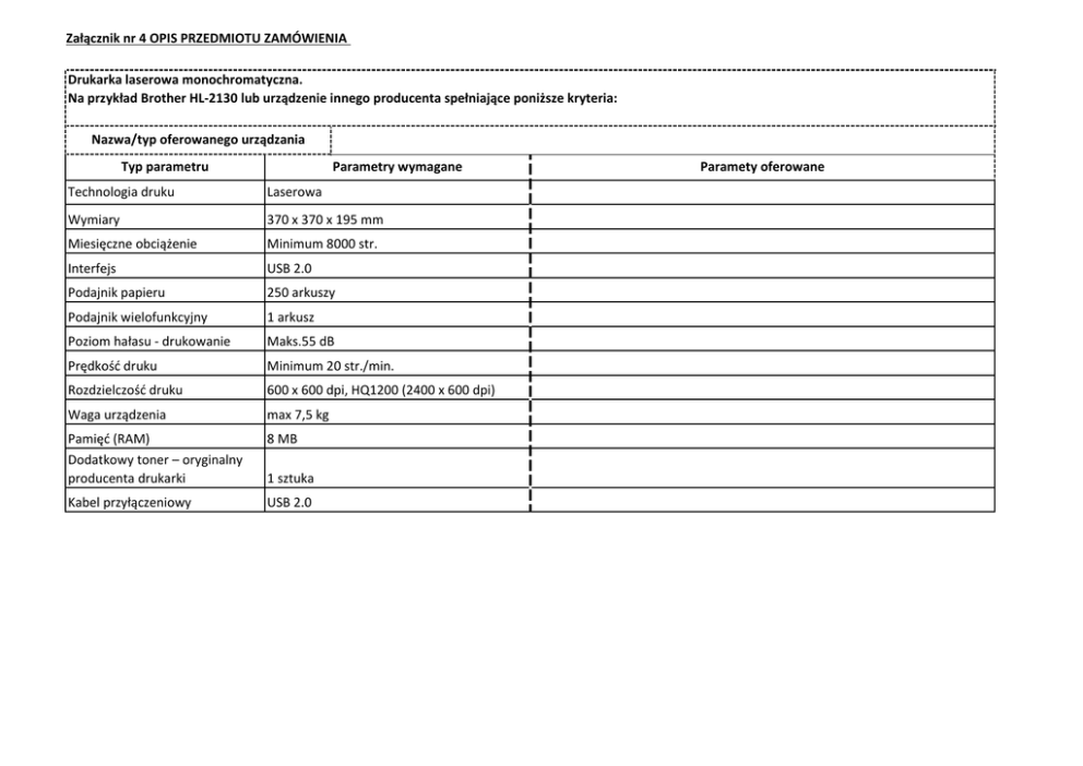 Załącznik nr 4 OPIS PRZEDMIOTU ZAMÓWIENIA Drukarka laserowa monochromatyczna. Na przykład Brother HL-2130 lub urządzenie innego producenta spełniające poniższe kryteria: Nazwa/typ oferowanego urządzania Typ parametru Parametry wymagane Technologia druku Laserowa Wymiary 370 x 370 x 195 mm Miesięczne obciążenie Minimum 8000 str. Interfejs USB 2.0 Podajnik papieru 250 arkuszy Podajnik wielofunkcyjny 1 arkusz Poziom hałasu - drukowanie Maks.55 dB Prędkość druku Minimum 20 str./min. Rozdzielczość druku 600 x 600 dpi, HQ1200 (2400 x 600 dpi) Waga urządzenia max 7,5 kg Pamięć (RAM) Dodatkowy toner – oryginalny producenta drukarki 8 MB Kabel przyłączeniowy USB 2.0 1 sztuka Paramety oferowane Załącznik nr 4 OPIS PRZEDMIOTU ZAMÓWIENIA Monitor komputerowy. Na przykład Samsung S24B300HL lub urządzenie innego producenta spełniające poniższe kryteria: Nazwa/typ oferowanego urządzania Typ parametru Parametry wymagane Przekątna ekranu 23,6" (16:9) Technologia podświetlenia LED Rozdzielczość 1920 x 1080 Czas reakcji Kąt widzenia (poziomy / pionowy) Interfejsy 5 ms Zużycie energii Maks.35 W 170° / 160° 1 x D-Sub, 1 x HDMI Wymiary z podstawą (szer. x wys. Maks. 575 x 420 x 200 mm x głęb.) Waga z podstawą Maks. 4,5 kg Paramety oferowane Załącznik nr 4 OPIS PRZEDMIOTU ZAMÓWIENIA Zestaw komputerowy stacjonarny (jednostka centralna+ monitor) , Na przykład Fujitsu P410 i3-3220 4GB 500GB Intel HD2500 DVDSM W7PRO/Win8PRO lub urządzenie innego producenta spełniające poniższe kryteria: Nazwa/typ oferowanego urządzania Typ parametru Parametry wymagane Typ obudowy Mini Tower Ilość zainstalowanych procesorów 1 szt. Typ zainstalowanego procesora Core i3 lub równoważny procesor innego producenta Częstotliwość procesora 3,3 GHz Ilość zainstalowanych dysków 1 szt. Maksymalna ilość dysków Pojemność zainstalowanego dysku Typ zainstalowanego dysku 3 szt 500 GB SATA III Pojemność zainstalowanej pamięci RAM 4096 MB DDR3 Zintegrowana karta graficzna Tak Zintegrowana karta dźwiękowa Tak Zintegrowana karta sieciowa 10/100/1000 Mbit/s Tak Interfejsy D-Sub (wyjście na monitor), 2 x analogowe wejścia audio, 8 x USB 2.0, 1 x RJ-45 (LAN) Napędy wbudowane System operacyjny Oprogramowanie DVD±RW Microsoft Windows 7 Professional Microsoft Office Professional Plus 2013 MOLP AE Paramety oferowane Załącznik nr 4 OPIS PRZEDMIOTU ZAMÓWIENIA Mysz, klawiatura Tak z oznaczonym logo producenta komputera Monitor LCD Na przykład Fujitsu L22T-6 LED lub urządzenie innego producenta spełniające poniższe kryteria. Nazwa/typ oferowanego urządzania Typ parametru Parametry wymagane Format ekranu monitora panoramiczny Przekątna ekranu 21,5 cali Technologia podświetlenia LED Czas reakcji matrycy 5 ms Jasność 250 cd/m2 Kontrast 1000:01:00 Liczba wyświetlanych kolorów 16,7 mln Złącza wejściowe 15-stykowe D-Sub, DVI-D Wbudowany zasilacz Tak Masa netto Maks. 3,9 kg Paramety oferowane Załącznik nr 4 OPIS PRZEDMIOTU ZAMÓWIENIA Urządzenie wielofunkcyjne, monochromatyczne laserowe Na przykład Brother DCP-7055W lub urządzenie innego producenta spełniające poniższe kryteria: Nazwa/typ oferowanego urządzania Typ parametru Parametry wymagane Technologia druku Laserowa Podajnik papieru 250 arkuszy Interfejs USB 2.0 Pamięć RAM 32 MB Czas wydruku 1 strony 10 sek. Ręczny dupleks Tak Rozdzielczość druku 600 dpi, HQ1200 (2400 x 600 dpi) Prędkość kopiowania Minimum 20 kopii/min. Rozdzielczość kopiowania Skan 600 x 600 dpi Kopiowanie wielokrotne 99 stron Miesięczne obciążenie Minimum 8000 stron Wymiary (w x d x h) 415 x 400 x 275 mm Waga Maks. 10kg Kabel przyłączeniowy USB 2.0 Paramety oferowane Załącznik nr 4 OPIS PRZEDMIOTU ZAMÓWIENIA Urządzenie wielofunkcyjne laserowe kolorowe Na przykład Brother MFC-9460CDN lub urządzenie innego producenta spełniające poniższe kryteria: Nazwa/typ oferowanego urządzania Typ parametru Parametry wymagane Technologia Laserowa LCD (ekran) 5 linii x 22 znaki Podajnik papieru 250 arkuszy Podajnik wielofunkcyjny 50 arkuszy Podajnik dokumentów ADF 35 arkuszy Odbiornik papieru 150 arkuszy Procesor 400 MHz Interfejsy USB 2.0, 10/100 Ethernet Base TX Strona internetowa drukarki Tak Pamięć (RAM) Standardowa 128 MB Formaty papieru A4, Letter, B5(ISO/JIS), A5, A5(Long Edge), B6(ISO), A6,Executive, Legal, Folio Gramatury papieru 60-163 g/m2 Czas wydruku 1 strony 16 sek. Prędkość faksu 33,6 kbps Prędkość transmisji (str.) 2,5 sek./strona (A4) Skala szarości 256 poziomów PC-FAX Tak Prędkość druku Mono 24 str./min., kolor 24 str./min Automatyczny dupleks tak Prędkość kopiowania 24 kopie/min. (mono i kolor) Rozdzielczość kopiowania Skan 600 x 1200 dpi Paramety oferowane Załącznik nr 4 OPIS PRZEDMIOTU ZAMÓWIENIA Zmniejszanie/Powiększanie kopii Kopiowanie wielokrotne Kopiowanie N na 1 str. (2 na 1 od 25 do 400 % str., 4 na 1 str.) Rozdzielczość skanowania 1200 x 2400 dpi Możliwość skanowania do: Obrazu OCR E-maila Pliku Pamięci USB FTP Folderu sieciowego Miesięczne obciążenie Waga Wymiary (w x d x h) 40000 str. Maks. 29kg 415 x 510 x 498 mm Załącznik nr 4 OPIS PRZEDMIOTU ZAMÓWIENIA Skaner płaski biurowy Na przykład: Canon CanoScan LiDE 700F lub urządzenie innego producenta spełniające poniższe kryteria: Nazwa/typ oferowanego urządzania Typ parametru Parametry wymagane Typ skanera Kolorowy, płaski Źródło światła 3-kolorowa (RGB) dioda LED Maksymalny format dokumentu A4/Letter (216 x 297 mm) Wymiary maksymalne 300 × 415 × 50 mm Masa Maks.3 kg Windows 8 (32- i 64-bitowy) Windows 7 (32- i 64-bitowy) Windows Vista (32- i 64-bitowy) Obsługiwane systemy operacyjne Windows XP (32-bitowy) Windows 2000 Zasilanie Z portu USB Paramety oferowane Załącznik nr 4 OPIS PRZEDMIOTU ZAMÓWIENIA Monitor LCD Na przykład Samsung S24C570HL lub urządzenie innego producenta spełniające poniższe kryteria: Nazwa/typ oferowanego urządzania Typ parametru Parametry wymagane Ekran 23,6 ‘’ LED, 16:9 