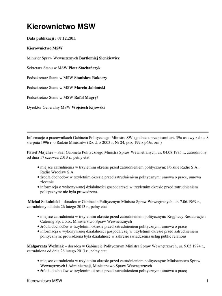 Kierownictwo MSW Data publikacji : 07.12.2011 Kierownictwo MSW Minister Spraw Wewnętrznych Bartłomiej Sienkiewicz Sekretarz Stanu w MSW Piotr Stachańczyk Podsekretarz Stanu w MSW Stanisław Rakoczy Podsekretarz Stanu w MSW Marcin Jabłoński Podsekretarz Stanu w MSW Rafał Magryś Dyrektor Generalny MSW Wojciech Kijowski Informacje o pracownikach Gabinetu Politycznego Ministra SW zgodnie z przepisami art. 39a ustawy z dnia 8 sierpnia 1996 r. o Radzie Ministrów (Dz.U. z 2003 r. Nr 24, poz. 199 z późn. zm.) Paweł Majcher – Szef Gabinetu Politycznego Ministra Spraw Wewnętrznych, ur. 04.08.1975 r., zatrudniony od dnia 17 czerwca 2013 r., pełny etat • miejsce zatrudnienia w trzyletnim okresie przed zatrudnieniem politycznym: Polskie Radio S.A., Radio Wrocław S.A. • źródła dochodów w trzyletnim okresie przed zatrudnieniem politycznym: umowa o pracę, umowa zlecenie • informacja o wykonywanej działalności gospodarczej w trzyletnim okresie przed zatrudnieniem politycznym: nie była prowadzona. Michał Sokolnicki – doradca w Gabinecie Politycznym Ministra Spraw Wewnętrznych, ur. 7.06.1969 r., zatrudniony od dnia 26 lutego 2013 r., pełny etat • miejsce zatrudnienia w trzyletnim okresie przed zatrudnieniem politycznym: Kręgliccy Restauracje i Catering Sp. z o.o., Ministerstwo Spraw Wewnętrznych • źródła dochodów w trzyletnim okresie przed zatrudnieniem politycznym: umowa o pracę • informacja o wykonywanej działalności gospodarczej w trzyletnim okresie przed zatrudnieniem politycznym: prowadzona była działalność w zakresie świadczenia usług public relations Małgorzata Woźniak – doradca w Gabinecie Politycznym Ministra Spraw Wewnętrznych, ur. 9.05.1974 r., zatrudniona od dnia 26 lutego 2013 r., pełny etat • miejsce zatrudnienia w trzyletnim okresie przed zatrudnieniem politycznym: Ministerstwo Spraw Wewnętrznych i Administracji, Ministerstwo Spraw Wewnętrznych • źródła dochodów w trzyletnim okresie przed zatrudnieniem politycznym: umowa o pracę Kierownictwo MSW 1 Biuletyn Informacji Publicznej MSW • informacja o wykonywanej działalności gospodarczej w trzyletnim okresie przed zatrudnieniem politycznym: nie była prowadzona Krystyna Marcinek – doradca w Gabinecie Politycznym Ministra Spraw Wewnętrznych, ur. 11.11.1986 r., zatrudniona od dnia 1 marca 2013 r., pełny etat. • miejsce zatrudnienia w trzyletnim okresie przed zatrudnieniem politycznym: Salvor Sp. z o.o. i Wspólnicy Sp. Komandytowa, ASBS Othago • źródła dochodów w trzyletnim okresie przed zatrudnieniem politycznym: umowa o pracę, umowa o dzieło • informacja o wykonywanej działalności gospodarczej w trzyletnim okresie przed zatrudnieniem politycznym: nie była prowadzona Paweł Polak – doradca w Gabinecie Politycznym Ministra Spraw Wewnętrznych, ur. 28.04.1990 r. , zatrudniony od dnia 20 lutego 2013 r., pełny etat • miejsce zatrudnienia w trzyletnim okresie przed zatrudnieniem politycznym: Exi Sport • źródła dochodów w trzyletnim okresie przed zatrudnieniem politycznym: umowa zlecenie • informacja o wykonywanej działalności gospodarczej w trzyletnim okresie przed zatrudnieniem politycznym: nie była prowadzona Joanna Faryna-Wielowieyska – doradca w Gabinecie Politycznym Ministra Spraw Wewnętrznych, ur. 10.05.1985 r., zatrudniona od dnia 1 kwietnia 2013 r., pełny etat • miejsce zatrudnienia w trzyletnim okresie przed zatrudnieniem politycznym: Kancelaria Prezesa Rady Ministrów, Ministerstwo Spraw Wewnętrznych • źródła dochodów w trzyletnim okresie przed zatrudnieniem politycznym: umowa o pracę • informacja o wykonywanej działalności gospodarczej w trzyletnim okresie przed zatrudnieniem politycznym: nie była prowadzona Adam Malczak – doradca w Gabinecie Politycznym Ministra Spraw Wewnętrznych, ur.21.07.1992 r. , zatrudniony od dnia 1 lipca 2013 r., pełny etat • miejsce zatrudnienia w trzyletnim okresie przed zatrudnieniem politycznym: Rada Rodziców przy II Liceum Ogólnokształcącym i Gimnazjum im. Stefana Batorego, King’s College London • źródła dochodów w trzyletnim okresie przed zatrudnieniem politycznym: umowa zlecenie • informacja o wykonywanej działalności gospodarczej w trzyletnim okresie przed zatrudnieniem politycznym: nie była prowadzona. Kierownictwo MSW 2