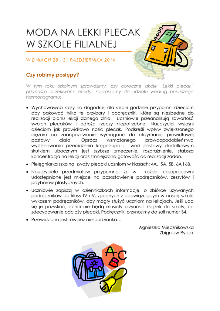 MODA NA LEKKI PLECAK W SZKOLE FILIALNEJ W DNIACH 28 - 31 PAŹDZIERNIKA 2014 Czy robimy postępy? W tym roku szkolnym sprawdzimy, czy coroczne akcje „Lekki plecak” przynoszą oczekiwane efekty. Zapraszamy do udziału według poniższego harmonogramu: Wychowawca klasy na dogodnej dla siebie godzinie przypomni dzieciom aby pakować tylko te przybory i podręczniki, które są niezbędne do realizacji planu lekcji danego dnia. Uczniowie przeanalizują zawartość swoich plecaków i odłożą rzeczy niepotrzebne. Nauczyciel wyjaśni dzieciom jak prawidłowo nosić plecak. Podkreśli wpływ zwiększonego ciężaru na zaangażowanie wymagane do utrzymania prawidłowej postawy ciała. Oprócz wzmożonego prawdopodobieństwa występowania przeciążenia kręgosłupa i wad postawy dodatkowym skutkiem ubocznym jest szybsze zmęczenie, rozdrażnienie, słabsza koncentracja na lekcji oraz zmniejszona gotowość do realizacji zadań. Pielęgniarka szkolna zważy plecaki uczniom w klasach: 4A, 5A, 5B, 6A i 6B. Nauczyciele przedmiotów przypomną, że w każdej klasopracowni udostępnione jest miejsce na pozostawienie podręczników, zeszytów i przyborów plastycznych. Uczniowie zapiszą w dzienniczkach informację, o zbiórce używanych podręczników do klasy IV i V, zgodnych z obowiązującym w naszej szkole wykazem podręczników, aby mogły służyć uczniom na lekcjach. Jeśli uda się je pozyskać, dzieci nie będą musiały przynosić książek do szkoły, co zdecydowanie odciąży plecaki. Podręczniki przynosimy do sali numer 34. Przewidziana jest również niespodzianka… Agnieszka Miecznikowska Zbigniew Rybak