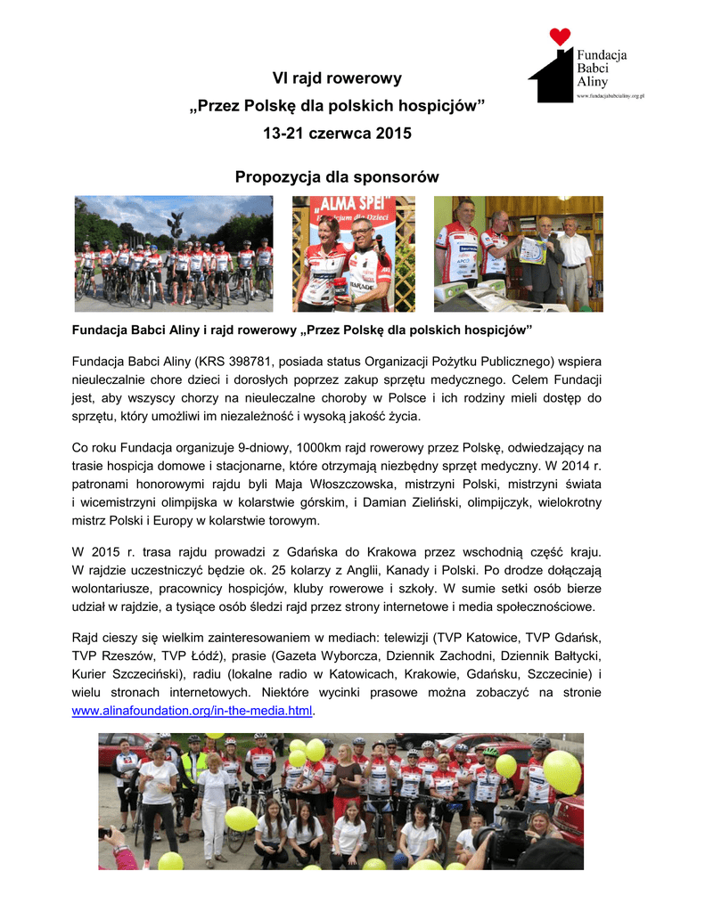 VI rajd rowerowy „Przez Polskę dla polskich hospicjów” 13-21 czerwca 2015 Propozycja dla sponsorów Fundacja Babci Aliny i rajd rowerowy „Przez Polskę dla polskich hospicjów” Fundacja Babci Aliny (KRS 398781, posiada status Organizacji Pożytku Publicznego) wspiera nieuleczalnie chore dzieci i dorosłych poprzez zakup sprzętu medycznego. Celem Fundacji jest, aby wszyscy chorzy na nieuleczalne choroby w Polsce i ich rodziny mieli dostęp do sprzętu, który umożliwi im niezależność i wysoką jakość życia. Co roku Fundacja organizuje 9-dniowy, 1000km rajd rowerowy przez Polskę, odwiedzający na trasie hospicja domowe i stacjonarne, które otrzymają niezbędny sprzęt medyczny. W 2014 r. patronami honorowymi rajdu byli Maja Włoszczowska, mistrzyni Polski, mistrzyni świata i wicemistrzyni olimpijska w kolarstwie górskim, i Damian Zieliński, olimpijczyk, wielokrotny mistrz Polski i Europy w kolarstwie torowym. W 2015 r. trasa rajdu prowadzi z Gdańska do Krakowa przez wschodnią część kraju. W rajdzie uczestniczyć będzie ok. 25 kolarzy z Anglii, Kanady i Polski. Po drodze dołączają wolontariusze, pracownicy hospicjów, kluby rowerowe i szkoły. W sumie setki osób bierze udział w rajdzie, a tysiące osób śledzi rajd przez strony internetowe i media społecznościowe. Rajd cieszy się wielkim zainteresowaniem w mediach: telewizji (TVP Katowice, TVP Gdańsk, TVP Rzeszów, TVP Łódź), prasie (Gazeta Wyborcza, Dziennik Zachodni, Dziennik Bałtycki, Kurier Szczeciński), radiu (lokalne radio w Katowicach, Krakowie, Gdańsku, Szczecinie) i wielu stronach internetowych. Niektóre wycinki prasowe można zobaczyć na stronie www.alinafoundation.org/in-the-media.html. Propozycja współpracy Oficjalni partnerzy rajdu „Przez Polskę dla polskich hospicjów" w 2015 r. mogą skorzystać z następujących propozycji: logo na koszulkach/spodenkach kolarzy noszonych podczas rajdu, konferencji prasowych, spotkań z hospicjami i innych imprezach sportowych logo z linkiem i wzmianki na stronach internetowych www.fundacjababcialiny.org.pl i www.alinafoundation.org (w sumie 200-700 unikalnych użytkowników dziennie, ponad 1000 dziennie podczas rajdu) oraz blogu logo na materiałach dotyczących rajdu (np. flagach, ulotkach, plakatach) logo i wzmianki w mediach społecznościowych Fundacji (średni zasięg 600 osób, podczas rajdu ponad 4 800 osób dziennie) logo i wzmianki w filmie z rajdu (www.alinafoundation.org/film.html) wzmianki i fotografie zawierające logo w mediach (prasa, telewizja, radio) wzmianki wśród informacji o wydarzeniu na stronie internetowej Fundacji Hospicyjnej (www.fundacjahospicyjna.pl), na portalach gazet krajowych i lokalnych, stronach miast i regionów odwiedzanych przez rajd, organizacji kolarskich, hospicjów wysokiej jakości zdjęcia do użycia w promocji firmy np. na stronie internetowej wizyta rajdu w siedzibie firmy, z okazją na promocyjne zdjęcia i rozmowy z prasą obecność i promocja podczas początku lub końca odcinka rajdu Korzyści dla poszczególnych partnerów są proporcjonalne do poziomu wsparcia dla Fundacji. Wierzymy, że pozycja oficjalnego partnera ma dużą wartość, z względu na pozytywne skojarzenie z rajdem i patronem honorowym, a także skali nagłośnienia rajdu w mediach. Względnie z działalnością partnera, jest także możliwość wsparcia Fundacji poprzez przekazanie sprzętu dla polskich hospicjów, na przykład wózków inwalidzkich, materacy przeciwodleżynowych, łóżek rehabilitacyjnych itp. Wszystkie fundusze od patnerów będą w całości przekazane na cele Fundacji – uczestnicy sami pokrywają koszty udziału w rajdzie. Chętnie uwzględnimy preferencje sponsora, na przykład poprzez użycie funduszy na wsparcie dla hospicjów w okolicach siedziby sponsora. Fundacja jest zarejestrowana w KRS 0000398781 i darowizny można odliczyć od podatków. Fundacja Babci Aliny Fundacja Babci Aliny (KRS 0000398781) wspiera polskie hospicja domowe i stacjonarne poprzez przekaz niezbędnego sprzętu medycznego. Celem Fundacji jest, aby wszyscy chorzy na nieuleczalne choroby i ich rodziny mieli dostęp do koniecznej pomocy. Fundacja została założona dla upamiętnienia Aliny, naszej Mamy i Babci, która była do ostatnich dni pod opieką polskiego hospicjum. Rajd i Fundacja są prowadzone całkowicie przez wolontariuszów, a fundatorzy pokrywają wszelkie koszty ogólne – wszystkie dary są używane na zakup sprzętu dla hospicjów. Każda złotówka wpłacona na fundusz Fundacji jest w całości przeznaczona na zakup sprzętu. Od 2009 r. Fundacja zebrała ponad 600.000 zł i przekazała sprzęt 43 hospicjom dla dzieci i dorosłych. Przekazaliśmy zarówno rzeczy bardzo podstawowe (opatrunki, cewniki, kremy), jak i specjalistyczny sprzęt (łóżka rehabilitacyjne, materace przeciwodleżynowe, wózki inwalidzkie i podnośniki). Pokryliśmy również koszty szkolenia wolontariuszy, którzy odgrywają kluczową rolę w ruchu hospicyjnym. Sprzęt jest albo bezpłatnie wypożyczany pacjentom pod opieką domową lub używany w placówkach stacjonarnych. W większości przypadków sprzęt jest używany wiele razy; jedno łóżko może pomóc wielu pacjentom. W ten sposób praca Fundacji i wsparcie darczyńców i sponsorów przynosi długotrwały efekt dla chorych, ich rodzin i lokalnych społeczności. W 2015 chcemy zebrać ponad 100 000 zł, aby pomóc jeszcze większej ilości pacjentów. Pomóż nam– zostań oficjalnym partnerem rajdu „Przez Polskę dla Polskich hospicjów”. Dalsze informacje na stronie internetowej www.fundacjababcialiny.org.pl. Fundacja Babci Aliny ul Bogusławskiego 15 43-300 Bielsko-Biała [email protected]