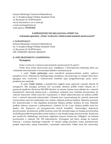 Instytut Metalurgii i Inżynierii Materiałowej im. A. Krupkowskiego Polskiej Akademii Nauk ul. Reymonta 25, 30-059 Kraków strona internetowa: www.imim.pl e-mail: [email protected] znak sprawy: ZO/03/2016 ZAPROSZENIE DO SKŁADANIA OFERT NA: wykonania aparatury „Tester wychwytu i różnicowania komórek macierzystych” I. ZAMAWIAJĄCY Instytut Metalurgii i Inżynierii Materiałowej im. A. Krupkowskiego Polskiej Akademii Nauk ul. Reymonta 25, 30-059 Kraków NIP: 6750001857, REGON: 000326374 II. OPIS PRZEDMIOTU ZAMÓWIENIA Wymagania: Tester wychwytu i różnicowania komórek macierzystych (2 części)": Tester musi zostać opracowany przy współpracy z doświadczoną instytucją, która ma wieloletnie doświadczenie w konstrukcji układów mechanicznych. - I część: Tester pulsacyjny musi umożliwić przeprowadzenie analizy wpływu przepływu krwi, zbliżonej do fizjologicznego przepływu naczyniowego na stopień aktywacji i agregacji oraz wychwytu i różnicowania komórek typu progenitorowego przez nowoprojektowane materiały. - II część: Tester wirowy z przepływem ciągłym musi zapewnić warunki silnych sił ścinających. Siły ścinające powinny być wywołane obrotem próbki wokół własnej osi w granicach prędkości obrotowej 500-3000 obrotów na minutę. System musi składać się z czterech niezależnych stanowisk badawczych z centralnym poborem krwi ludzkiej równocześnie do czterech stanowisk. Układ musi być wyposażony w układ odpowietrzania orz poboru próbki krwi z czterech stanowisk jednocześnie. Ciśnienie krwi wprowadzanej do czterech stanowisk równocześnie musi być jednostajne, bez zmiany ciśnienia podczas badania. Elementy powinny być demontowalne w celu dogodnej sterylizacji. Badana próbka: średnica do 4cm. Materiał: podłoże stalowe, tytanowe i poliuretanowe. Grubość 0.5 do 2 mm. Badana próbka musi być płaska. Nie dopuszcza się przygotowania innych kształtów. Zamawiający dopuszcza przytrzymanie mechaniczne próbki podczas testu lub niewpływającą na badaną powierzchnią modyfikację próbki bezpośrednio przed analizą w celu bezpiecznego przytrzymania. Konieczna jest możliwość dokładnego sterowania objętością komory badawczej. Odległość od badanej powierzchni w zakresie 150- 250 mikrometrów. Wymagany jest łatwy dostęp do komory testowej i wymiana badanego materiału. W ramach usługi powinien zostać przedstawiony projekt stanowiska, zakup materiałów, wykonanie stanowiska. Układ musi być sterowalny elektronicznie. Sterowanie, oprogramowanie oraz protokół analizy zostaną zapewnione przez zamawiającego. Wymagania dotyczące materiałów: Wszystkie elementy musi być wykonane ze stali kwasoodpornej lub materiału neutralnego dla płynów ustrojowych i tkanek. Wymagania dla firmy: Duże doświadczenie w projektowaniu i wykonywaniu zaawansowanych urządzeń mechanicznych. - Instytut zwraca się z prośbą o przesłanie aktualnego odpis z właściwego rejestru lub z centralnej ewidencji i informacji o działalności gospodarczej, wystawionego nie wcześniej niż 6 miesięcy przed upływem terminu składania ofert. III ZAMAWIAJĄCY NIE DOPUSZCZA SKŁADANIA OFERT CZĘŚCIOWYCH. IV. TERMIN WYKONANIA Zamówienie musi być zrealizowane w terminie: do 16 grudnia 2016. W przypadku stanowiska wirowego, składającego się z czterech niezależnych punktów pomiarowych, jeden prototypowy punkt doświadczalny musi zostać wykonany do wstępnych testów do 31.05.2016. Etapy wykonani aparatury: I etap – wykonanie jednego prototypowego punktu doświadczalnego do wstępnych testów w terminie do 31.05.2016. II etap – wykonacie aparatury do 16 grudnia 2016 V. OPIS SPOSOBU PRZYGOTOWANIA OFERTY Oferta powinna: zawierać adres lub siedzibę oferenta, adres e-mail, numer telefonu, numer NIP, Regon, KRS, określać cenę za wykonanie urzadzenia. VI. MIEJSCE ORAZ TERMIN SKŁADANIA OFERT 1. Oferta powinna zostać przesłana za pośrednictwem: poczty elektronicznej na adres: [email protected], lub faksem na nr: + 48 12 295-28-04 do dnia 22.02.2016 roku do godziny 12:00. 2. Oferty złożone po terminie nie będą rozpatrywane. 3. Oferent może przed upływem terminu składania ofert zmienić lub wycofać swoją ofertę. 4. W toku badania i oceny ofert Zamawiający może żądać od Oferentów wyjaśnień dotyczących treści złożonych ofert. VII. OCENA OFERT Zamawiający dokona oceny ważnych ofert na podstawie następujących kryteriów: Nr: Nazwa kryterium: Waga: 1 Cena (koszt) 100% Punkty będą liczone według następującego wzoru: Nr kryt. 1 Wzór Cena (koszt) Liczba punktówC1 = ( C min / C bad ) gdzie: - C bad – cena brutto podana w ofercie badanej - C min – najniższa cena brutto spośród wszystkich ofert VII. DODATKOWE INFORMACJE Dodatkowych informacji udziela mgr Marek Pac pod numerem telefonu 12 295-28-45, pod adresem e-mail: [email protected] IX. ZAŁĄCZNIKI DO OFERTY: Załącznik nr 1 – Formularz oferty X. DO OFERTY NALEŻY DOŁĄCZYĆ: 1. Formularz oferty – Załącznik nr 1 2. Proszę o dołączenie rejestru. Załącznik nr 1 FORMULARZ OFERTY NAZWA WYKONAWCY: ............................................................................................................ ADRES: ............................................................................................................................................ TEL./FAX/ E-MAIL ......................................................................................................................... NIP.................................................................... REGON ................................................................. BANK/ NR KONTA ....................................................................................................................... Do: Instytut Metalurgii i Inżynierii Materiałowej im. A. Krupkowskiego Polskiej Akademii Nauk w Krakowie ul. Reymonta 25, 30-059 Kraków Przystępując do postępowania o udzielenie zamów