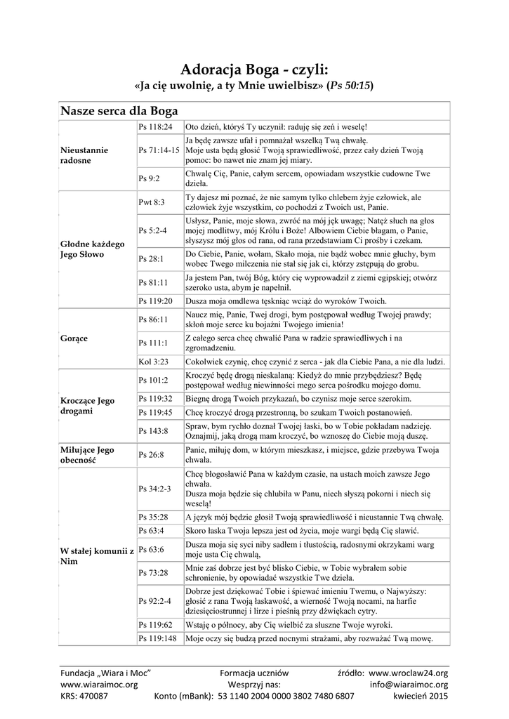 Adoracja Boga - czyli: «Ja cię uwolnię, a ty Mnie uwielbisz» (Ps 50:15) Nasze serca dla Boga Ps 118:24 Nieustannie radosne Głodne każdego Jego Słowo Gorące Kroczące Jego drogami Miłujące Jego obecność Oto dzień, któryś Ty uczynił: raduję się zeń i weselę! Ja będę zawsze ufał i pomnażał wszelką Twą chwałę. Ps 71:14-15 Moje usta będą głosić Twoją sprawiedliwość, przez cały dzień Twoją pomoc: bo nawet nie znam jej miary. Ps 9:2 Chwalę Cię, Panie, całym sercem, opowiadam wszystkie cudowne Twe dzieła. Pwt 8:3 Ty dajesz mi poznać, że nie samym tylko chlebem żyje człowiek, ale człowiek żyje wszystkim, co pochodzi z Twoich ust, Panie. Ps 5:2-4 Usłysz, Panie, moje słowa, zwróć na mój jęk uwagę; Natęż słuch na głos mojej modlitwy, mój Królu i Boże! Albowiem Ciebie błagam, o Panie, słyszysz mój głos od rana, od rana przedstawiam Ci prośby i czekam. Ps 28:1 Do Ciebie, Panie, wołam, Skało moja, nie bądź wobec mnie głuchy, bym wobec Twego milczenia nie stał się jak ci, którzy zstępują do grobu. Ps 81:11 Ja jestem Pan, twój Bóg, który cię wyprowadził z ziemi egipskiej; otwórz szeroko usta, abym je napełnił. Ps 119:20 Dusza moja omdlewa tęskniąc wciąż do wyroków Twoich. Ps 86:11 Naucz mię, Panie, Twej drogi, bym postępował według Twojej prawdy; skłoń moje serce ku bojaźni Twojego imienia! Ps 111:1 Z całego serca chcę chwalić Pana w radzie sprawiedliwych i na zgromadzeniu. Kol 3:23 Cokolwiek czynię, chcę czynić z serca - jak dla Ciebie Pana, a nie dla ludzi. Ps 101:2 Kroczyć będę drogą nieskalaną: Kiedyż do mnie przybędziesz? Będę postępował według niewinności mego serca pośrodku mojego domu. Ps 119:32 Biegnę drogą Twoich przykazań, bo czynisz moje serce szerokim. Ps 119:45 Chcę kroczyć drogą przestronną, bo szukam Twoich postanowień. Ps 143:8 Spraw, bym rychło doznał Twojej łaski, bo w Tobie pokładam nadzieję. Oznajmij, jaką drogą mam kroczyć, bo wznoszę do Ciebie moją duszę. Ps 26:8 Panie, miłuję dom, w którym mieszkasz, i miejsce, gdzie przebywa Twoja chwała. Ps 34:2-3 Chcę błogosławić Pana w każdym czasie, na ustach moich zawsze Jego chwała. Dusza moja będzie się chlubiła w Panu, niech słyszą pokorni i niech się weselą! Ps 35:28 A język mój będzie głosił Twoją sprawiedliwość i nieustannie Twą chwałę. Ps 63:4 Skoro łaska Twoja lepsza jest od życia, moje wargi będą Cię sławić. W stałej komunii z Ps 63:6 Nim Ps 73:28 Dusza moja się syci niby sadłem i tłustością, radosnymi okrzykami warg moje usta Cię chwalą, Mnie zaś dobrze jest być blisko Ciebie, w Tobie wybrałem sobie schronienie, by opowiadać wszystkie Twe dzieła. Ps 92:2-4 Dobrze jest dziękować Tobie i śpiewać imieniu Twemu, o Najwyższy: głosić z rana Twoją łaskawość, a wierność Twoją nocami, na harfie dziesięciostrunnej i lirze i pieśnią przy dźwiękach cytry. Ps 119:62 Wstaję o północy, aby Cię wielbić za słuszne Twoje wyroki. Ps 119:148 Moje oczy się budzą przed nocnymi strażami, aby rozważać Twą mowę. Fundacja „Wiara i Moc” Formacja uczniów źródło: www.wroclaw24.org www.wiaraimoc.org Wesprzyj nas: [email protected] KRS: 470087 Konto (mBank): 53 1140 2004 0000 3802 7480 6807 kwiecień 2015 Poszukujące Ps 119:164 Siedemkroć na dzień wysławiam Ciebie z powodu sprawiedliwych Twych wyroków. Ps 145:1-2 Chcę Cię wywyższać, Boże mój, Królu, i błogosławić imię Twe na zawsze i na wieki. Każdego dnia będę Cię błogosławił i na wieki wysławiał Twe imię. Ps 27:8-9 O Tobie mówi moje serce: Szukaj Jego oblicza! Szukam, o Panie, Twojego oblicza; swego oblicza nie zakrywaj przede mną, nie odpędzaj z gniewem swojego sługi! Ty jesteś moją pomocą, więc mnie nie odrzucaj i nie opuszczaj mnie, Boże, moje Zbawienie! Ps 63:2 Boże, Ty Boże mój, Ciebie szukam; Ciebie pragnie moja dusza, za Tobą tęskni moje ciało, jak ziemia zeschła, spragniona bez wody. Ps 77:3 Szukam Pana w dzień mojej niedoli. Moja ręka w nocy niestrudzenie się wyciąga, moja dusza odmawia przyjęcia pociechy. Ps 105:4 Rozmyślam o Tobie i Twojej potędze, szukam zawsze Twego oblicza! Ps 119:10 Z całego serca swego szukam Ciebie; nie daj mi zboczyć od Twoich przykazań! Ps 119:45 Chcę kroczyć drogą przestronną, bo szukam Twoich postanowień. Ps 42:2-3 Jak łania pragnie wody ze strumieni, tak dusza moja pragnie Ciebie, Boże! Dusza moja pragnie Ciebie Boże, Boże żywy: kiedyż więc przyjdę i ujrzę Twoje oblicze? Ps 63:2-4 Boże, Ty Boże mój, Ciebie szukam; Ciebie pragnie moja dusza, za Tobą tęskni moje ciało, jak ziemia zeschła, spragniona bez wody. W świątyni tak się wpatruję w Ciebie, bym ujrzał Twoją potęgę i chwałę. Skoro łaska Twoja lepsza jest od życia, moje wargi będą Cię sławić. Ps 84:3 Dusza moja pragnie i tęskni do przedsieni Twoich. Moje serce i ciało radośnie wołają do Ciebie - Boga żywego. Ps 84:11 Zaiste jeden dzień w przybytkach Twoich lepszy jest niż innych tysiące; wolę stać w progu domu mojego Boga, niż mieszkać w namiotach grzeszników. Ps 105:3-4 Szczycę się Twoim świętym imieniem; niech się weseli serce szukających Pana! Rozmyślam o Tobie i Twej potędze, szukam zawsze Twego oblicza! Ps 108:2-5 Gotowe jest serce moje, Boże, zaśpiewam i zagram. Zbudź się, chwało moja, zbudź się, harfo i cytro! Chcę obudzić jutrzenkę. Wśród ludów będę chwalił Cię, Panie, zagram Ci wśród narodów, bo Twoja łaskawość sięga aż do niebios, a wierność Twoja po chmury. Ps 130:5-6 W Panu pokładam nadzieję, nadzieję żywi moja dusza: oczekuję na Twe słowo. Dusza moja oczekuje Ciebie bardziej niż strażnicy świtu. Ps 143:6 Wyciągam ręce do Ciebie; moja dusza pragnie Ciebie jak zeschła ziemia. Ps 16:8-9 Stawiam sobie zawsze Pana przed oczy, nie zachwieję się, bo On jest po mojej prawicy. Dlatego się cieszy moje serce, dusza się raduje, a ciało moje będ