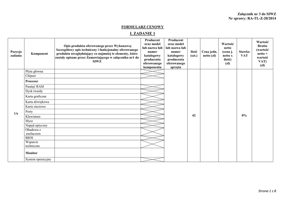 Załącznik nr 3 do SIWZ Nr sprawy: RA-TL-Z-20/2014 FORMULARZ CENOWY I. ZADANIE 1 Pozycja zadania Komponent Opis produktu oferowanego przez Wykonawcę Szczegółowy opis techniczny i funkcjonalny oferowanego produktu uwzględniający co najmniej te elementy, które zostały opisane przez Zamawiającego w załączniku nr1 do SIWZ Producent Producent oraz model oraz model lub nazwa lub lub nazwa lub numer numer katalogowy katalogowy producenta producenta oferowanego oferowanego komponentu sprzętu Ilość (szt.) Cena jedn. netto (zł) Wartość netto (cena j. netto x ilość) (zł) Stawka VAT Wartość Brutto (wartość netto + wartość VAT) (zł) Płyta główna Chipset Procesor Pamięć RAM Dysk twardy Karta graficzna Karta dźwiękowa Karta sieciowa 1A Porty Klawiatura Mysz Napęd optyczny Obudowa z zasilaczem BIOS Wsparcie techniczne 42 0% Monitor System operacyjny Strona 1 z 8 Załącznik nr 3 do SIWZ Nr sprawy: RA-TL-Z-20/2014 FORMULARZ CENOWY Płyta główna Chipset Procesor Pamięć RAM Dysk twardy Karta graficzna Karta dźwiękowa Karta sieciowa Porty 1B 180 0% Klawiatura Mysz Napęd optyczny Obudowa z zasilaczem Bezpieczeństwo i zarządzanie BIOS Dodatkowe oprogramowanie Wsparcie techniczne System operacyjny Strona 2 z 8 Załącznik nr 3 do SIWZ Nr sprawy: RA-TL-Z-20/2014 FORMULARZ CENOWY Płyta główna Chipset Procesor Pamięć RAM Dysk twardy Karta graficzna Karta dźwiękowa Karta sieciowa 1C Porty 30 0% Klawiatura Mysz Napęd optyczny Obudowa z zasilaczem Bezpieczeństwo i zarządzanie BIOS Dodatkowe oprogramowanie Wsparcie techniczne System operacyjny Strona 3 z 8 Załącznik nr 3 do SIWZ Nr sprawy: RA-TL-Z-20/2014 FORMULARZ CENOWY 1D Typ ekranu Format Jasność Kontrast Kąty widzenia (pion/poziom) Czas reakcji matrycy Natywna rozdzielczość Bezpieczeństwo Funkcje Złącze 180 0% 20 0% Certyfikaty Typ ekranu Format Jasność 1E Kontrast Kąty widzenia (pion/poziom) Czas reakcji matrycy Natywna rozdzielczość Bezpieczeństwo Funkcje Złącze Certyfikaty OGÓŁEM WARTOŚĆ ZADANIA 1 (suma wartości wszystkich pozycji Zadania 1) Strona 4 z 8 Załącznik nr 3 do SIWZ Nr sprawy: RA-TL-Z-20/2014 FORMULARZ CENOWY II. ZADANIE 2 Pozycja zadania Opis produktu oferowanego przez Wykonawcę Szczegółowy opis techniczny i funkcjonalny oferowanego produktu uwzględniający co najmniej te elementy, które zostały opisane przez Zamawiającego w załączniku nr1 do SIWZ Komponent Producent Producent oraz model oraz model lub nazwa lub lub nazwa lub numer numer katalogowy katalogowy producenta producenta oferowanego oferowanego sprzętu komponentu Ilość (szt.) Cena jedn. netto (zł) Wartość netto (cena j. netto x ilość) (zł) Stawka VAT Wartość Brutto (wartość netto + wartość VAT) (zł) Ekran Chipset Procesor Pamięć RAM Dysk twardy Karta graficzna Karta dźwiękowa Karta sieciowa 2A Porty/złącza Klawiatura Łączność bezprzewodowa Napęd optyczny Bateria Kamera Czytnik kart pamięci 30 23% System operacyjny Certyfikaty standardy Torba Mysz Wsparcie i Strona 5 z 8 Załącznik nr 3 do SIWZ Nr sprawy: RA-TL-Z-20/2014 FORMULARZ CENOWY Ekran Chipset Procesor Pamięć RAM Dysk twardy Karta graficzna Karta dźwiękowa Karta sieciowa Porty/złącza 2B Klawiatura Łączność bezprzewodowa Napęd optyczny 10 23% Bateria Kamera Czytnik kart pamięci System operacyjny Certyfikaty i standardy Torba Mysz Wsparcie techniczne Strona 6 z 8 Załącznik nr 3 do SIWZ Nr sprawy: RA-TL-Z-20/2014 FORMULARZ CENOWY Ekran Chipset Procesor Pamięć RAM Dysk twardy Karta graficzna Karta dźwiękowa Karta sieciowa Porty/złącza 2C 11 Klawiatura Łączność bezprzewodowa Bateria Kamera 23% System operacyjny Certyfikaty standardy Torba i Mysz Wsparcie techniczne OGÓŁEM WARTOŚĆ ZADANIA 2 (suma wartości wszystkich pozycji Zadania 2) Strona 7 z 8 Załącznik nr 3 do SIWZ Nr sprawy: RA-TL-Z-20/2014 FORMULARZ CENOWY Lp. 1. 2. ZADANIE OGÓŁEM WARTOŚĆ danego ZADANIA [w zł] Zadanie1 Zadanie2 KWOTĘ OGÓŁEM BRUTTO (łącznie Zadanie 1 + Zadanie 2): ............................................................................................. podpis Wykonawcy Strona 8 z 8