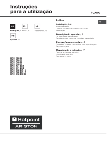 Instruções para a utilização PLANO Índice PT PL Português,1 Polski, 8 RS Ðóññêèé, 22 NL Nederlands,15 Instalação, 2-4 Posicionamento Ligação do plano de cozedura ao forno Eliminação Descrição do aparelho, 5 Os selectores de comando Regulação das zonas de cozedura extensíveis Precauções e conselhos, 6 Conselhos práticos para utilizar esta aparelhagem Segurança geral Manutenção e cuidados, 7 KRH 600 B KRH 600 X KRH 640 B KRH 640 X KRH 641 D B KRH 641 D X KRH 642 DO X KRH 642 DO Z KRH 642 DO B Desligar a corrente eléctrica Limpeza do aparelho Desmontar o plano PT Instalação consultá-lo a qualquer momento. No caso de venda, cessão ou mudança, assegure-se que o mesmo permanece com o aparelho para informar o novo proprietário sobre o funcionamento e sobre as respectivas advertências. Leia com atenção as instruções: há informações importantes sobre a instalação, a utilização e a segurança. 5 mm É importante guardar este folheto para poder min. 20 mm CASSETTO min. 40 mm Posicionamento As embalagens não são brinquedos para as 590 0 52 /- 0+ 56 0+ /- 1 1 49 Ventilação Para consentir uma adequada ventilação e para evitar o superaquecimento das superfícies ao redor do aparelho, o plano de cozedura deve ser posicionado: a uma distância mínima de 40 mm da parede de trás ou de quaisquer outras superfícies verticais; de forma a manter uma distância mínima de 20 mm entre o vão para o encaixe e o móvel abaixo dele. 2 FORNO VENTILATO min. 40 mm PIANO DI APPOGGIO PIANO COTTURA ROVESCIATO 30 LATO ANTERIORE DEL PIANO COTTURA 40 Encaixe Para garantir um bom funcionamento do aparelho é necessário que o móvel seja de características adequadas. o material do plano de apoio deve resistir a uma temperatura de aproximadamente 100ºC; se desejar instalar o plano de cozedura sobre um forno, este deve ser equipado com de um sistema de arrefecimento com ventilação forçada; evite instalar o plano de cozedura sobre uma máquina de lavar louça: se for faze-lo, instale um elemento de separação entre os dois aparelhos com retenção hermética; conforme o plano de cozedura que desejar instalar (veja figuras), o vão do móvel deverá ter as seguintes dimensões: min. 20 mm 5 mm crianças e devem ser eliminadas em conformidade com as regras de colecta diferenciada (veja em Precauções e Conselhos). A instalação deve ser realizada segundo estas instruções e por pessoal profissional qualificado. Uma instalação errada pode causar danos a pessoas, animais ou objectos. 53 PT Os móveis situados ao lado, com altura superior aquela do plano de trabalho, devem ser situados ao menos 600 mm do bordo do mesmo plano. KRH 600 B - KRH 600 X - KRH 640 B - KRH 640 X PT PLANO DE ENCAIXAR Fixação A instalação do aparelho deve ser realizada sobre uma superfície de apoio perfeitamente plana. As deformações eventualmente provocadas por uma fixação errada poderão alterar as características e as performances do plano de cozedura. O comprimento do parafuso de regulação dos ganchos de fixação deve ser configurado antes da sua montagem, conforme a espessura do plano de apoio: 30 mm de espessura: parafuso 23 mm; 40 mm de espessura: parafuso 13 mm. Para a fixação proceder da seguinte maneira: 1. Com os parafusos sem ponta, parafusar as 4 molas de centragem nos furos colocados no centro de cada lado do plano; 2. introduza o plano de cozedura no vão do móvel a exercer uma adequada pressão no inteiro perímetro para o plano de cozedura prender-se perfeitamente no plano de apoio. 3. para os planos com perfis laterais: após ter inserido o plano de cozedura no móvel, inserir os 4 ganchos de fixação (cada um com o seu perno) no perímetro inferior do plano de cozedura, parafusando-os com os parafusos compridos com ponta até que o vidro fique aderente ao plano de apoio. BRANCO VERMELHO AMARELO AZUL VERDE FOGÃO DE ENCAIXAR KRH 641 D B - KRH 641 D X - KRH 642 DO X - KRH 642 DO Z - KRH 642 DO B PLANO DE ENCAIXAR É indispensável que os parafusos das molas de centragem sejam acessíveis. Em conformidade com as normas de segurança, depois de instalar o aparelho encaixado, não deve ser possível o contacto com componentes eléctricos. Todos os componentes de garantia da protecção precisam estar presos de modo que não possam ser tirados sem o emprego de uma ferramenta. Ligação do plano de cozedura ao forno AZUL BRANCO VERMELHO AMARELO VERDE Este aparelho pode funcionar unicamente se estiver ligado a fornos específicos, há uma lista destes no sobrescrito da documentação. FOGÃO DE ENCAIXAR 3 Este aparelho é em conformidade com as seguintes Directivas da Comunidade Europeia: PT - 2006/95/CEE de 12/12/06 (Baixa Tensão) e posteriores modificações - 89/336/CEE de 03/05/89 (Compatibilidade Electromagnética) e posteriores modificações - 93/68/CEE de 22/07/93 e posteriores modificações. 4 Eliminação Eliminação do material de embalagem: obedeça as regras locais, de maneira que as embalagens possam ser reutilizadas. A directiva Europeia 2002/96/CE relativa aos resíduos de equipamentos eléctricos e electrónicos (REEE) prevê que os electrodomésticos não devem ser eliminados no normal fluxo dos resíduos sólidos urbanos. Os aparelhos não mais utilizados devem ser recolhidos separadamente para optimizar a taxa de recuperação e reciclagem dos materiais que os compõem e impedir potenciais danos à saúde e ao meio ambiente. O símbolo da lixeira cancelada está indicado em todos os produtos para lembrar o dever de colecta selectiva. Para maiores informações sobre a correcta eliminação dos electrodomésticos, os proprietários poderão contactar o serviço de colecta público ou os revendedores. Descrição do aparelho Nestas tabelas estão indicados, modelo por modelo, os valores de absorção energética, o tipo de elemento aquecedor e o diâmetro de cada zona de cozedura. Planos de cozedura Zonas de cozedura Traseiro esq. Traseiro dir