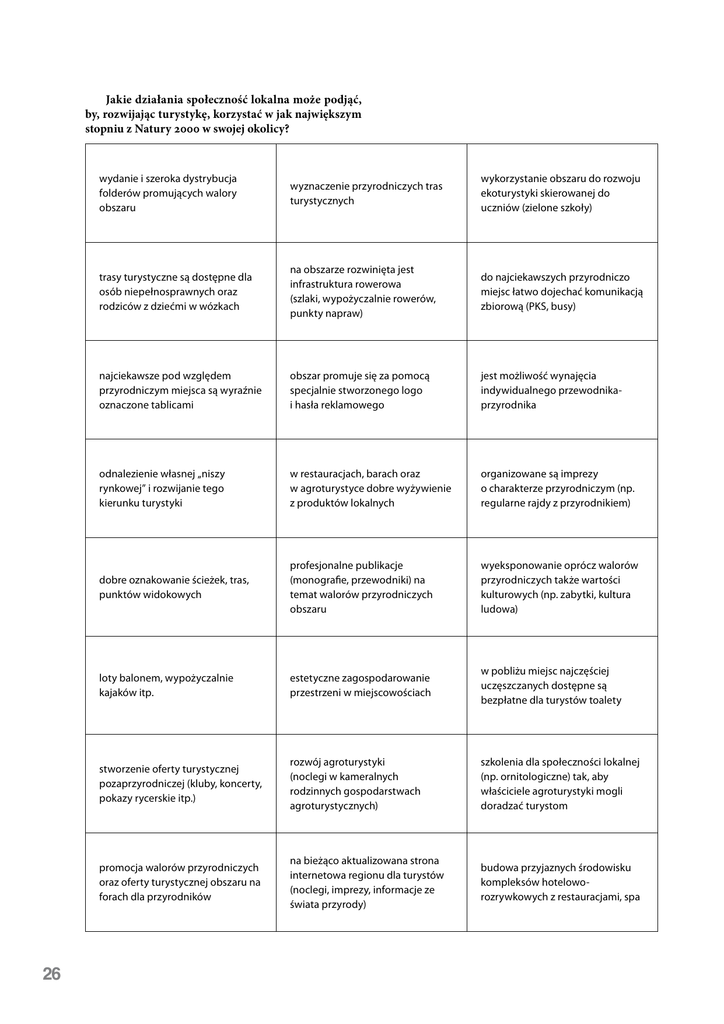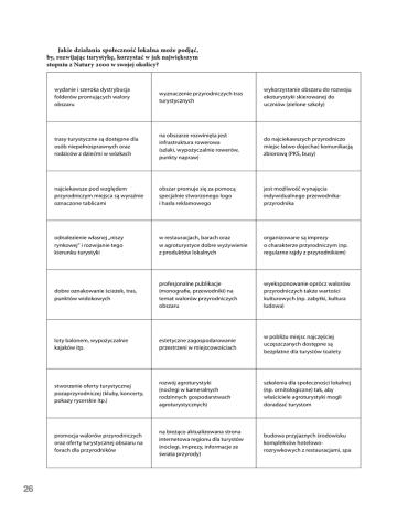 Jakie działania społeczność lokalna może podjąć, by, rozwijając turystykę, korzystać w jak największym stopniu z Natury 2000 w swojej okolicy? 26 wydanie i szeroka dystrybucja folderów promujących walory obszaru wyznaczenie przyrodniczych tras turystycznych wykorzystanie obszaru do rozwoju ekoturystyki skierowanej do uczniów (zielone szkoły) trasy turystyczne są dostępne dla osób niepełnosprawnych oraz rodziców z dziećmi w wózkach na obszarze rozwinięta jest infrastruktura rowerowa (szlaki, wypożyczalnie rowerów, punkty napraw) do najciekawszych przyrodniczo miejsc łatwo dojechać komunikacją zbiorową (PKS, busy) najciekawsze pod względem przyrodniczym miejsca są wyraźnie oznaczone tablicami obszar promuje się za pomocą specjalnie stworzonego logo i hasła reklamowego jest możliwość wynajęcia indywidualnego przewodnikaprzyrodnika odnalezienie własnej „niszy rynkowej” i rozwijanie tego kierunku turystyki w restauracjach, barach oraz w agroturystyce dobre wyżywienie z produktów lokalnych organizowane są imprezy o charakterze przyrodniczym (np. regularne rajdy z przyrodnikiem) dobre oznakowanie ścieżek, tras, punktów widokowych profesjonalne publikacje (monografie, przewodniki) na temat walorów przyrodniczych obszaru wyeksponowanie oprócz walorów przyrodniczych także wartości kulturowych (np. zabytki, kultura ludowa) loty balonem, wypożyczalnie kajaków itp. estetyczne zagospodarowanie przestrzeni w miejscowościach w pobliżu miejsc najczęściej uczęszczanych dostępne są bezpłatne dla turystów toalety stworzenie oferty turystycznej pozaprzyrodniczej (kluby, koncerty, pokazy rycerskie itp.) rozwój agroturystyki (noclegi w kameralnych rodzinnych gospodarstwach agroturystycznych) szkolenia dla społeczności lokalnej (np. ornitologiczne) tak, aby właściciele agroturystyki mogli doradzać turystom promocja walorów przyrodniczych oraz oferty turystycznej obszaru na forach dla przyrodników na bieżąco aktualizowana strona internetowa regionu dla turystów (noclegi, imprezy, informacje ze świata przyrody) budowa przyjaznych środowisku kompleksów hoteloworozrywkowych z restauracjami, spa 3 3 3 2 2 3 3 1 2 2 3 1 1 3 2 2 1 3 3 2 3 2 3 3 27