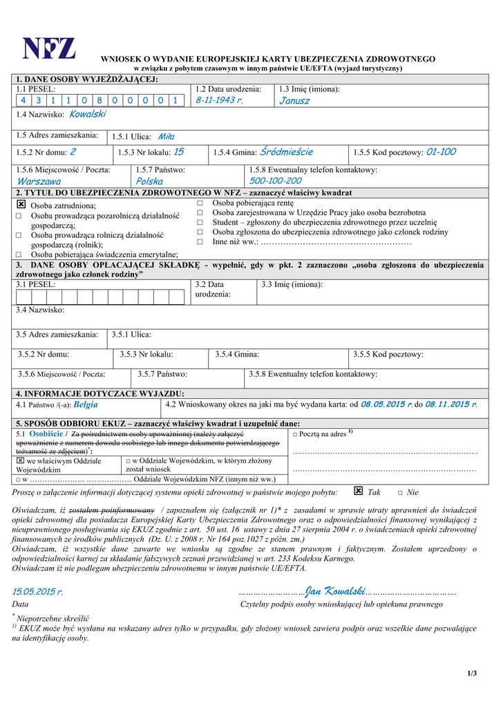 WNIOSEK O WYDANIE EUROPEJSKIEJ KARTY UBEZPIECZENIA ZDROWOTNEGO w związku z pobytem czasowym w innym państwie UE/EFTA (wyjazd turystyczny) 1. DANE OSOBY WYJEŻDŻAJĄCEJ: 1.1 PESEL: 4 3 1 1 0 8 0 0 0 0 1.2 Data urodzenia: 1 8-11-1943 r. 1.4 Nazwisko: Kowalski 1.5 Adres zamieszkania: 1.5.2 Nr domu: 2 1.5.6 Miejscowość / Poczta: Warszawa 1.3 Imię (imiona): Janusz 1.5.1 Ulica: Miła 1.5.3 Nr lokalu: 15 1.5.7 Państwo: Polska 1.5.4 Gmina: Śródmieście 1.5.5 Kod pocztowy: 01-100 1.5.8 Ewentualny telefon kontaktowy: 500-100-200 2. TYTUŁ DO UBEZPIECZENIA ZDROWOTNEGO W NFZ – zaznaczyć właściwy kwadrat □ Osoba pobierająca rentę Osoba zatrudniona; □ Osoba zarejestrowana w Urzędzie Pracy jako osoba bezrobotna □ Osoba prowadząca pozarolniczą działalność □ Student – zgłoszony do ubezpieczenia zdrowotnego przez uczelnię gospodarczą; □ Osoba zgłoszona do ubezpieczenia zdrowotnego jako członek rodziny □ Osoba prowadząca rolniczą działalność □ Inne niż ww.: ……………………………………………… gospodarczą (rolnik); □ Osoba pobierająca świadczenia emerytalne; 3. DANE OSOBY OPŁACAJĄCEJ SKŁADKĘ - wypełnić, gdy w pkt. 2 zaznaczono „osoba zgłoszona do ubezpieczenia zdrowotnego jako członek rodziny” 3.1 PESEL: 3.2 Data 3.3 Imię (imiona): urodzenia: 3.4 Nazwisko: 3.5 Adres zamieszkania: 3.5.2 Nr domu: 3.5.6 Miejscowość / Poczta: 3.5.1 Ulica: 3.5.3 Nr lokalu: 3.5.7 Państwo: 3.5.4 Gmina: 3.5.5 Kod pocztowy: 3.5.8 Ewentualny telefon kontaktowy: 4. INFORMACJE DOTYCZACE WYJAZDU: 4.2 Wnioskowany okres na jaki ma być wydana karta: od 08.05.2015 r. do 08.11.2015 r. 4.1 Państwo /(-a): Belgia 5. SPOSÓB ODBIORU EKUZ – zaznaczyć właściwy kwadrat i uzupełnić dane: 1) 5.1 Osobiście / Za pośrednictwem osoby upoważnionej (należy załączyć □ Pocztą na adres upoważnienie z numerem dowodu osobistego lub innego dokumentu potwierdzającego tożsamość ze zdjęciem)*: □ w Oddziale Wojewódzkim, w którym złożony we właściwym Oddziale został wniosek Wojewódzkim □ w …………………. ……………… Oddziale Wojewódzkim NFZ (innym niż ww.) ….……………………………………………………………. ….…………………………………………………………… Proszę o załączenie informacji dotyczącej systemu opieki zdrowotnej w państwie mojego pobytu: Tak □ Nie Oświadczam, iż zostałem poinformowany / zapoznałem się (załącznik nr 1)* z zasadami w sprawie utraty uprawnień do świadczeń opieki zdrowotnej dla posiadacza Europejskiej Karty Ubezpieczenia Zdrowotnego oraz o odpowiedzialności finansowej wynikającej z nieuprawnionego posługiwania się EKUZ zgodnie z art. 50 ust. 16 ustawy z dnia 27 sierpnia 2004 r. o świadczeniach opieki zdrowotnej finansowanych ze środków publicznych (Dz. U. z 2008 r. Nr 164 poz.1027 z późn. zm.) Oświadczam, iż wszystkie dane zawarte we wniosku są zgodne ze stanem prawnym i faktycznym. Zostałem uprzedzony o odpowiedzialności karnej za składanie fałszywych zeznań przewidzianej w art. 233 Kodeksu Karnego. Oświadczam iż nie podlegam ubezpieczeniu zdrowotnemu w innym państwie UE/EFTA. 15.05.2015 r. Data Jan Kowalski ……………………… ………………………………. Czytelny podpis osoby wnioskującej lub opiekuna prawnego * Niepotrzebne skreślić EKUZ może być wysłana na wskazany adres tylko w przypadku, gdy złożony wniosek zawiera podpis oraz wszelkie dane pozwalające na identyfikację osoby. 1) 1/3 EKUZ odebrałem/łam w dniu ………………………. Podpis ………………………………… DODATKOWE INFORMACJE: Wniosek o wydanie Europejskiej Karty Ubezpieczenia Zdrowotnego powinien być złożony w oddziale wojewódzkim Narodowego Funduszu Zdrowia właściwym ze względu na zadeklarowany we wniosku adres zamieszkania osoby wnioskującej. EKUZ wydawana jest wyłącznie osobom, które zostały zgłoszone do ubezpieczenia w NFZ. Brak zgłoszenia skutkuje koniecznością przeprowadzenia dodatkowej weryfikacji prawa do świadczeń zdrowotnych przed wydaniem karty. Wnioskodawca, dla którego OW NFZ nie może potwierdzić faktu posiadania prawa do świadczeń na koszt NFZ w celu uzyskania EKUZ w związku z wyjazdem na pobyt czasowy do innego państwa UE/EFTA (np. wyjazd turystyczny, wizyta u rodziny), powinien okazać przy składaniu wniosku następujące dokumenty potwierdzające ubezpieczenie zdrowotne w NFZ, np.: 1. Pracownik – np. aktualne zaświadczenia płatnika składek (wystawione przez pracodawcę), ZUS RMUA z ostatniego okresu; 2. Osoba prowadząca pozarolniczą działalność gospodarczą – np. aktualne zaświadczenia z ZUS o niezaleganiu w opłacaniu składek, dowód wpłaty; 3. Osoba prowadząca rolniczą działalność gospodarczą – aktualne zaświadczenie z KRUS o podleganiu ubezpieczeniu zdrowotnemu w NFZ; 4. Emeryt – legitymacja emerytalna, odcinek emerytury, 5. Rencista – legitymacja rencisty, legitymacja rencisty SOC (renta socjalna), decyzja o przyznaniu renty okresowej ze wskazaniem dat; 6. Osoba, która zawarła dobrowolne ubezpieczenie zdrowotne - dowód wpłaty składek za cały okres trwania umowy o dobrowolnym ubezpieczeniu zdrowotnym lub zaświadczenie z ZUS o niezaleganiu w opłaceniu składek na dobrowolne ubezpieczenie zdrowotne; 7. Osoba zarejestrowana w Urzędzie Pracy jako osoba bezrobotna – aktualne zaświadczenie z Urzędu Pracy; 8. Student zgłoszony do ubezpieczenia przez uczelnię – ZUS RMUA, aktualne zaświadczenie płatnika składek; 9. Osoba zgłoszona jako członek rodziny jednej z ww.: Legitymacja studencka / uczniowska w przypadku dzieci do 26 r.ż. Dokument potwierdzający zgłoszenie ww. członka do ubezpieczenia druk ZUS ZCNA Dokument potwierdzający ubezpieczenie głównego ubezpieczonego, odpowiednio, jeden z wymienionych w pkt. 1-7. UWAGA Podjęcie pracy w innym państwie UE/EFTA co do zasady skutkuje utratą prawa do korzystania z EKU