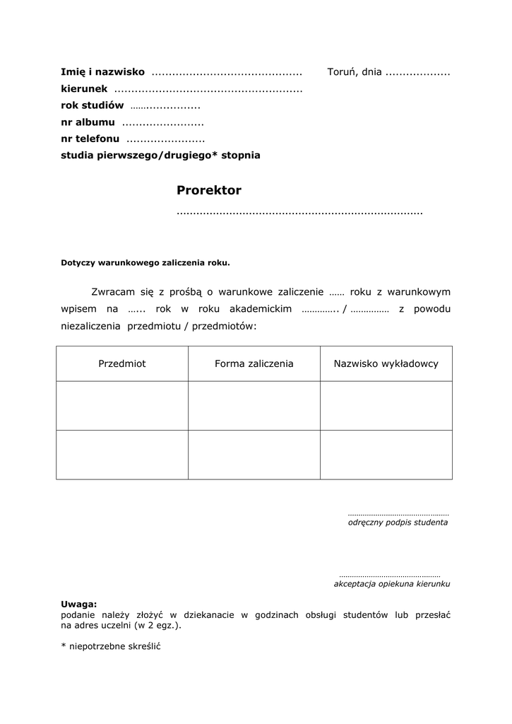 Imię i nazwisko ............................................ Toruń, dnia ................... kierunek ....................................................... rok studiów ……................ nr albumu ........................ nr telefonu ....................... studia pierwszego/drugiego* stopnia Prorektor ………………………………………………………………… Dotyczy warunkowego zaliczenia roku. Zwracam się z prośbą o warunkowe zaliczenie …… roku z warunkowym wpisem na …... rok w roku akademickim ………….. / …………… z powodu niezaliczenia przedmiotu / przedmiotów: Przedmiot Forma zaliczenia Nazwisko wykładowcy ………………………………………… odręczny podpis studenta ………………………………………… akceptacja opiekuna kierunku Uwaga: podanie należy złożyć w dziekanacie w godzinach obsługi studentów lub przesłać na adres uczelni (w 2 egz.). * niepotrzebne skreślić