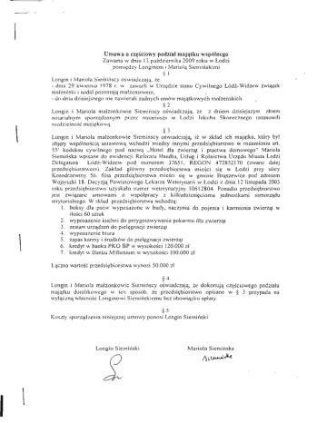 Umowa o częściowy podział majątku wspólnego Zawarta w dniu 13 października 2009 roku w Łodzi pomiędzy Longinem i Mariolą Siemińskimi §1 Longin i Mariola Siemińscy oświadczają, że: - dnia 29 kwietnia 1978 r. w zawarli w Urzędzie stanu Cywilnego Łódź-Widzew związek małżeński i nadal pozostają małżeństwem, - do dnia dzisiejszego nie zawierali żadnych umów majątkowych małżeńskich. §2 Longin i Mariola małżonkowie Siemińscy oświadczają, że z dniem dzisiejszym aktem notarialnym sporządzonym przez notariusza w Łodzi Jakuba Skonecznego ustanowili rozdzielność majątkową. §3 Longin i Mariola małżonkowie Siemińscy oświadczają, iż w skład ich majątku, który był objęty wspólnością ustawową wchodzi miedzy innymi przedsiębiorstwo w rozumieniu art. 55' kodeksu cywilnego pod nazwą „Hotel dla zwierząt i ptactwa domowego" Mariola Siemińska wpisane do ewidencji Referatu Handlu, Usług i Rolnictwa Urzędu Miasta Łodzi Delegatura Łódź-Widzew pod numerem 37651, REGON 472852170 (zwane dalej przedsiębiorstwem). Zakład główny przedsiębiorstwa mieści się w Łodzi przy ulicy Kosodrzewiny 56. filia przedsiębiorstwa mieści się w gminie Brąszewice pod adresem Wojtyszki 18. Decyzją Powiatowego Lekarza Weterynarii w Łodzi z dnia 12 listopada 2003 roku przedsiębiorstwo uzyskało numer weterynaryjny 10612804. Ponadto przedsiębiorstwo jest związane umowami o współpracy z kilkudziesięcioma jednostkami samorządu terytorialnego. W skład przedsiębiorstwa wchodzą: 1. boksy dla psów wyposażone w budy, naczynia do pojenia i karmienia zwierząt w ilości 60 sztuk 2. wyposażenie kuchni do przygotowywania pokarmu dla zwierząt 3. zestaw urządzeń do pielęgnacji zwierząt 4. wyposażenie biura 5. zapas karmy i środków do pielęgnacji zwierząt 6. kredyt w banku PKO BP w wysokości 120.000 zł 7. kredyt w Banku Millenium w wysokości 100.000 zł Łączna wartość przedsiębiorstwa wynosi 50.000 zł §4 Longin i Mariola małżonkowie Siemińscy oświadczają, że dokonują częściowego podziału majątku dorobkowego w ten sposób, że przedsiębiorstwo opisane w § 3 przypada na wyłączną własność Longinowi Siemińskiemu bez obowiązku spłaty. §5 Koszty sporządzenia niniejszej umowy ponosi Longin Siemiński Longin Siemiński Mariola Siemińska Hotel dla zwierząt Łódź - Schronisko Łódź. 2z3 Menu strony Strona Główna O Nas Aktualności Nowo przybyłe psy i koty Pogotowie Galeria http://hotelzwierzat.com/regulamin.php Regulamin hotelu Wyszukaj: Jest to wewnętrzny regulamin naszej placówki. w opisie: "Hotel dla Zwierząt" Longin Siemiński, Łódź ul. Kosodrzewiny 56 1. Zgłoszenie wyjazdu do bezdomnego zwierzęcia odbierane jest od uprawnionych pracowników urzędów miast i gmin lub funkcjonariuszy Policji i Straży Miejskiej. Wideo 2. Pracownik urzędu lub funkcjonariusz zgłaszający zwierzę do odłapania powinien podać miejsce jego przebywania, opis zwierzęcia oraz dane kontaktowe do osoby, która może je wskazać. Kontakt 3. Wyjazd do zwierzęcia następuje po telefonicznym kontakcie z osobą wskazującą. Zapamiętane 4. Transport odbywa się samochodem przystosowanym do przewozu zwierząt towarzyszących, zaopatrzonym w klatki. Regulamin Hotelu Adopcje Psy do adopcji Koty do adopcji Regulamin adopcji nr chipu: rodzaj: Wszystkie wiek: Wszystkie płeć: Wszystkie lokalizacja: Łódź i Wojtyszki wyszukaj Polecane adopcje: 5. Zespół wyjeżdżający do bezdomnego zwierzęcia stanowią lekarze weterynarii bądź technik weterynarii wraz z kierowcą posiadającym certyfikat na konwojowanie i transport zwierząt oraz zezwolenie na używanie pneumatycznego karabinka "Palmer", wydane przez Komendanta Miejskiego w Łodzi. 6. W przypadku powiadomienia Hotelu o nadmiernej agresywności odłapywanego psa, dozowaniem środków ogólnie znieczulających zajmuje się lekarz weterynarii. 7. W przypadku odłapania zwierzęcia, które pokąsało człowieka, obserwacja pod kątem wystąpienia objawów wścieklizny będzie przeprowadzona na terenie powiatu, gdzie zwierzę zostało odłapane i na terenie którego nastąpiło pokąsanie, pod warunkiem, że na w/w terenie znajduje się placówka uprawniona i gotowa na jego przyjącie. 8. Nowoprzybyłe zwierzęta poddawane są badaniu klinicznemu przez lekarza weterynarii, zostają zachipowane poprzez iniekcję podskórną w lewą stronę szyi w jej środkowej części oraz jeśli nie wykazują żadnych objawów chorobowych, poddawane są podskórnemu szczepieniu przeciwko chorobom zakaźnym (bez wścieklizny) oraz odrobaczone. 9. W przypadku zwierząt, u których w wyniku badania klinicznego lekarz weterynarii stwierdził objawy chorobowe lub zmiany niepozwalające na szczepienia profilaktyczne, zwierzęta te poddawane są odpowiedniemu leczeniu. Po zakończeniu tegoż poddawane są w/w procedurze. Imie: 982061600041929 Płeć: samica Wiek: ok 1 roku Wesoła, bardzo energiczna, przyjacielska sunia. Nie potrafi jeszcze chodzić na smyczy. więcej... 10. Zwierzę zostaje poddanie 15-dniowej kwarantannie w przeznaczonym do jej przeprowadzania boksie, pod ścisłą opieką lekarzy weterynarii. 11. Po okresie kwarantanny zwierzę zostaje zaszczepione iniekcją podskórną przeciwko wściekliźnie i zostaje umieszczone w boksie odpowiednio dobranym dla jego płci, wzrostu oraz stopnia agresywności. 12. Nowoprzybyłe zwierzęta są fotografowane, a ich zdjęcia umieszczane są przy "karcie zwierzęcia" . 13. Zwierzęta są przyuczane do chodzenia na smyczy oraz do wykonywania podstawowych komend przez zoootechnika, który dokonuje również zabiegów higienicznych (czesanie, strzyżenie, kąpiel) i kosmetycznych (przycinanie pazurów, przemywanie spojówek, czyszczenie uszu) . Imie: 982061600048026 Płeć: samiec Wiek: 14. Po upływie 15 dni od dnia przyjęcia zwierzęcia do danego boksu następuje jego kastracja, gdy stan zwierzęcia na to pozwala po pewnym czasie jest transportowane