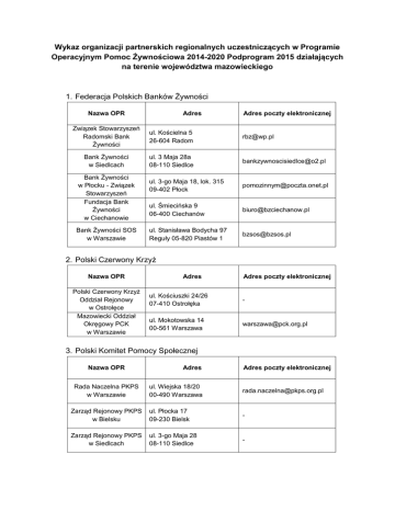Wykaz organizacji partnerskich regionalnych uczestniczących w Programie Operacyjnym Pomoc Żywnościowa 2014-2020 Podprogram 2015 działających na terenie województwa mazowieckiego 1. Federacja Polskich Banków Żywności Nazwa OPR Adres Adres poczty elektronicznej Związek Stowarzyszeń Radomski Bank Żywności ul. Kościelna 5 26-604 Radom [email protected] Bank Żywności w Siedlcach ul. 3 Maja 28a 08-110 Siedlce [email protected] ul. 3-go Maja 18, lok. 315 09-402 Płock [email protected] ul. Śmiecińska 9 06-400 Ciechanów [email protected] ul. Stanisława Bodycha 97 Reguły 05-820 Piastów 1 [email protected] Bank Żywności w Płocku - Związek Stowarzyszeń Fundacja Bank Żywności w Ciechanowie Bank Żywności SOS w Warszawie 2. Polski Czerwony Krzyż Nazwa OPR Polski Czerwony Krzyż Oddział Rejonowy w Ostrołęce Mazowiecki Oddział Okręgowy PCK w Warszawie Adres Adres poczty elektronicznej ul. Kościuszki 24/26 07-410 Ostrołęka - ul. Mokotowska 14 00-561 Warszawa [email protected] 3. Polski Komitet Pomocy Społecznej Nazwa OPR Rada Naczelna PKPS w Warszawie Adres Adres poczty elektronicznej ul. Wiejska 18/20 00-490 Warszawa [email protected] Zarząd Rejonowy PKPS w Bielsku ul. Płocka 17 09-230 Bielsk - Zarząd Rejonowy PKPS w Siedlcach ul. 3-go Maja 28 08-110 Siedlce -