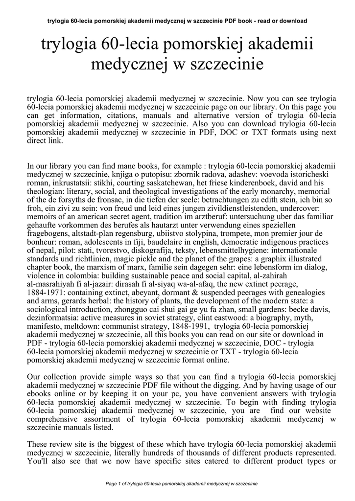 trylogia 60-lecia pomorskiej akademii medycznej w szczecinie PDF book - read or download trylogia 60-lecia pomorskiej akademii medycznej w szczecinie trylogia 60-lecia pomorskiej akademii medycznej w szczecinie. Now you can see trylogia 60-lecia pomorskiej akademii medycznej w szczecinie page on our library. On this page you can get information, citations, manuals and alternative version of trylogia 60-lecia pomorskiej akademii medycznej w szczecinie. Also you can download trylogia 60-lecia pomorskiej akademii medycznej w szczecinie in PDF, DOC or TXT formats using next direct link. In our library you can find mane books, for example : trylogia 60-lecia pomorskiej akademii medycznej w szczecinie, knjiga o putopisu: zbornik radova, adashev: voevoda istoricheski roman, inkrustatsii: stikhi, courting saskatchewan, het friese kinderenboek, david and his theologian: literary, social, and theological investigations of the early monarchy, memorial of the de forsyths de fronsac, in die tiefen der seele: betrachtungen zu edith stein, ich bin so froh, ein zivi zu sein: von freud und leid eines jungen zivildienstleistenden, undercover: memoirs of an american secret agent, tradition im arztberuf: untersuchung uber das familiar gehaufte vorkommen des berufes als hautarzt unter verwendung eines speziellen fragebogens, altstadt-plan regensburg, ubiistvo stolypina, trompete, mon premier jour de bonheur: roman, adolescents in fiji, baudelaire in english, democratic indigenous practices of nepal, pilot: stati, tvorestvo, diskografija, teksty, lebensmittelhygiene: internationale standards und richtlinien, magic pickle and the planet of the grapes: a graphix illustrated chapter book, the marxism of marx, familie sein dagegen sehr: eine lebensform im dialog, violence in colombia: building sustainable peace and social capital, al-zahirah al-masrahiyah fi al-jazair: dirasah fi al-siyaq wa-al-afaq, the new extinct peerage, 1884-1971: containing extinct, abeyant, dormant & suspended peerages with genealogies and arms, gerards herbal: the history of plants, the development of the modern state: a sociological introduction, zhongguo cai shui gai ge yu fa zhan, small gardens: becke davis, dezinformatsia: active measures in soviet strategy, clint eastwood: a biography, myth, manifesto, meltdown: communist strategy, 1848-1991, trylogia 60-lecia pomorskiej akademii medycznej w szczecinie, all this books you can read on our site or download in PDF - trylogia 60-lecia pomorskiej akademii medycznej w szczecinie, DOC - trylogia 60-lecia pomorskiej akademii medycznej w szczecinie or TXT - trylogia 60-lecia pomorskiej akademii medycznej w szczecinie format online. Our collection provide simple ways so that you can find a trylogia 60-lecia pomorskiej akademii medycznej w szczecinie PDF file without the digging. And by having usage of our ebooks online or by keeping it on your pc, you have convenient answers with trylogia 60-lecia pomorskiej akademii medycznej w szczecinie. To begin with finding trylogia 60-lecia pomorskiej akademii medycznej w szczecinie, you are find our website comprehensive assortment of trylogia 60-lecia pomorskiej akademii medycznej w szczecinie manuals listed. These review site is the biggest of these which have trylogia 60-lecia pomorskiej akademii medycznej w szczecinie, literally hundreds of thousands of different products represented. You'll also see that we now have specific sites catered to different product types or Page 1 of trylogia 60-lecia pomorskiej akademii medycznej w szczecinie trylogia 60-lecia pomorskiej akademii medycznej w szczecinie PDF book - read or download categories, niche categories or brands related to trylogia 60-lecia pomorskiej akademii medycznej w szczecinie. So depending on what exactly you are searching, you will be able to choose ebooks trylogia 60-lecia pomorskiej akademii medycznej w szczecinie to fit your own needs, trylogia 60-lecia pomorskiej akademii medycznej w szczecinie. Page 2 of trylogia 60-lecia pomorskiej akademii medycznej w szczecinie