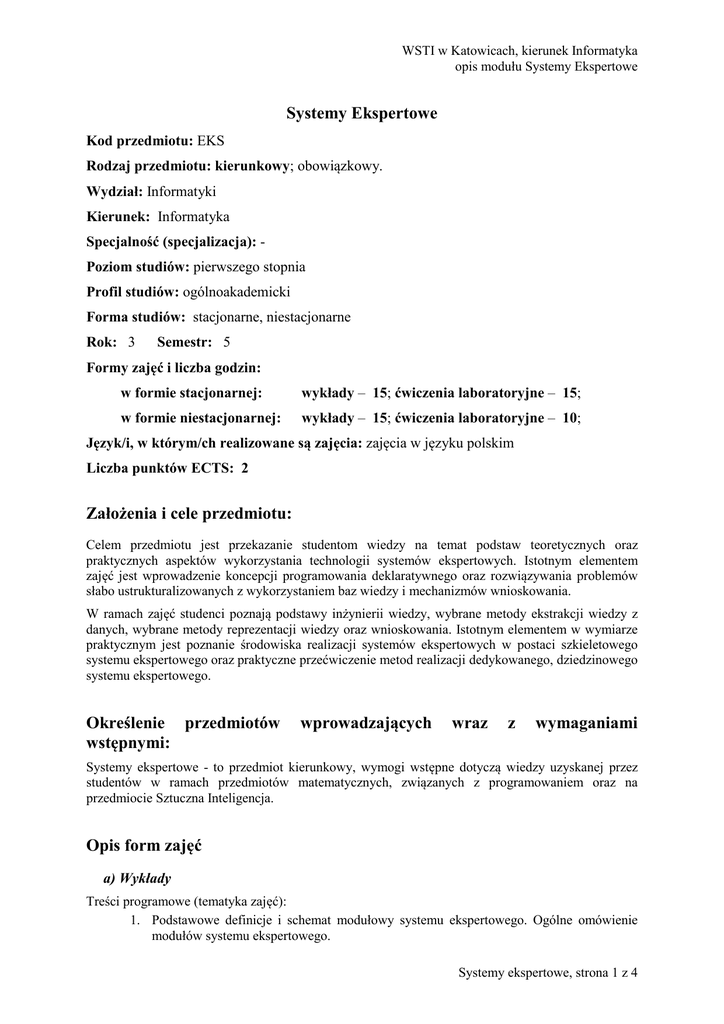 WSTI w Katowicach, kierunek Informatyka opis modułu Systemy Ekspertowe Systemy Ekspertowe Kod przedmiotu: EKS Rodzaj przedmiotu: kierunkowy; obowiązkowy. Wydział: Informatyki Kierunek: Informatyka Specjalność (specjalizacja): Poziom studiów: pierwszego stopnia Profil studiów: ogólnoakademicki Forma studiów: stacjonarne, niestacjonarne Rok: 3 Semestr: 5 Formy zajęć i liczba godzin: w formie stacjonarnej: wykłady – 15; ćwiczenia laboratoryjne – 15; w formie niestacjonarnej: wykłady – 15; ćwiczenia laboratoryjne – 10; Język/i, w którym/ch realizowane są zajęcia: zajęcia w języku polskim Liczba punktów ECTS: 2 Założenia i cele przedmiotu: Celem przedmiotu jest przekazanie studentom wiedzy na temat podstaw teoretycznych oraz praktycznych aspektów wykorzystania technologii systemów ekspertowych. Istotnym elementem zajęć jest wprowadzenie koncepcji programowania deklaratywnego oraz rozwiązywania problemów słabo ustrukturalizowanych z wykorzystaniem baz wiedzy i mechanizmów wnioskowania. W ramach zajęć studenci poznają podstawy inżynierii wiedzy, wybrane metody ekstrakcji wiedzy z danych, wybrane metody reprezentacji wiedzy oraz wnioskowania. Istotnym elementem w wymiarze praktycznym jest poznanie środowiska realizacji systemów ekspertowych w postaci szkieletowego systemu ekspertowego oraz praktyczne przećwiczenie metod realizacji dedykowanego, dziedzinowego systemu ekspertowego. Określenie przedmiotów wstępnymi: wprowadzających wraz z wymaganiami Systemy ekspertowe - to przedmiot kierunkowy, wymogi wstępne dotyczą wiedzy uzyskanej przez studentów w ramach przedmiotów matematycznych, związanych z programowaniem oraz na przedmiocie Sztuczna Inteligencja. Opis form zajęć a) Wykłady Treści programowe (tematyka zajęć): 1. Podstawowe definicje i schemat modułowy systemu ekspertowego. Ogólne omówienie modułów systemu ekspertowego. Systemy ekspertowe, strona 1 z 4 WSTI w Katowicach, kierunek Informatyka opis modułu Systemy Ekspertowe 2. Metody reprezentacji wiedzy – pojęcia podstawowe, reprezentacje wiedzy w bazach wiedzy. 3. Tablice decyzyjne jako podstawowa reprezentacja wiedzy. Zasada tworzenia tablic decyzyjnych. 4. Badanie spójności tablicy decyzyjnej i metody usuwania niespójności z wykorzystaniem teorii zbiorów przybliżonych. 5. Pozyskiwanie wiedzy z danych — generowanie reguł decyzyjnych. Algorytmy tworzenia reguł decyzyjnych. 6. Metody wnioskowania. Dowodzenie celu. Wnioskowanie w tył, wnioskowanie w przód, wnioskowanie mieszane. 7. Reguły produkcji jako sposób zapisu wiedzy. Regułowe bazy wiedzy. 8. Reprezentacje grafowe baz wiedzy. Probabilistyczne bazy wiedzy. Sieci Bayes’a. Współczynniki pewności. 9. Algorytmy wnioskowania dla baz wiedzy o różnych reprezentacjach. Metody dydaktyczne: Wykład prowadzony metodą tradycyjną z wykorzystaniem rzutnika multimedialnego, obejmować będą prezentację przykładów oraz ich dyskusje z aktywnym uczestnictwem studentów. Forma i warunki zaliczenia: Warunkiem zaliczenia całości przedmiotu jest zdanie egzaminu w formie wymaganej właściwą siatką studiów. Literatura podstawowa: 1. Cholewa W., Pedrycz W.: Systemy doradcze – Skrypt uczelniany Politechniki Śląskiej nr 1447, Gliwice 1987. 2. Gantar E., Stąpor K.: Prolog. Język sztucznej inteligencji – PLJ, Warszawa 1991. 3. Mulawka J.: Systemy ekspertowe – WNT, Warszawa 1996. 4. Pawlak Z.: Rough Sets - Theoretical aspects of reasoning about data – Kluwer Academic Publishers, Boston 1991. b) Ćwiczenia laboratoryjne Treści programowe (tematyka zajęć): 1. Tablice decyzyjne. Analiza tablicy decyzyjnej (badanie spójności, kompletności, sprzeczności). Dyskretyzacja tablicy decyzyjnej. 2. Tworzenie macierzy rozróżnialności. Obliczanie reduktów i jądra z definicji i macierzy rozróżnialności. 3. Generowanie reguł decyzyjnych z tablic decyzyjnych. 4. Demonstracja i wykorzystanie istniejących systemów ekspertowych (PC-shell i inne). 5. Pozyskiwanie wiedzy od eksperta. Przygotowanie własnej eksperymentalnej bazy wiedzy. 6. Reguły produkcji. Tworzenie eksperymentalnej, regułowej bazy wiedzy. 7. Analiza metod wnioskowania. Analiza działania systemu wyjaśnień. Weryfikacja poprawności regałowej bazy wiedzy. 8. Realizacja dziedzinowego systemu ekspertowego — projekt własny. Metody dydaktyczne: Ćwiczenia prowadzone w laboratorium komputerowym obejmują praktyczną realizację eksperymentalnych fragmentów systemu ekspertowego i realizację konkretnych procesów wnioskowania. Forma i warunki zaliczenia: Warunkiem zaliczenia przedmiotu jest uzyskanie pozytywnych ocen z zadań kontrolnych sprawdzających opanowanie wiedzy i umiejętności właściwych dla każdego bloku tematycznego. Systemy ekspertowe, strona 2 z 4 WSTI w Katowicach, kierunek Informatyka opis modułu Systemy Ekspertowe • • Wykaz literatury podstawowej: 1. Fedrizzi M., Kacprzyk J.: Advances in the Dempster - Shafer Theory of Evidence 193 - 236 – New York, Wiley 1994 r. 2. Grzymała-Busse J.: Managing Uncertainty in Expert Systems – Kluwer Academic Publishers, Boston 1991. Wykaz literatury uzupełniająca: 1. Czasopisma informatyczne. 2. Zasoby sieci Internet. Zakładane efekty kształcenia Efekty kształcenia dla modułu: Systemy Ekspertowe nr EKS_W_01 EKS_W_02 EKS_W_03 EKS_U_01 EKS_U_02 EKS_U_03 EKS_K_01 EKS_K_02 Opis: student: … rozumie koncepcje rozwiązywania problemów z wykorzystaniem baz wiedzy i wnioskowania. … posiada wiedzę na temat metod, technik i narzędzi realizacji dziedzinowych systemów ekspertowych. … zna koncepcję eksploracji danych oraz podstawowe metody praktycznej realizacji procesu eksploracji danych. … potrafi przeprowadzić proces akwizycji, kodyfikacji i zapisywania wiedzy w bazie wiedzy systemu ekspertowego. … potrafi realizować proste, dziedzinowe systemy ekspertowe bazując na wybranych narzędziach. … potrafi przeprowadzić proces eksploracji danych z wykorzystaniem wy