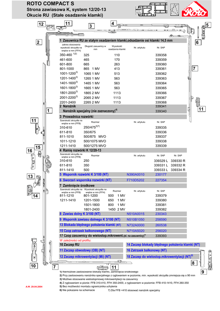 ROTO COMPACT S Strona zawiasowa K, system 12/20-13 Okucie RU (Stałe osadzenie klamki) 11 12 4 3 5 1 Zasuwnica RU ze stałym osadzeniem klamki,odsadzenie osi klamki 14,5 mm 2 zakres stosowania wysokość skrzydła na wrębie w mm (FFH) 1)2) 350-460 461-600 601-800 801-1000 1001-12003) 1201-14003) 1401-16003) 1601-18003) 1801-20003) 2001-22003) 2201-2400 Długość zasuwnicy w mm Wysokość osadzenia klamki 325 465 665 865 1 MV 1065 1 MV 1265 1 MV 1465 1 MV 1665 1 MV 1865 2 MV 2065 2 MV 2265 2 MV Nr. artykułu 110 170 263 413 513 563 563 563 1113 1113 1113 339358 339359 339360 339361 339362 339363 339364 339365 339366 339367 339368 339341 339340 2 Narożnik Narożnik specjalny (nie zaznaczony)4) 1 6 Nr. SAP 7 11 3 Prowadnica rozwórki 11 16 Szerokość skrzydła na wrębie w mm (FFB) 310-610 611-810 811-1010 1011-1210 1211-1410 15 Rozmiar Nr. artykułu 5)7) 250/475 350/675 500/875 MVO 500/1075 MVO 500/1275 MVO Nr. SAP 339335 339336 339337 339338 339339 4 Ramię rozwórki K 12/20-13 Szerokość skrzydła na wrębie w mm (FFB) 310-610 611-810 811-1410 13 Rozmiar Nr. artykułu 250 350 500 5 Wspornik rozwórki K 3/100 (NT) N390A0010 6 Sworzeń wspornika rozwórki (NT) F710D5202 Nr. SAP Nr. SAP 339329 L 339330 R 339331 L 339332 R 339333 L 339334 R 230177 227354 7 Zamknięcie środkowe Szerokość skrzydła na Wysokość skrzydła na wrębie w mm (FFB) wrębie w mm (FFH) 14 811-1210 1211-1410 801-1200 1201-1500 1501-1800 1801-2400 Rozmiar 500 650 800 1450 Nr. artykułu 1 MV 1 MV 1 MV 2 MV Nr. SAP 8 Zawias dolny K 3/100 (NT) N510A0015 339379 339380 339381 339382 230343 9 Wspornik zawiasu dolnego K 3/100 (NT) 13 Blokada błędnego położenia klamki (NT) N510B1050 258590 N732A0000 260538 15 Czop zatrzask balkonowego (NT) N710A5020 17 Czop zasuwnicy do wielostop.mikrowent.(el. na zasuwnicy)6) 256020 339393 W zależności od profilu: 10 A.W. 29.04.2004 7 10 Zaczep RU 14 Zaczep blokady błędnego położenia klamki (NT) 11 Zaczep obwodowy (OB) (NT) 16 Zatrzask balkonowy (NT) 12 Zaczep mikrowentylacji (Mi) (NT) 18 Zaczep do wielostop.mikrowentylacji (NT)6) 8 11 1) Niemożliwe zastosowanie blokady klamki, zamknięcia środkowego 2) Przy zastosowaniu narożnika specjalnego z ryglowaniem w poziomie, min. wysokość skrzydła zmniejsza się o 90 mm 3) Możliwe stosowanie wielostopniowej mikrowentylacji na zasuwnicy 4) Z ryglowaniem w pionie: FFB 310-410, FFH 350-2400, z ryglowaniem w poziomie: FFB 410-1410, FFH 260-350 5) Bez możliwości montażu ogranicznika uchylenia 6) Nie pokazane na schemacie 7) Dla FFB <410 stosować narożnik specjalny 9