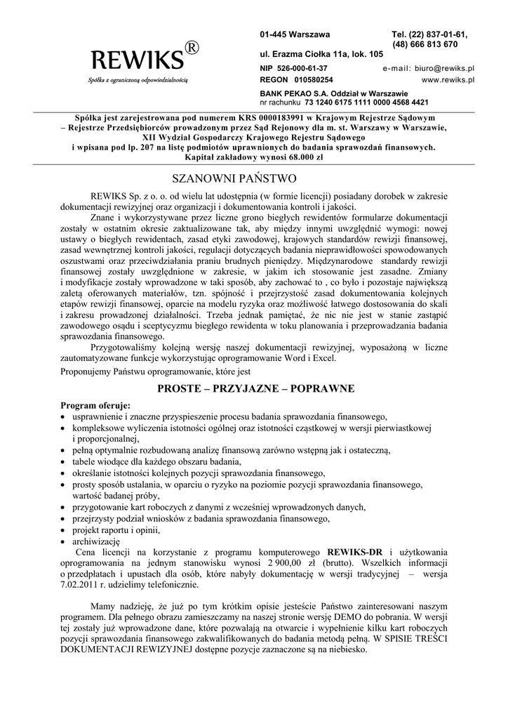 01-445 Warszawa ® REWIKS Spółka z ograniczoną odpowiedzialnością Tel. (22) 837-01-61, (48) 666 813 670 ul. Erazma Ciołka 11a, lok. 105 NIP 526-000-61-37 REGON 010580254 e - m a i l : [email protected] www.rewiks.pl BANK PEKAO S.A. Oddział w Warszawie nr rachunku 73 1240 6175 1111 0000 4568 4421 Spółka jest zarejestrowana pod numerem KRS 0000183991 w Krajowym Rejestrze Sądowym – Rejestrze Przedsiębiorców prowadzonym przez Sąd Rejonowy dla m. st. Warszawy w Warszawie, XII Wydział Gospodarczy Krajowego Rejestru Sądowego i wpisana pod lp. 207 na listę podmiotów uprawnionych do badania sprawozdań finansowych. Kapitał zakładowy wynosi 68.000 zł SZANOWNI PAŃSTWO REWIKS Sp. z o. o. od wielu lat udostępnia (w formie licencji) posiadany dorobek w zakresie dokumentacji rewizyjnej oraz organizacji i dokumentowania kontroli i jakości. Znane i wykorzystywane przez liczne grono biegłych rewidentów formularze dokumentacji zostały w ostatnim okresie zaktualizowane tak, aby między innymi uwzględnić wymogi: nowej ustawy o biegłych rewidentach, zasad etyki zawodowej, krajowych standardów rewizji finansowej, zasad wewnętrznej kontroli jakości, regulacji dotyczących badania nieprawidłowości spowodowanych oszustwami oraz przeciwdziałania praniu brudnych pieniędzy. Międzynarodowe standardy rewizji finansowej zostały uwzględnione w zakresie, w jakim ich stosowanie jest zasadne. Zmiany i modyfikacje zostały wprowadzone w taki sposób, aby zachować to , co było i pozostaje największą zaletą oferowanych materiałów, tzn. spójność i przejrzystość zasad dokumentowania kolejnych etapów rewizji finansowej, oparcie na modelu ryzyka oraz możliwość łatwego dostosowania do skali i zakresu prowadzonej działalności. Trzeba jednak pamiętać, że nic nie jest w stanie zastąpić zawodowego osądu i sceptycyzmu biegłego rewidenta w toku planowania i przeprowadzania badania sprawozdania finansowego. Przygotowaliśmy kolejną wersję naszej dokumentacji rewizyjnej, wyposażoną w liczne zautomatyzowane funkcje wykorzystując oprogramowanie Word i Excel. Proponujemy Państwu oprogramowanie, które jest PROSTE – PRZYJAZNE – POPRAWNE Program oferuje: • usprawnienie i znaczne przyspieszenie procesu badania sprawozdania finansowego, • kompleksowe wyliczenia istotności ogólnej oraz istotności cząstkowej w wersji pierwiastkowej i proporcjonalnej, • pełną optymalnie rozbudowaną analizę finansową zarówno wstępną jak i ostateczną, • tabele wiodące dla każdego obszaru badania, • określanie istotności kolejnych pozycji sprawozdania finansowego, • prosty sposób ustalania, w oparciu o ryzyko na poziomie pozycji sprawozdania finansowego, wartość badanej próby, • przygotowanie kart roboczych z danymi z wcześniej wprowadzonych danych, • przejrzysty podział wniosków z badania sprawozdania finansowego, • projekt raportu i opinii, • archiwizację Cena licencji na korzystanie z programu komputerowego REWIKS-DR i użytkowania oprogramowania na jednym stanowisku wynosi 2 900,00 zł (brutto). Wszelkich informacji o przedpłatach i upustach dla osób, które nabyły dokumentację w wersji tradycyjnej – wersja 7.02.2011 r. udzielimy telefonicznie. Mamy nadzieję, że już po tym krótkim opisie jesteście Państwo zainteresowani naszym programem. Dla pełnego obrazu zamieszczamy na naszej stronie wersję DEMO do pobrania. W wersji tej zostały już wprowadzone dane, które pozwalają na otwarcie i wypełnienie kilku kart roboczych pozycji sprawozdania finansowego zakwalifikowanych do badania metodą pełną. W SPISIE TREŚCI DOKUMENTACJI REWIZYJNEJ dostępne pozycje zaznaczone są na niebiesko.