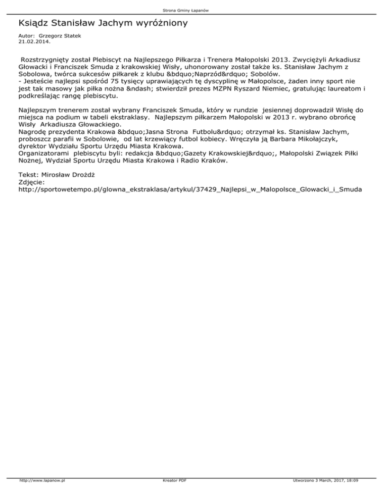 Strona Gminy Łapanów Ksiądz Stanisław Jachym wyróżniony Autor: Grzegorz Statek 21.02.2014. Rozstrzygnięty został Plebiscyt na Najlepszego Piłkarza i Trenera Małopolski 2013. Zwyciężyli Arkadiusz Głowacki i Franciszek Smuda z krakowskiej Wisły, uhonorowany został także ks. Stanisław Jachym z Sobolowa, twórca sukcesów piłkarek z klubu „Naprzód” Sobolów. - Jesteście najlepsi spośród 75 tysięcy uprawiających tę dyscyplinę w Małopolsce, żaden inny sport nie jest tak masowy jak piłka nożna – stwierdził prezes MZPN Ryszard Niemiec, gratulując laureatom i podkreślając rangę plebiscytu. Najlepszym trenerem został wybrany Franciszek Smuda, który w rundzie jesiennej doprowadził Wisłę do miejsca na podium w tabeli ekstraklasy. Najlepszym piłkarzem Małopolski w 2013 r. wybrano obrońcę Wisły Arkadiusza Głowackiego. Nagrodę prezydenta Krakowa „Jasna Strona Futbolu” otrzymał ks. Stanisław Jachym, proboszcz parafii w Sobolowie, od lat krzewiący futbol kobiecy. Wręczyła ją Barbara Mikołajczyk, dyrektor Wydziału Sportu Urzędu Miasta Krakowa. Organizatorami plebiscytu byli: redakcja „Gazety Krakowskiej”, Małopolski Związek Piłki Nożnej, Wydział Sportu Urzędu Miasta Krakowa i Radio Kraków. Tekst: Mirosław Drożdż Zdjęcie: http://sportowetempo.pl/glowna_ekstraklasa/artykul/37429_Najlepsi_w_Malopolsce_Glowacki_i_Smuda http://www.lapanow.pl Kreator PDF Utworzono 3 March, 2017, 18:09