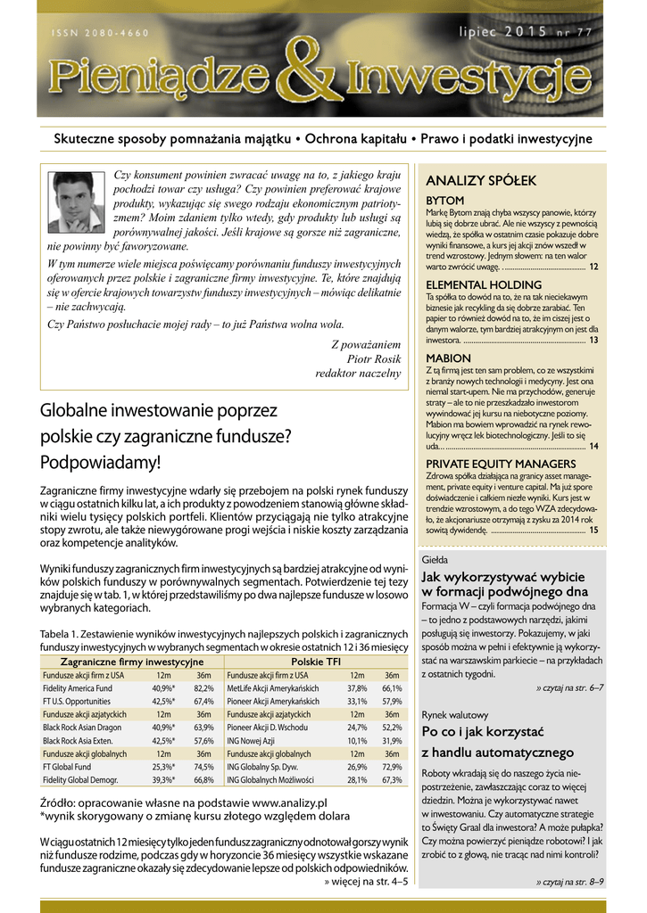 Skuteczne sposoby pomnażania majątku • Ochrona kapitału • Prawo i podatki inwestycyjne Czy konsument powinien zwracać uwagę na to, z jakiego kraju pochodzi towar czy usługa? Czy powinien preferować krajowe produkty, wykazując się swego rodzaju ekonomicznym patriotyzmem? Moim zdaniem tylko wtedy, gdy produkty lub usługi są porównywalnej jakości. Jeśli krajowe są gorsze niż zagraniczne, nie powinny być faworyzowane. W tym numerze wiele miejsca poświęcamy porównaniu funduszy inwestycyjnych oferowanych przez polskie i zagraniczne firmy inwestycyjne. Te, które znajdują się w ofercie krajowych towarzystw funduszy inwestycyjnych – mówiąc delikatnie – nie zachwycają. Czy Państwo posłuchacie mojej rady – to już Państwa wolna wola. Z poważaniem Piotr Rosik redaktor naczelny Globalne inwestowanie poprzez polskie czy zagraniczne fundusze? Podpowiadamy! Wyniki funduszy zagranicznych firm inwestycyjnych są bardziej atrakcyjne od wyników polskich funduszy w porównywalnych segmentach. Potwierdzenie tej tezy znajduje się w tab. 1, w której przedstawiliśmy po dwa najlepsze fundusze w losowo wybranych kategoriach. Tabela 1. Zestawienie wyników inwestycyjnych najlepszych polskich i zagranicznych funduszy inwestycyjnych w wybranych segmentach w okresie ostatnich 12 i 36 miesięcy Zagraniczne firmy inwestycyjne 12m 40,9%* 42,5%* 12m 40,9%* 42,5%* 12m 25,3%* 39,3%* 36m 82,2% 67,4% 36m 63,9% 57,6% 36m 74,5% 66,8% Polskie TFI Fundusze akcji firm z USA MetLife Akcji Amerykańskich Pioneer Akcji Amerykańskich Fundusze akcji azjatyckich Pioneer Akcji D. Wschodu ING Nowej Azji Fundusze akcji globalnych ING Globalny Sp. Dyw. ING Globalnych Możliwości BYTOM Markę Bytom znają chyba wszyscy panowie, którzy lubią się dobrze ubrać. Ale nie wszyscy z pewnością wiedzą, że spółka w ostatnim czasie pokazuje dobre wyniki finansowe, a kurs jej akcji znów wszedł w trend wzrostowy. Jednym słowem: na ten walor warto zwrócić uwagę. ........................................... 12 ELEMENTAL HOLDING Ta spółka to dowód na to, że na tak nieciekawym biznesie jak recykling da się dobrze zarabiać. Ten papier to również dowód na to, że im ciszej jest o danym walorze, tym bardziej atrakcyjnym on jest dla inwestora. . ............................................................. 13 MABION Z tą firmą jest ten sam problem, co ze wszystkimi z branży nowych technologii i medycyny. Jest ona niemal start-upem. Nie ma przychodów, generuje straty — ale to nie przeszkadzało inwestorom wywindować jej kursu na niebotyczne poziomy. Mabion ma bowiem wprowadzić na rynek rewolucyjny wręcz lek biotechnologiczny. Jeśli to się uda… ....................................................................... 14 PRIVATE EQUITY MANAGERS Zagraniczne firmy inwestycyjne wdarły się przebojem na polski rynek funduszy w ciągu ostatnich kilku lat, a ich produkty z powodzeniem stanowią główne składniki wielu tysięcy polskich portfeli. Klientów przyciągają nie tylko atrakcyjne stopy zwrotu, ale także niewygórowane progi wejścia i niskie koszty zarządzania oraz kompetencje analityków. Fundusze akcji firm z USA Fidelity America Fund FT U.S. Opportunities Fundusze akcji azjatyckich Black Rock Asian Dragon Black Rock Asia Exten. Fundusze akcji globalnych FT Global Fund Fidelity Global Demogr. ANALIZY SPÓŁEK 12m 37,8% 33,1% 12m 24,7% 10,1% 12m 26,9% 28,1% 36m 66,1% 57,9% 36m 52,2% 31,9% 36m 72,9% 67,3% Źródło: opracowanie własne na podstawie www.analizy.pl *wynik skorygowany o zmianę kursu złotego względem dolara W ciągu ostatnich 12 miesięcy tylko jeden fundusz zagraniczny odnotował gorszy wynik niż fundusze rodzime, podczas gdy w horyzoncie 36 miesięcy wszystkie wskazane fundusze zagraniczne okazały się zdecydowanie lepsze od polskich odpowiedników. » więcej na str. 4–5 Zdrowa spółka działająca na granicy asset management, private equity i venture capital. Ma już spore doświadczenie i całkiem niezłe wyniki. Kurs jest w trendzie wzrostowym, a do tego WZA zdecydowało, że akcjonariusze otrzymają z zysku za 2014 rok sowitą dywidendę. ................................................. 15 Giełda Jak wykorzystywać wybicie w formacji podwójnego dna Formacja W — czyli formacja podwójnego dna — to jedno z podstawowych narzędzi, jakimi posługują się inwestorzy. Pokazujemy, w jaki sposób można w pełni i efektywnie ją wykorzystać na warszawskim parkiecie — na przykładach z ostatnich tygodni. » czytaj na str. 6—7 Rynek walutowy Po co i jak korzystać z handlu automatycznego Roboty wkradają się do naszego życia niepostrzeżenie, zawłaszczając coraz to więcej dziedzin. Można je wykorzystywać nawet w inwestowaniu. Czy automatyczne strategie to Święty Graal dla inwestora? A może pułapka? Czy można powierzyć pieniądze robotowi? I jak zrobić to z głową, nie tracąc nad nimi kontroli? » czytaj na str. 8—9 AKTUALNOŚCI Fundusz dywidendowy (niemal) dla każdego Od kilku lat na polskim rynku można zaobserwować tendencję inwestorów do poszukiwania inwestycji wypłacających okresowy dochód, niebędących jednocześnie obligacjami. W efekcie spółki chętniej zaczęły dzielić się zyskami, a część firm asset management uruchomiło odpowiednie strategie. Jednak dopiero teraz mniej zamożni inwestorzy mogą skorzystać z tego typu rozwiązania. Zaoferowało je KBC TFI. SZYMON JUSZCZYK doradca inwestycyjny nr 520 KBC BETA Dywidendowy SFIO powstał poprzez zmianę strategii inwestycyjnej wcześniejszego KBC BETA SFIO. Ma on charakter funduszu akcyjnego, w którym przynajmniej 70% wartości aktywów będą stanowiły instrumenty udziałowe. Co ważne, nie tylko te notowane na GPW w Warszawie, ale także na rynkach Europy Zachodniej oraz w Stanach Zjednoczonych, co oznacza, że klienci w części będą narażeni na ryzyko walutowe. Przy wyborze instrumentów zarządzający będzie się kierował częstotliwością i w