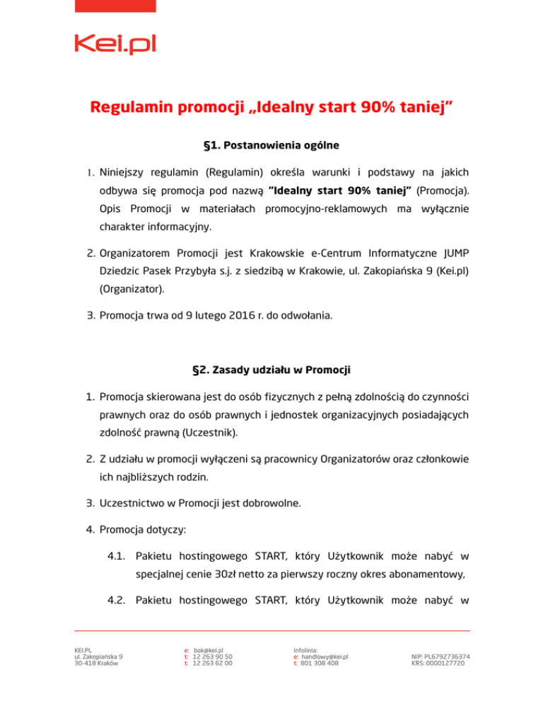 Regulamin promocji „Idealny start 90% taniej” §1. Postanowienia ogólne 1. Niniejszy regulamin (Regulamin) określa warunki i podstawy na jakich odbywa się promocja pod nazwą "Idealny start 90% taniej" (Promocja). Opis Promocji w materiałach promocyjno-reklamowych ma wyłącznie charakter informacyjny. 2. Organizatorem Promocji jest Krakowskie e-Centrum Informatyczne JUMP Dziedzic Pasek Przybyła s.j. z siedzibą w Krakowie, ul. Zakopiańska 9 (Kei.pl) (Organizator). 3. Promocja trwa od 9 lutego 2016 r. do odwołania. §2. Zasady udziału w Promocji 1. Promocja skierowana jest do osób fizycznych z pełną zdolnością do czynności prawnych oraz do osób prawnych i jednostek organizacyjnych posiadających zdolność prawną (Uczestnik). 2. Z udziału w promocji wyłączeni są pracownicy Organizatorów oraz członkowie ich najbliższych rodzin. 3. Uczestnictwo w Promocji jest dobrowolne. 4. Promocja dotyczy: 4.1. Pakietu hostingowego START, który Użytkownik może nabyć w specjalnej cenie 30zł netto za pierwszy roczny okres abonamentowy, 4.2. Pakietu hostingowego START, który Użytkownik może nabyć w specjalnej cenie 31 zł netto za pierwszy roczny okres abonamentowy wraz z domeną. Domeny objęte promocją wymienione zostały w pkt. 5.1, 4.3. Pakietu hostingowego PRO, który Użytkownik może nabyć w specjalnej cenie 40zł netto za pierwszy roczny okres abonamentowy, 4.4. Pakietu hostingowego PRO, który Użytkownik może nabyć w specjalnej cenie 41zł netto za pierwszy roczny okres abonamentowy wraz z domeną. Domeny objęte promocją wymienione zostały w pkt. 5.1, 4.5. Pakietu hostingowego PREMIUM, który Użytkownik może nabyć w specjalnej cenie 60zł netto za pierwszy roczny okres abonamentowy, 4.6. Pakietu hostingowego PREMIUM, który Użytkownik może nabyć w specjalnej cenie 61zł netto za pierwszy roczny okres abonamentowy wraz z domeną. Domeny objęte promocją wymienione zostały w pkt. 5.1. 5. Promocja obejmuje wyłącznie: 5.1. rejestrację nowych domen: .pl, .com.pl, net.pl, .com, .net, .org, .eu, 5.2. pierwszy abonament roczny pakietów hostingowych. 6. Promocji nie można łączyć z innymi ofertami promocyjnymi, ofertami specjalnymi itp. chyba, że warunki poszczególnych ofert promocyjnych stanowią inaczej. 7. Przedłużenie konta hostingowego zakupionego w promocji „Idealny start 90% taniej” na kolejny okres abonamentowy odbywa się według aktualnego cennika Organizatora. 8. Opłaty dotyczące Rejestracji oraz przedłużenia domen zawiera cennik zamieszczony na stronie internetowej Kei.pl http://www.kei.pl/domeny/cennik 9. Skorzystanie z Promocji wymaga akceptacji Regulaminu. §3. Warunki Promocji 1. Uczestnik samodzielnie decyduje o wyborze pakietu hostingowego dostępnego w Promocji spośród wersji udostępnionych na stronie internetowej. 2. Udostępniane w Promocji pakiety hostingowe, a w szczególności ich rodzaj, parametry i ceny mogą ulec zmianie w czasie trwania Promocji. 3. Oferta ulega unieważnieniu w przypadku, gdy okaże się, że jest niezgodna z prawem. 4. Oferta może zostać zmieniona lub odwołana przez Kei.pl z przyczyn technicznoorganizacyjnych, przy czym zmiana nie może pogorszyć warunków udziału Uczestników, którzy skorzystali z Promocji. §4. Postanowienia końcowe 1. Regulamin Promocji może ulec zmianie w czasie jej trwania, przy czym zmiany w Regulaminie nie mogą naruszać praw nabytych przez Uczestników Promocji przed dokonaniem zmiany. Zmiany Regulaminu obowiązują od dnia zamieszczenia zmienionego Regulaminu na stronie internetowej Kei.pl, na której umieszcza się informację o Promocji. 2. Powyższy regulamin określa zasady promocji "Idealny start 90% taniej". 3. W sprawach nieuregulowanych stosuje się postanowienia: 3.1. "Regulaminu świadczenia usług hostingowych Kei.pl" http://static.kei.pl/bundles/keiwebsite/pdf/regulamin-hosting.pdf 3.2. „Regulaminu świadczenia usług rejestracji i utrzymania nazw domen internetowych przez Kei.pl" http://static.kei.pl/bundles/keiwebsite/pdf/regulamin-domeny.pdf 4. Organizator Promocji nie bierze odpowiedzialności za ewentualne kwestie sporne powstałe z winy osób trzecich. 5. Regulamin wchodzi w życie z dniem 9 lutego 2016 roku. 6. Regulamin będzie dostępny do wglądu w czasie trwania Promocji w siedzibie Kei.pl oraz na stronie internetowej Kei.pl.