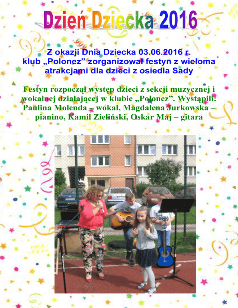 Z okazji Dnia Dziecka 03.06.2016 r. klub „Polonez” zorganizował festyn z wieloma atrakcjami dla dzieci z osiedla Sady Festyn rozpoczął występ dzieci z sekcji muzycznej i wokalnej działającej w klubie „Polonez”. Wystąpili: Paulina Molenda – wokal, Magdalena Jurkowska – pianino, Kamil Zieliński, Oskar Maj – gitara Paulina Molenda wykonała piosenki Zuzia lalka nieduża oraz Teksański> Magdalena Jurkowska zaprezentowała 3 utwory Trzy kurki, Walczyk lalki oraz Mało nas do pieczenia chleba. Następnie wystąpił duet gitarowy w składzie: Oskar Maj oraz Kamil Zieliński, który wykonał utwory Oh Suzannah, She’ll be coming round the mountain oraz Scarborough fair Po części artystycznej dzieci brały udział w konkursach z nagrodami, przy których świetnie się bawiły Taniec z balonem Taniec na gazecie Slalom z woreczkiem na głowie Piłka górą… …piłka dołem Rzuty karne do mini bramki Bieg z przeszkodami Pod koniec festynu dzieci po wymagających konkurencjach sportowych jeszcze miały siły i chęci aby wziąć udział w zabawach muzyczno-ruchowych Kaczuszki