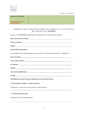 Załącznik nr 1 do Regulaminu NUMER UCZESTNIKA: Pole wypełnia Organizator podczas rejestracji FORMULARZ ZGŁOSZENIOWY DO UDZIAŁU W CASTINGU D O M U S I C A L U „PINOKIO” Prosimy o CZYTELNE uzupełnienie wszystkich pozycji w poniższym formularzu: Imię i nazwisko uczestnika : _______________________________________________________ Wiek uczestnika: ________________________________________________________________ Szkoła: ________________________________________________________________________ DANE KONTAKTOWE: (w przypadku osoby niepełnoletniej, prosimy również o podanie danych Rodzica / Opiekuna) Imię, Nazwisko: _________________________________________________________________ Adres zamieszkania: _____________________________________________________________ nr telefonu: ____________________________________________________________________ PESEL: _______________________________________________________________________ Adres korespondencyjny: ________________________________________________________ E-mail: ________________________________________________________________________ INFORMACJE DOTYCZĄCE PREZENTACJI UCZESTNIKA: □ Prezentacja wokalna / wokalno-aktorska Podaj autora i tytuł utworu, jaki wykonasz/ zaprezentujesz _______________________________________________________________________________ □ Prezentacja taneczna Podaj, jaki styl tańca zaprezentujesz _______________________________________________________________________________ 1 INFORMACJE O UCZESTNIKU Bardzo prosimy o dokładne i wnikliwe odpowiedzi na poniższe pytania. Aby dostać się do musicalu musisz pokonać bardzo wielu chętnych. Pamiętaj, że liczy się nie tylko talent, ale i osobowość! Napisz nam, proszę, parę słów o sobie. W razie potrzeby poproś o pomoc Rodziców lub Opiekunów. Czy i jak długo jesteś uczniem szkoły muzycznej lub w jakikolwiek inny sposób kształcisz się muzycznie. Jeśli tak, napisz, gdzie rozwijasz swój muzyczny talent. _____________________________________________________________________________________ Czy i jak długo jesteś członkiem zespołu tanecznego / szkoły tanecznej lub w jakikolwiek inny sposób zdobywasz umiejętności taneczne. Jeśli tak, napisz, gdzie rozwijasz swój taneczny talent. _____________________________________________________________________________________ Co Cię wyróżnia spośród innych rówieśników ? Jakie masz pasje, zainteresowania poza śpiewem / poza tańcem? _____________________________________________________________________________________ Czy masz jakieś szczególne osiągnięcia, którymi chciałbyś / chciałabyś się pochwalić? _____________________________________________________________________________________ Dlaczego chciałbyś / chciałabyś wziąć udział w naszym musicalu? _____________________________________________________________________________________ Skąd dowiedziałeś /dowiedziałaś się o castingu? _____________________________________________________________________________________ W musicalu „Pinokio” chcę wystąpić jako _________________________________________________ Podpis uczestnika lub rodzica / opiekuna*: ___________________ Wyrażam zgodę na przetwarzanie moich danych osobowych / danych osobowych mojego dziecka zawartych w powyższym formularzu dla potrzeb niezbędnych do realizacji Projektu Musical „Pinokio”, zgodnie z ustawą z dnia 29.08.1997 r. O ochronie danych osobowych (Dz. U. z 2015 r. poz. 2135 ze zm.). oświadczam, że zostałam poinformowany/a o przysługującym mi prawie wglądu i poprawiania moich danych osobowych. Miejsce i data: ________________ Podpis uczestnika lub rodzica / opiekuna*: ___________________ * rodzic / opiekun podpisuje w przypadku, gdy uczestnik nie ukończył 18 lat. 2