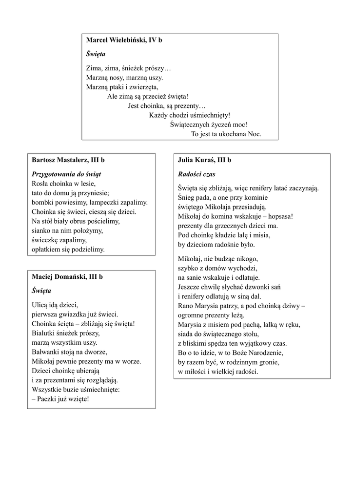 Marcel Wielebiński, IV b Święta Zima, zima, śnieżek prószy… Marzną nosy, marzną uszy. Marzną ptaki i zwierzęta, Ale zimą są przecież święta! Jest choinka, są prezenty… Każdy chodzi uśmiechnięty! Świątecznych życzeń moc! To jest ta ukochana Noc. Bartosz Mastalerz, III b Julia Kuraś, III b Przygotowania do świąt Rosła choinka w lesie, tato do domu ją przyniesie; bombki powiesimy, lampeczki zapalimy. Choinka się świeci, cieszą się dzieci. Na stół biały obrus pościelimy, sianko na nim położymy, świeczkę zapalimy, opłatkiem się podzielimy. Radości czas Maciej Domański, III b Święta Ulicą idą dzieci, pierwsza gwiazdka już świeci. Choinka ścięta – zbliżają się święta! Bialutki śnieżek prószy, marzą wszystkim uszy. Bałwanki stoją na dworze, Mikołaj pewnie prezenty ma w worze. Dzieci choinkę ubierają i za prezentami się rozglądają. Wszystkie buzie uśmiechnięte: – Paczki już wzięte! Święta się zbliżają, więc renifery latać zaczynają. Śnieg pada, a one przy kominie świętego Mikołaja przesiadują. Mikołaj do komina wskakuje – hopsasa! prezenty dla grzecznych dzieci ma. Pod choinkę kładzie lalę i misia, by dzieciom radośnie było. Mikołaj, nie budząc nikogo, szybko z domów wychodzi, na sanie wskakuje i odlatuje. Jeszcze chwilę słychać dzwonki sań i renifery odlatują w siną dal. Rano Marysia patrzy, a pod choinką dziwy – ogromne prezenty leżą. Marysia z misiem pod pachą, lalką w ręku, siada do świątecznego stołu, z bliskimi spędza ten wyjątkowy czas. Bo o to idzie, w to Boże Narodzenie, by razem być, w rodzinnym gronie, w miłości i wielkiej radości. Wiktoria Stasiak, III a Joanna Domańska, V b *** Prezenty Święta, święta – magiczny to czas! Rodzina z daleka przyjedzie do nas, By wspólnie kolędy śpiewać i się radować, Wszystkich potraw z nami skosztować. Jasno świeci się w pokoju – to choinki blask. Dzieci siedzą uśmiechnięte – to świąteczny czas. Listy do Mikołaja już dawno wysłane, teraz już tylko zostało czekanie. W salonie przystrojona choinka się świeci, Pod nią już szukają prezentów dzieci. Mama po kuchni jeszcze się krząta, A na zegarze wybiła już piąta. „Pierwsza gwiazdka na niebie świeci!” – wykrzykują z radością dzieci. Pora do stołu już siadać I wigilijne potrawy zajadać. Opłatkiem z rodziną się podzielić I wszyscy będą się weselić. Bo Dzieciątko Jezus się narodziło I w domach naszych zagościło. WESOŁYCH ŚWIĄT! Michał Chlebosz, III b Mikołaj Moc prezentów na nas czeka. I nikt nie jest smutny ani zły. Ktoś się skrada pod oknami, On na pewno coś dla nas ma. Łapie śnieżną gwiazdkę z nieba – Ach, jak cudnie mieni się. Jak on pięknie śmieje się, wszystkie dzieci cieszą się! Pierwszą gwiazdkę widać w oknie. Dzieci niecierpliwią się okropnie, bo chcą otworzyć prezenty, które zostawił pod choinką Mikołaj święty. Bartosz Sekuła, IV b Święta Biały śnieg już spadł Choinkę ubrać trzeba Bombki z kurzu wyczyścić Gwiazdkę na czubku zielonego drzewka zawiesić Wszyscy stają się dla siebie milsi Dzieci czekają na prezenty A wokół czuć atmosferę Bożego Narodzenia. Alicja Chlebosz, IV b Już czas Czas, już czas, bo choinka jest wśród nas. Hula wiatr, zamieć dmie, a pierniki pieką się. Och, jak pachnie świerkiem, makiem I grzybami w kuchni mamy. Na prezenty przyszedł czas – one zawsze cieszą nas. Klocki lego, lalki, misie… O czym jeszcze zamarzycie? A po cichu już się skrada nasz Mikołaj święty, który niesie nam prezenty! Maja Turczyn, III b Jest taki dzień Mróz pod nogami skrzypi dzień cały, a z nieba gęsto sypie śnieg biały. I jak co roku w ten wyjątkowy dzień pierwsza gwiazdka w oddali już lśni. Dzień najpiękniejszy dziś do nas zawitał, mama i tato w progu gości witają. Bo jak co roku, wszyscy się wokół stołu zbieramy i uroczystą kolację zjadamy. Nie może u nas zabraknąć nikogo, otwieramy furtkę nawet naszym wrogom. Miłość i szczęście w tym dniu u nas goszczą, nie może dzisiaj zabraknąć radości. Odchodząc od stołu, wpadam pod choinkę – tutaj w małym żłóbeczku Maryja tuli Dziecię; to dzięki Niemu ten dzień jest wspaniały, więc idę na pasterkę oddać Mu cześć i głosić chwałę. A w naszych sercach zaduma … Kochajmy się! Nie tylko tego wieczoru wyjątkowego, lecz bądźmy ludźmi dnia każdego. Natalia Skiba, IV b Magia świąt Bożego Narodzenia Cichy, radosny wieczór pachnący świerkami, który wspólnie spędzimy z ukochanymi rodzinami. Gdy pierwsza gwiazdka zaświeci na niebie, złożymy życzenia również i dla Ciebie. Święta Bożego Narodzenia jednoczą pokolenia, niosą wszystkim radość i miłość z narodzenia Jezusa Chrystusa w małym, skromnym żłóbku; to Dziecię przynosi nam wiarę i nadzieję na lepsze jutro. Cieszę się więc bardzo, że są tu i teraz, zrobię coś dobrego dla wszystkich i nie raz. Obdaruję dobrym słowem, prezentem od serca ciesząc się z bajecznej magii, jaka niosą nam zimowe święta. Magdalena Pigdanowicz, IV b Święta Mikołaj już w saniach jedzie, Dzieci nie zawiedzie. Mikołaj przez cały rok ciężko pracował… Dziś mu za wszystko dziękujemy, za niegrzeczność przepraszamy. Choinkę ubieramy, bombki wieszamy. Wraz z pierwszą gwiazdką do stołu siadamy i Wigilię zaczynamy. Kolędy śpiewamy, małego Jezuska bardzo kochamy.