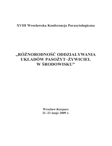 XVIII Wrocławska Konferencja Parazytologiczna „RÓŻNORODNOŚĆ ODDZIAŁYWANIA UKŁADÓW PASOŻYT–ŻYWICIEL W ŚRODOWISKU” Wrocław-Karpacz 21–23 maja 2009 r. Organizatorzy Zakład Parazytologii Uniwersytetu Wrocławskiego Zakład Parazytologii Uniwersytetu Warszawskiego Polskie Towarzystwo Parazytologiczne Komitet organizacyjny Przewodniczący prof. dr hab. Anna Okulewicz Wiceprzewodniczący prof. dr hab. Elżbieta Lonc prof. dr hab. Edward Siński prof. dr hab. Bożena Moskwa Sekretarz dr Joanna Hildebrand Konferencja współfinansowana ze środków projektu badawczego Uniwersytetu Wrocławskiego nr 2115/W/IGMI/08 Sponsorzy Państwowa Wyższa Szkoła Zawodowa im. Angelusa Silesiusa w Wałbrzychu Bayer Sp. z o.o. Animal Health Program konferencji 291 PROGRAM KONFERENCJI Czwartek – 21 maja 2009 Sesjaplenarna:9:45–10:45 Przewodniczący:prof.drhab. ElżbietaLonc,prof.drhab. Bożena Moskwa 1. Pasożyty – kłopotliwy element struktury sieci pokarmowej w ekosystemach TeresaPojmańska,Katarzyna Niewiadomska 2. Detecting interactions between parasites in cross sectional studies of wild rodent population JerzyM.Behnke 3. The ectoparasite community of the bank vole Myodesglareolus PhilipD.Harris,A.Paziewska,L.Zwolińska,E.Siński 4. Wpływ koinfekcji na transmisję przez kleszcze (Ixodidae) pasożytów krwi EdwardSiński 5. Zawleczone i niespecyficzne nicienie u żywicieli – przyczyny i skutki Anna Okulewicz Piątek – 22 maja 2009 SesjaI:9:00–10:45 Środowiskowe uwarunkowania w układzie pasożyt–żywiciel Przewodniczący:prof.drhab. Katarzyna Niewiadomska,prof.drhab. EdwardSiński 1. Występowanie Neosporacaninum u zwierząt w Polsce WładysławCabaj,Katarzyna Pastusiak,Justyna Bień,BożenaMoskwa 2. Cryptosporidium spp. i Giardia spp. – badania środowiskowe w Polsce AnnaBajer,MałgorzataBednarska,EdwardSiński 3. Kartowanie środowiskowych badań parazytologicznych na przykładzie Ixodesricinus DorotaKiewra,ElżbietaLonc,Katarzyna Rydzanicz 4. Procedury integrowanej kontroli wektorów parazytoz na przykładzie Wrocławia (Polska) i Cotonou (Zachodnia Afryka) KatarzynaRydzanicz,ElżbietaLonc,NorbertBecker 5. Przywry digenetyczne u mięczaków z rodziny Viviparidae na terenie Polski WitoldJeżewski,ZdzisławLaskowski 6. Larwy przywr z rodziny Echinostomatidae u słodkowodnych ślimaków Pojezierza Brodnickiego AnnaNowak,ElżbietaŻbikowska 7. Czyniki warunkujące i wpływające na rozmieszczenie i rozprzestrzenienie różnych form Anisakissimplex w rejonie Bałtyku ze szczególnym uwzględnieniem żywicieli pośrednich i ostatecznych-ssaków morskich JerzyRokicki,TytusKuczkowski 292 Program konferencji SesjaII:11:15–13:30 Dynamika zmian w układach pasożyt-żywiciel zwierząt lądowych Przewodniczący:drhab. Hanna Mizgajska-Wiktor,prof.AWF;prof. drJerzyM. Behnke 1. Lis rudy (Vulpesvulpes) jako rezerwuar gatunków zoonotycznych pasożytów AnnaBorecka, JakubGawor 2. Dynamika występowania Echinococcusmultilocularis u lisów rudych na terenie centralnej Polski JakubGawor,Anna Borecka 3. Poszukiwanie zróżnicowania genotypów Toxocaracanis i Toxascarisleonina pasożytujących u lisów i psów RenataFogt-Wyrwas,Hanna Mizgajska-Wiktor,JarosławPacoń 4. Helmintofauna wilka (Canislupus L.) w Polsce JustynaSzczęsna,MarcinPopiołek 5. The prevalence and intensity of gastro-intestinal parasites of the Polish primitive horse in Poland: epizootic analysis KaterynaSlivinska,JakubGawor,ZbigniewJaworski 6. Siedliskowa i żywicielska specyficzność występowania przywr digenetycznych w zgrupowaniach gryzoni JoannaHildebrand,GrzegorzZaleśny 7. Występowanie nicieni z rodzaju Syphacia (Oxyurida) we wrocławskich populacjach myszy GrzegorzZaleśny,Joanna Hildebrand 8. Różnorodność genetyczna bakterii z rodzaju Bartonella u drobnych gryzoni – epidemiologia molekularna AnnaPaziewska,PhilipD.Harris,RenataWelc-Falęciak,EdwardSiński 9. Wpływ glukuronozydów kwasu oleanolowego na poziomu białek CED-3 i CED-9 u wolno żyjących form Heligmosomoidespolygyrus KingaJóźwicka,WirginiaJaniszowska,MariaDoligalska Sesjaplakatowa:15:30–16:30 Przewodniczący:prof.drhab.TeresaPojmańska I. Nowe dla Polski gatunki nicieni z borsuka (Melesmeles L.) MarcinPopiołek,HubertJarnecki,TomaszŁuczyński II. Pierwsze stwierdzenie Molineuspatens (Dujardin, 1845) (Molineidae, Nematoda) u gronostaja (MustelaermineaL.) w Polsce HubertJarnecki, TomaszŁuczyński,MarcinPopiołek III.Występowanie motylicy wątrobowej (Fasciola hepatica) u bawołów wodnych (Bubalus bubalis) utrzymywanych na terenie Puszczy Noteckiej Paulina Kobak IV. Przypadek stwierdzenia nicienia Physocephalussexalatus (Molin, 1860) – pasożyta świniowatych – u krzyżówki Anasplatyrhynchos KatarzynaM.Kavetska,WitoldJeżewski,ElżbietaKalisińska,YuriyKuzmin Program konferencji V. 293 Nowo opisane układy pasożyt–żywiciel w trematodofaunie Melanittanigra (Linnaeus, 1758) z Zatoki Pomorskiej IzabellaRząd,JiljiSitko,Katarzyna Kavetska,ElżbietaKalisińska VI. Oddziaływanie żywicieli (Viviparidae) na metacerkarie Amblosomaexile WitoldJeżewski,ZdzisławLaskowski VII. Pierwsze stwierdzenie Microsomacanthustuvensis Spasskaya et Spasskii, 1961 (Cestoda, Hymenolepididae) w Polsce KatarzynaKrólaczyk,Katarzyna M. Kavetska,VadimV. Kornyushin,ElżbietaKalisińska VIII. Lista przywr monogenicznych ryb Polski EwaDzika IX. Pierwsze stwierdzenie Gyrodactyluslatus Bychowsky, 1933 (Monogenea, Gyrodactylidae) u Cobitiselongatoides (Teleostei, Cobitidae) w Polsce TomaszŁuczyński,HubertJarnecki,MarcinPopiołek X. Formy larwalne tasiemców antarktycznych ryb AnnaRocka,WitoldJeżewski,ZdzisławLaskowski XI. Circulation of important helminthozoonoses in protected areas of TANAP (The Tatras National Park) ZuzanaHurníková,Martina Miterpáková,BarbaraChovancová XII. Climate changes as a release of dirofilariosis appearance in Slovakia MartinaMiterpáková,Zuzana Hruníková,DanielaAntolová,PavolDubinský XIII.Koinfekcje pasożytów krwi u