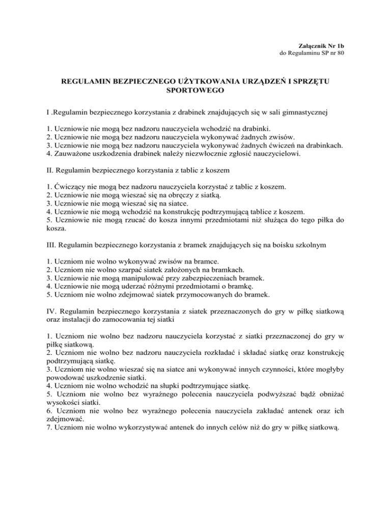 Załącznik Nr 1b do Regulaminu SP nr 80 REGULAMIN BEZPIECZNEGO UŻYTKOWANIA URZĄDZEŃ I SPRZĘTU SPORTOWEGO I .Regulamin bezpiecznego korzystania z drabinek znajdujących się w sali gimnastycznej 1. Uczniowie nie mogą bez nadzoru nauczyciela wchodzić na drabinki. 2. Uczniowie nie mogą bez nadzoru nauczyciela wykonywać żadnych zwisów. 3. Uczniowie nie mogą bez nadzoru nauczyciela wykonywać żadnych ćwiczeń na drabinkach. 4. Zauważone uszkodzenia drabinek należy niezwłocznie zgłosić nauczycielowi. II. Regulamin bezpiecznego korzystania z tablic z koszem 1. Ćwiczący nie mogą bez nadzoru nauczyciela korzystać z tablic z koszem. 2. Uczniowie nie mogą wieszać się na obręczy z siatką. 3. Uczniowie nie mogą wieszać się na siatce. 4. Uczniowie nie mogą wchodzić na konstrukcję podtrzymującą tablice z koszem. 5. Uczniowie nie mogą rzucać do kosza innymi przedmiotami niż służąca do tego piłka do kosza. III. Regulamin bezpiecznego korzystania z bramek znajdujących się na boisku szkolnym 1. Uczniom nie wolno wykonywać zwisów na bramce. 2. Uczniom nie wolno szarpać siatek założonych na bramkach. 3. Uczniowie nie mogą manipulować przy zabezpieczeniach bramek. 4. Uczniowie nie mogą uderzać różnymi przedmiotami o bramkę. 5. Uczniom nie wolno zdejmować siatek przymocowanych do bramek. IV. Regulamin bezpiecznego korzystania z siatek przeznaczonych do gry w piłkę siatkową oraz instalacji do zamocowania tej siatki 1. Uczniom nie wolno bez nadzoru nauczyciela korzystać z siatki przeznaczonej do gry w piłkę siatkową. 2. Uczniom nie wolno bez nadzoru nauczyciela rozkładać i składać siatkę oraz konstrukcję podtrzymującą siatkę. 3. Uczniom nie wolno wieszać się na siatce ani wykonywać innych czynności, które mogłyby powodować uszkodzenie siatki. 4. Uczniom nie wolno wchodzić na słupki podtrzymujące siatkę. 5. Uczniom nie wolno bez wyraźnego polecenia nauczyciela podwyższać bądź obniżać wysokości siatki. 6. Uczniom nie wolno bez wyraźnego polecenia nauczyciela zakładać antenek oraz ich zdejmować. 7. Uczniom nie wolno wykorzystywać antenek do innych celów niż do gry w piłkę siatkową. V. Regulamin bezpiecznego korzystania ze stołów tenisowych i sprzętu do tego przeznaczonego 1. Uczniom nie wolno bez nadzoru nauczyciela rozkładać oraz składać stołów tenisowych. 2. Uczniom nie wolno opierać się o stoły, wchodzić na nie i pod nie. 3. Uczniom nie wolno uderzać o stół rakietkami oraz innymi przedmiotami. 4. Uczniom nie wolno używać do gry innych przedmiotów niż sprzęt do tego przeznaczony. 5. Uczniom nie wolno bez wyraźnego polecenia nauczyciela montować siatek do gry w tenisa stołowego. VI. Regulamin bezpiecznego korzystania z kozła gimnastycznego 1. Uczniom nie wolno bez nadzoru nauczyciela korzystać z kozła gimnastycznego. 2. Uczniom nie wolno bez wyraźnego polecenia nauczyciela, podwyższać oraz obniżać wysokości kozła. 3. Uczniom nie wolno bez nadzoru nauczyciela wchodzić i wskakiwać na kozła oraz go przeskakiwać. 4. Uczniom nie wolno bez wyraźnego polecenia nauczyciela przenosić kozła w inne miejsce niż do tego przeznaczone. 5. Nauczyciel dokonuje kontroli stabilności sprzętu przed i po każdym ćwiczeniu. VII. Regulamin bezpiecznego korzystania ze skrzyni 1. Uczniom nie wolno bez nadzoru nauczyciela korzystać ze skrzyni. 2. Uczniom nie wolno rozkładać oraz składać skrzyni bez wyraźnego polecenia nauczyciela. 3. Uczniom nie wolno bez nadzoru nauczyciela wchodzić oraz wskakiwać na skrzynię. 4. Uczniom nie wolno bez asekuracji nauczyciela wykonywać żadnych ćwiczeń na skrzyni. 5. Uczniom nie wolno bez wyraźnego polecenia przenosić skrzyni w inne miejsce niż to tego wyznaczone. 6. Nauczyciel dokonuje kontroli stabilności sprzętu przed i po każdym ćwiczeniu. VIII. Regulamin bezpiecznego korzystania ze sprzętu przeznaczonego do gry w unihokeja 1. Uczniom nie wolno bez nadzoru nauczyciela korzystać ze sprzętu do gry w unihokeja. 2. Uczniom nie wolno bez nadzoru nauczyciela wynosić, rozkładać oraz składać sprzętu do gry. 3. Uczniom nie wolno kopać bramek, szarpać oraz zdejmować siatek zamocowanych na bramkach. 4. Uczniom nie wolno bez wyraźnego polecania nauczyciela przenosić oraz przesuwać bramek na inne miejsca niż do tego wyznaczone. 5. Uczniom nie wolno podnosić bramek do góry oraz nimi rzucać. 6. Uczniowie mają obowiązek wykorzystywać kije zgodnie z ich przeznaczeniem. 7. Uczniom nie wolno korzystać z piłeczki lub krążka do gry w inny sposób niż jest do tego przeznaczony. IX. Regulamin bezpiecznego korzystania z piłek (koszykowych, siatkowych, nożnych, lekarskich, do gry w piłkę ręczną) 1. Uczniom nie wolno bez nadzoru nauczyciela korzystać z piłek przeznaczonych do gier zespołowych. 2. Uczniom nie wolno bez wyraźnego polecenia nauczyciela wynosić piłek z magazynku sportowego. 3. Uczniom nie wolno korzystać z piłek w inny sposób niż wymaga ich przeznaczenie. X. Regulamin bezpiecznego korzystania z odskoczni i równoważni 1. Uczniom nie wolno bez nadzoru nauczyciela korzystać z odskoczni i równoważni. 2. Uczniom nie wolno zmieniać położenia odskoczni i równoważni. XI. Regulamin bezpiecznego korzystania z płotków 1. Uczniom nie wolno bez nadzoru nauczyciela korzystać z płotków. 2. Uczniom nie wolno bez wyraźnego polecenia nauczyciela podwyższać oraz obniżać wysokości płotków. 3. Uczniom nie wolno bez nadzoru nauczyciela wchodzić i wskakiwać na płotki oraz je przeskakiwać. 4. Uczniom nie wolno bez polecenia nauczyciela przechodzić pod i nad płotkiem. 5. Uczniom nie wolni bez wyraźnego polecenia nauczyciela przenosić sprzętu w inne miejsce niż do tego przeznaczone. XII .Regulamin bezpiecznego korzystania z drążka gimnastycznego 1. Uczniowie nie mogą bez nadzoru nauczyciela wykonywać żadnych zwisów. 2. Uczniowie nie mogą bez nadzoru nauczyciela wykonywać żadnych ćwiczeń na dr