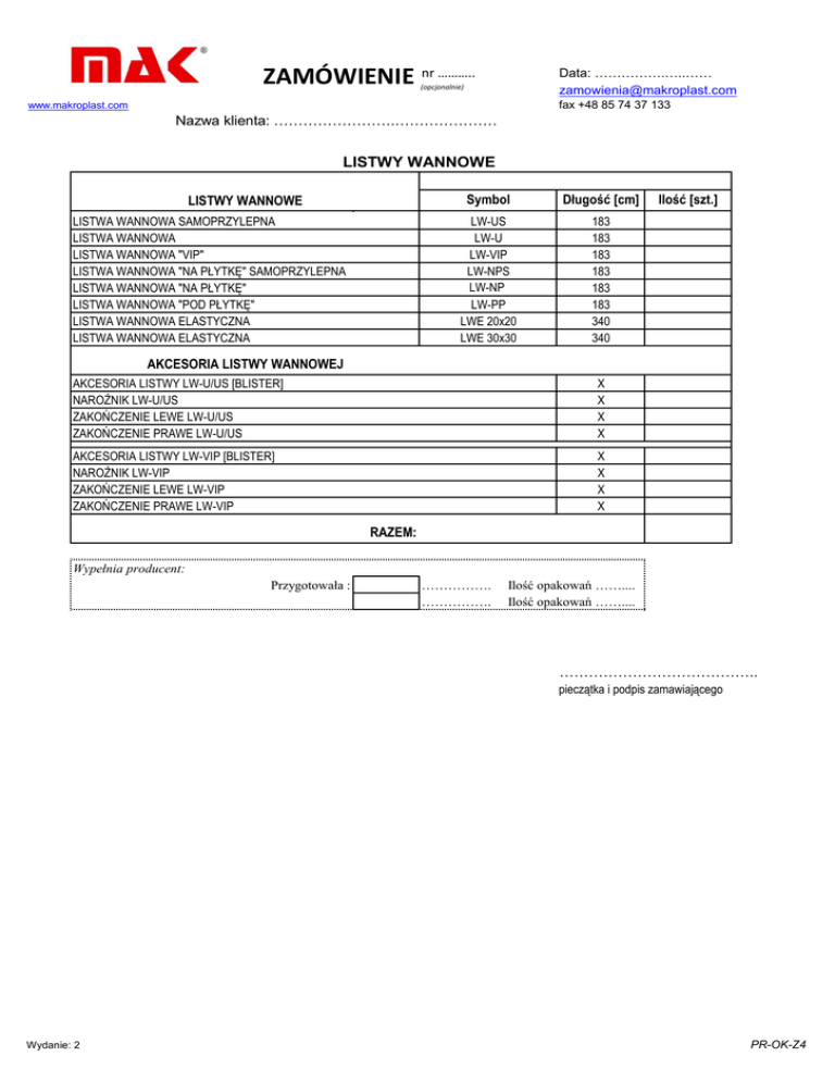 ZAMÓWIENIE nr ……….. Data: …………….…..…… [email protected] (opcjonalnie) fax +48 85 74 37 133 www.makroplast.com Nazwa klienta: …………………….………………… LISTWY WANNOWE LISTWY WANNOWE LISTWA WANNOWA SAMOPRZYLEPNA LISTWA WANNOWA LISTWA WANNOWA "VIP" LISTWA WANNOWA "NA PŁYTKĘ" SAMOPRZYLEPNA LISTWA WANNOWA "NA PŁYTKĘ" LISTWA WANNOWA "POD PŁYTKĘ" LISTWA WANNOWA ELASTYCZNA LISTWA WANNOWA ELASTYCZNA Symbol Długość [cm] LW-US LW-U LW-VIP LW-NPS LW-NP. LW-PP LWE 20x20 LWE 30x30 183 183 183 183 183 183 340 340 Ilość [szt.] AKCESORIA LISTWY WANNOWEJ AKCESORIA LISTWY LW-U/US [BLISTER] NAROŻNIK LW-U/US ZAKOŃCZENIE LEWE LW-U/US ZAKOŃCZENIE PRAWE LW-U/US X X X X AKCESORIA LISTWY LW-VIP [BLISTER] NAROŻNIK LW-VIP ZAKOŃCZENIE LEWE LW-VIP ZAKOŃCZENIE PRAWE LW-VIP X X X X RAZEM: Wypełnia producent: Przygotowała : ……………. ……………. Ilość opakowań …….... Ilość opakowań …….... ………………………………….. pieczątka i podpis zamawiającego Wydanie: 2 PR-OK-Z4