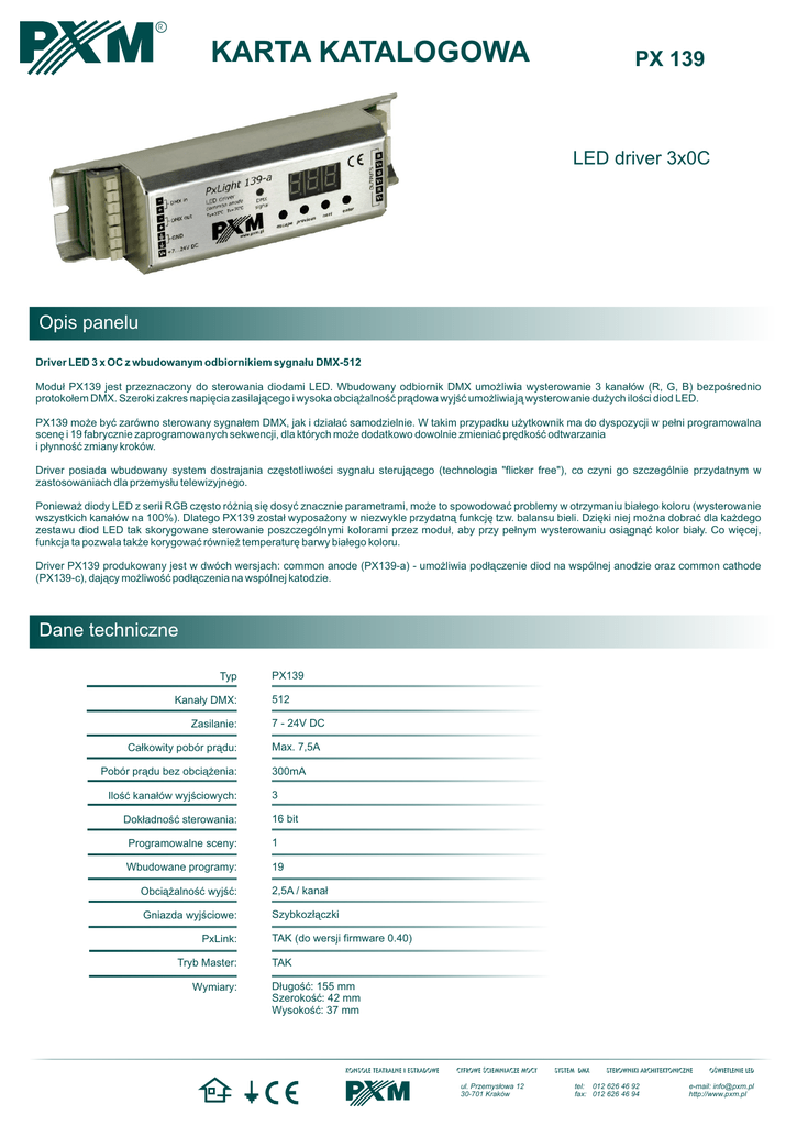 R KARTA KATALOGOWA PX 139 LED driver 3x0C Opis panelu Driver LED 3 x OC z wbudowanym odbiornikiem sygnału DMX-512 Moduł PX139 jest przeznaczony do sterowania diodami LED. Wbudowany odbiornik DMX umożliwia wysterowanie 3 kanałów (R, G, B) bezpośrednio protokołem DMX. Szeroki zakres napięcia zasilającego i wysoka obciążalność prądowa wyjść umożliwiają wysterowanie dużych ilości diod LED. PX139 może być zarówno sterowany sygnałem DMX, jak i działać samodzielnie. W takim przypadku użytkownik ma do dyspozycji w pełni programowalna scenę i 19 fabrycznie zaprogramowanych sekwencji, dla których może dodatkowo dowolnie zmieniać prędkość odtwarzania i płynność zmiany kroków. Driver posiada wbudowany system dostrajania częstotliwości sygnału sterującego (technologia "flicker free"), co czyni go szczególnie przydatnym w zastosowaniach dla przemysłu telewizyjnego. Ponieważ diody LED z serii RGB często różnią się dosyć znacznie parametrami, może to spowodować problemy w otrzymaniu białego koloru (wysterowanie wszystkich kanałów na 100%). Dlatego PX139 został wyposażony w niezwykle przydatną funkcję tzw. balansu bieli. Dzięki niej można dobrać dla każdego zestawu diod LED tak skorygowane sterowanie poszczególnymi kolorami przez moduł, aby przy pełnym wysterowaniu osiągnąć kolor biały. Co więcej, funkcja ta pozwala także korygować również temperaturę barwy białego koloru. Driver PX139 produkowany jest w dwóch wersjach: common anode (PX139-a) - umożliwia podłączenie diod na wspólnej anodzie oraz common cathode (PX139-c), dający możliwość podłączenia na wspólnej katodzie. Dane techniczne Typ Kanały DMX: Zasilanie: Całkowity pobór prądu: Pobór prądu bez obciążenia: Ilość kanałów wyjściowych: Dokładność sterowania: PX139 512 7 - 24V DC Max. 7,5A 300mA 3 16 bit Programowalne sceny: 1 Wbudowane programy: 19 Obciążalność wyjść: 2,5A / kanał Gniazda wyjściowe: Szybkozłączki PxLink: Tryb Master: Wymiary: TAK (do wersji firmware 0.40) TAK Długość: 155 mm Szerokość: 42 mm Wysokość: 37 mm Konsole teatralne i estradowE Cyfrowe ściemniacze mocy ul. Przemysłowa 12 30-701 Kraków SYSTEM dmx Sterowniki ARCHITEKTONICZNE tel: 012 626 46 92 fax: 012 626 46 94 OŚWIETLENIE LED e-mail: [email protected] http://www.pxm.pl R PX 139 Schemat podłączenia Podłączenie 6-przewodowe sterownik DMX B PX015 zasilacz 24V DC masa 1 DMX+ DMX- 2 3 4 5 6 Chaser Scene V+ G % 100 90 80 V+ R 70 60 50 Music Speed 100 % 40 30 90 20 80 V+ 70 10 60 Master 0 50 40 30 20 10 0 1 W 2 3 4 5 6 Club 6p 24V układ stabilizujący prąd (np. rezystor) PxLight 139-a B LED driver 3 x OC output V+ G common anode V+ R diody LED niebieskie diody LED zielone V+ diody LED czerwone PxLight 139-a B LED driver 3 x OC output V+ G common anode V+ R lampa RGB przystosowana do sterowania PWM V+ do kolejnych modułów B V+ G Podłączenie 4-przewodowe PxLight 139 B LED driver 3 x OC output V+ G common anode V+ R V+ R V+ wyjścia V+ są wewnętrznie zwarte V+ wspólna anoda PxLight 139-c B B LED driver 3 x OC output G G common cathode R R wspólna katoda PxLight 139-c B LED driver 3 x OC output G 42 mm Rysunek techniczny common cathode 37 mm R 155 mm Konsole teatralne i estradowE Cyfrowe ściemniacze mocy ul. Przemysłowa 12 30-701 Kraków SYSTEM dmx Sterowniki ARCHITEKTONICZNE tel: 012 626 46 92 fax: 012 626 46 94 OŚWIETLENIE LED e-mail: [email protected] http://www.pxm.pl