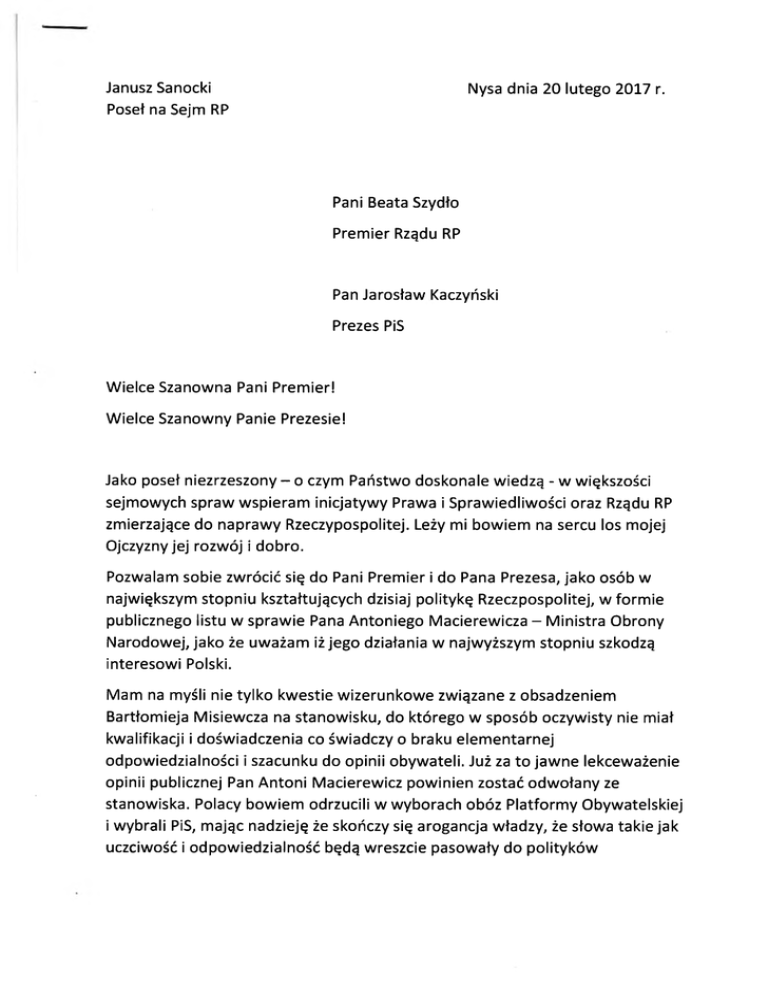 Janusz Sanocki Poseł na Sejm RP Nysa dnia 20 lutego 2017 r. Pani Beata Szydło Premier Rządu RP Pan Jarosław Kaczyński Prezes PiS Wielce Szanowna Pani Premier! Wielce Szanowny Panie Prezesie! Jako poseł niezrzeszony - o czym Państwo doskonale wiedzą - w większości sejmowych spraw wspieram inicjatywy Prawa i Sprawiedliwości oraz Rządu RP zmierzające do naprawy Rzeczypospolitej. Leży mi bowiem na sercu los mojej Ojczyzny jej rozwój i dobro. Pozwalam sobie zwrócić się do Pani Premier i do Pana Prezesa, jako osób w największym stopniu kształtujących dzisiaj politykę Rzeczpospolitej, w formie publicznego listu w sprawie Pana Antoniego Macierewicza - Ministra Obrony Narodowej, jako że uważam iż jego działania w najwyższym stopniu szkodzą interesowi Polski. Mam na myśli nie tylko kwestie wizerunkowe związane z obsadzeniem Bartłomieja Misiewcza na stanowisku, do którego w sposób oczywisty nie miał kwalifikacji i doświadczenia co świadczy o braku elementarnej odpowiedzialności i szacunku do opinii obywateli. Już za to jawne lekceważenie opinii publicznej Pan Antoni Macierewicz powinien zostać odwołany ze stanowiska. Polacy bowiem odrzucili w wyborach obóz Platformy Obywatelskiej i wybrali PiS, mając nadzieję że skończy się arogancja władzy, że słowa takie jak uczciwość i odpowiedzialność będą wreszcie pasowały do polityków występujących z Białym Orłem na piersi. Nie chodziło przecież o zamianę jednej ekipy na inną. Jednak niestety nie tylko kwestie wizerunkowe w polityce Pana Ministra Macierewicza dyskwalifikują go do pełnienia tak ważnej funkcji jak minister obrony. Chodzi o jego skrajnie antyrosyjskie wypowiedzi, zwłaszcza na ostatniej konferencji w Monachium, w których - bez żadnych na to dowodów - oskarża Rosję o „zamordowanie dwóch polskich prezydentów", wymieniając katastrofę smoleńską jako jeden z etapów „rosyjskiej agresji". Twierdzenia takie - całkowicie pozbawione podstaw w faktach - wygłoszone na forum międzynarodowym, w stopniu najwyższym kompromitują ich autora, ale z nim kompromitują także Polskę nad czym nikt, komu los i pozycja naszego państwa jest droga, nie może przejść obojętnie. Co więcej nie idzie tu tylko o kompromitujący brak podstaw materialnych do wygłaszania tego typu oskarżeń wobec sąsiedniego państwa, z którym relacje mają ogromne znaczenie dla pozycji i losu Polski. Ale również o to, że ustawienie polskiej polityki dzisiaj na pozycjach skrajnie antyrosyjskich bez żadnych ku temu powodów - oprócz wymyślonych przez pana Ministra Macierewicza - prowadzi do izolacji Polski i osłabienia naszej pozycji na polu międzynarodowym, nie tylko wobec Rosji, (gdzie już narobiliśmy sobie dostatecznie dużo szkód) ale również w relacjach z innymi uczestnikami międzynarodowej globalnej gry. Każde uzależnienie osłabia bowiem pozycję negocjacyjną państwa - co jest elementarną zasadą nie tylko w polityce ale i gospodarce. Skrajna antyrosyjska polityka w jaką wpędza nas Pan Minister Macierewicz jest także uzależnieniem tym razem od państw, które mogłyby nas w tej pozycji wesprzeć i przed Rosją obronić. W ten sposób KONIECZNE staje się dla nas wzmacnianie NATO, konieczne - przyjmowanie amerykańskich żołnierzy, konieczne wspieranie Ukrainy z jej nieodpowiedzialną polityką i odradzającym się banderyzmem. Jest więc oczywiste, że takie samouzależnienie wiąże się z ogromnymi kosztami politycznymi i gospodarczymi, za które musi płacić Polska. Jest jasne, że taka polityka byłaby uzasadniona w sytuacji zagrożenia realną agresją. Ale także jest oczywiste, że obecnie takiego realnego zagrożenia ze strony Rosji nie dostrzegają w zasadzie nie tylko przywódcy państw europejskich (vide Victor Orban), ale także nowa ekipa rządząca Stanami Zjednoczonymi, która wyraźnie zmierza w kierunku zawarcia z Rosją porozumienia i utworzenia wspólnego frontu, który mógłby przeciwstawić się zagrożeniu ze strony islamskiego ekstremizmu. Nie widać także żadnych realnych podstaw do stwierdzenia iż Polsce i Europie miałaby grozić militarna agresja rosyjska. Nie wiadomo bowiem po co Rosja miałaby militarnie zajmować Tbilisi, Kijów czy Warszawę? Po doświadczeniach XX wieku, porażce cywilizacyjnej, politycznej i rozpadzie ZSRR wysuwanie takich pomysłów i straszenie Polaków „rosyjskimi czołgami" wydaje się raczej bliższe jakiejś formie paranoi, a nie ocenami kompetentnego polityka. Tak więc, agresywne wobec Rosji, wypowiedzi Ministra Macierewicza nie tylko nie mają - w mojej ocenie - żadnego związku z rzeczywistością, ale realnie szkodzą Polsce na wiele sposobów. I nie idzie tu tylko o kompromitację, ale o prowadzenie do izolacji naszego kraju i uzależnienia nas od innych uczestników globalnej gry politycznej. To - w pewnym sensie - również na skutek tej nieodpowiedzialnej polityki Ministra Macierewicza, przedstawiciele Komisji Europejskiej pozwalają sobie na publiczne łajanie naszego ministra spraw zagranicznych i wtrącanie się w nasze wewnętrzne sprawy. Jest oczywiste, że tak dalece rozbieżne z rzeczywistością wypowiedzi polityka tej miary co minister obrony Rzeczypospolitej Polskiej, w tak oczywisty sposób niosące szkodliwe konsekwencje, muszą prowadzić do pytań o jego zdolność do oceny sytuacji, albo do pytań o jego intencje. W obu przypadkach nasuwające się odpowiedzi są dla Pana Ministra Macierewicza dyskwalifikujące. Ponieważ jako poseł (i jako obywatel) mam obowiązek troszczyć się o przyszłość Ojczyzny, nie mogę nad tymi pytaniami przejść do porządku. Analiza sytuacji prowadzi bowiem do diagnozy mówiącej jednoznacznie, że Pan Minister Antoni Macierewicz szkodzi w najwyższym stopniu interesowi Polski i kompromituje nasz kraj. Uważam zatem, że zarówno Pani Premier jak i Pan Prezes jaki lider rządzącej partii powinni rozważyć pilne zdymisjonowanie go z zajmowanego s